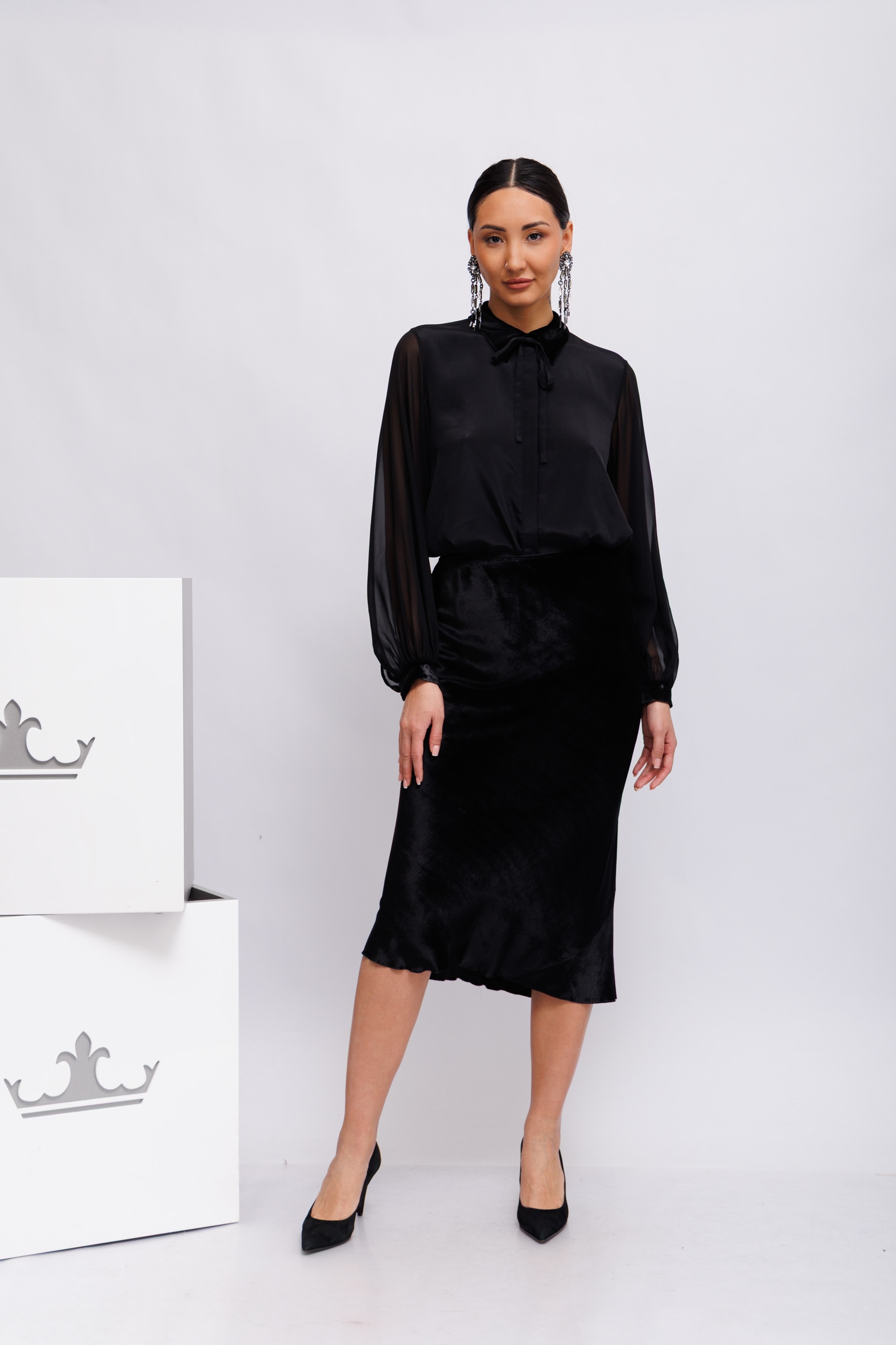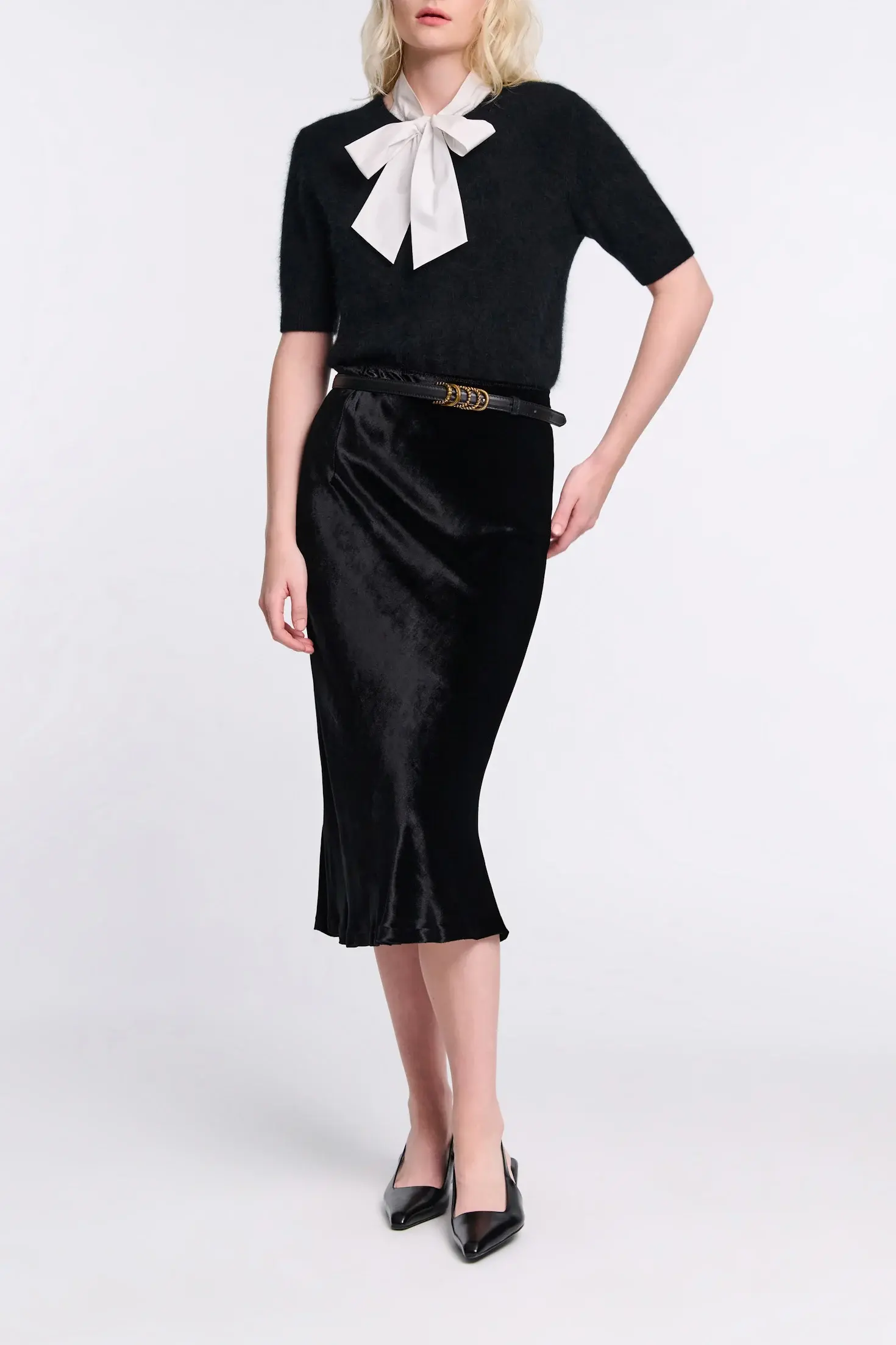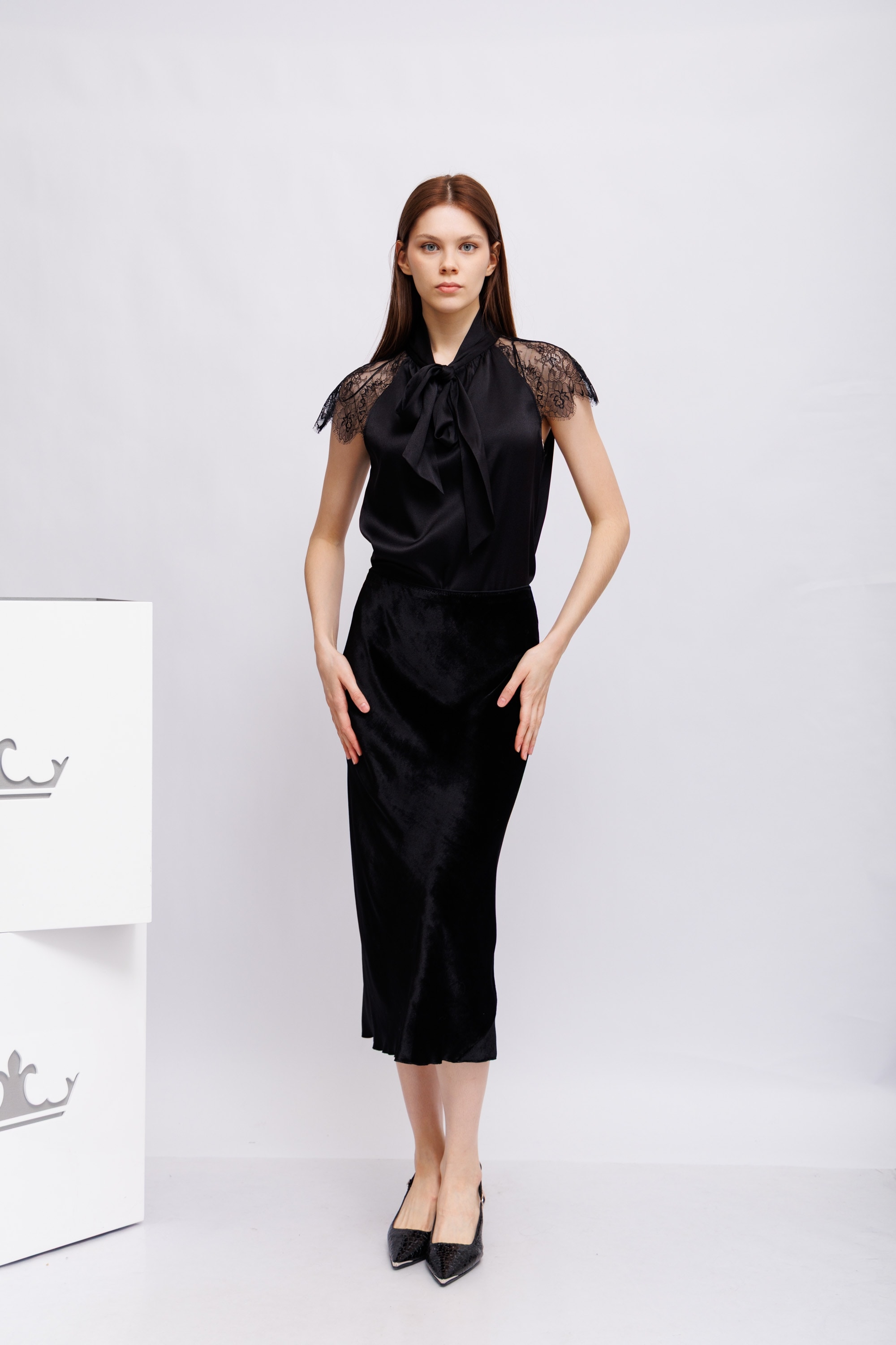 Юбка-миди косого кроя выполнена из блестящего бархата и имеет эластичный пояс. Юбку можно носить в комплекте с подходящей бархатной блузкой с воротником. Эластичный пояс