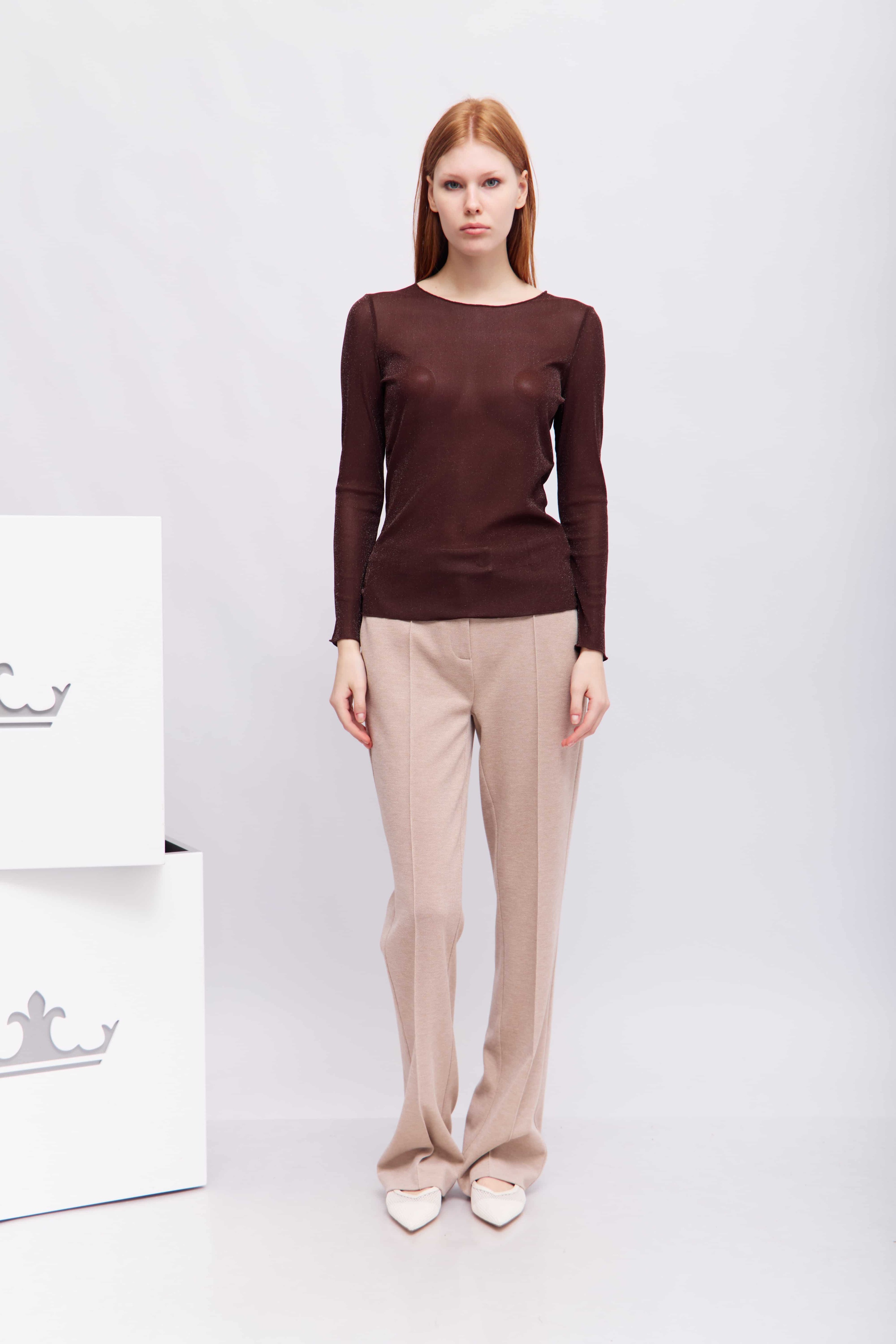 Бежевые брюки – мягкий, удобный трикотаж с тонкой текстурой. Эти брюки сочетают в себе внешний вид классических брюк с комфортом мягких спортивных штанов. Гладкая строчка и элегантный пояс на пуговицах делают их идеальными как для деловых, так и для повседневных случаев. Носите их с блузкой и каблуками для современного делового образа или со свитером и кроссовками для более расслабленного образа.