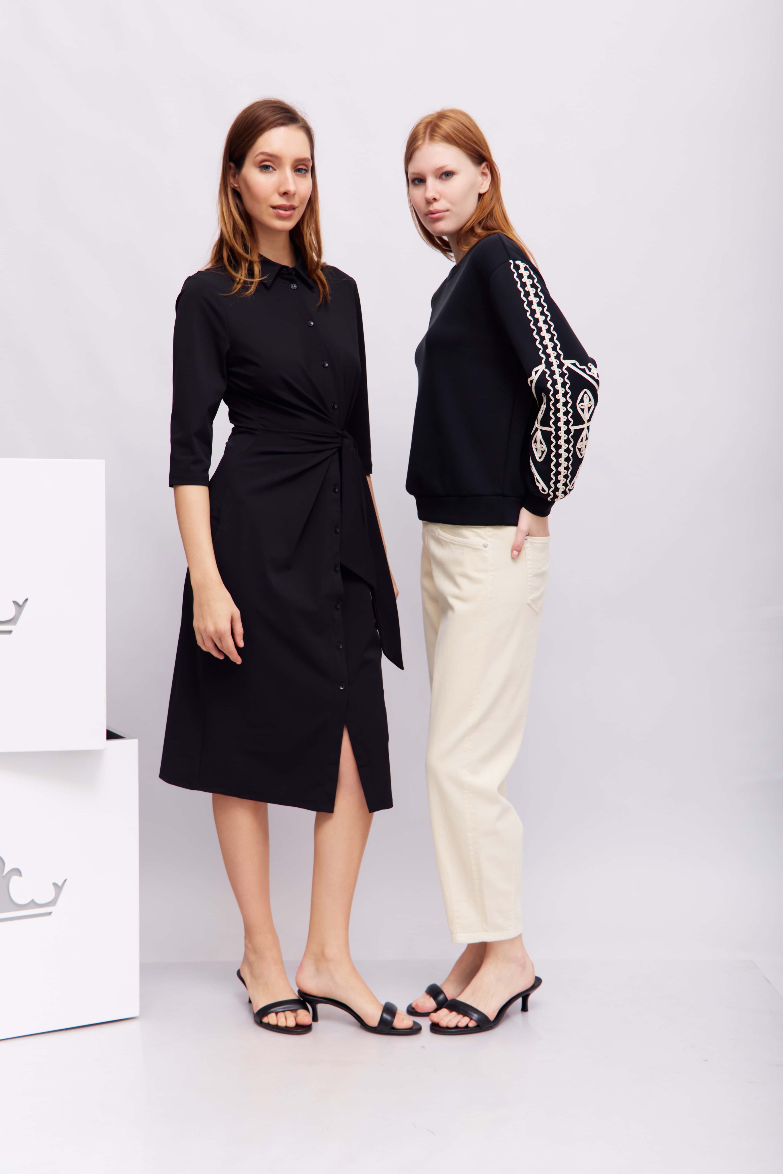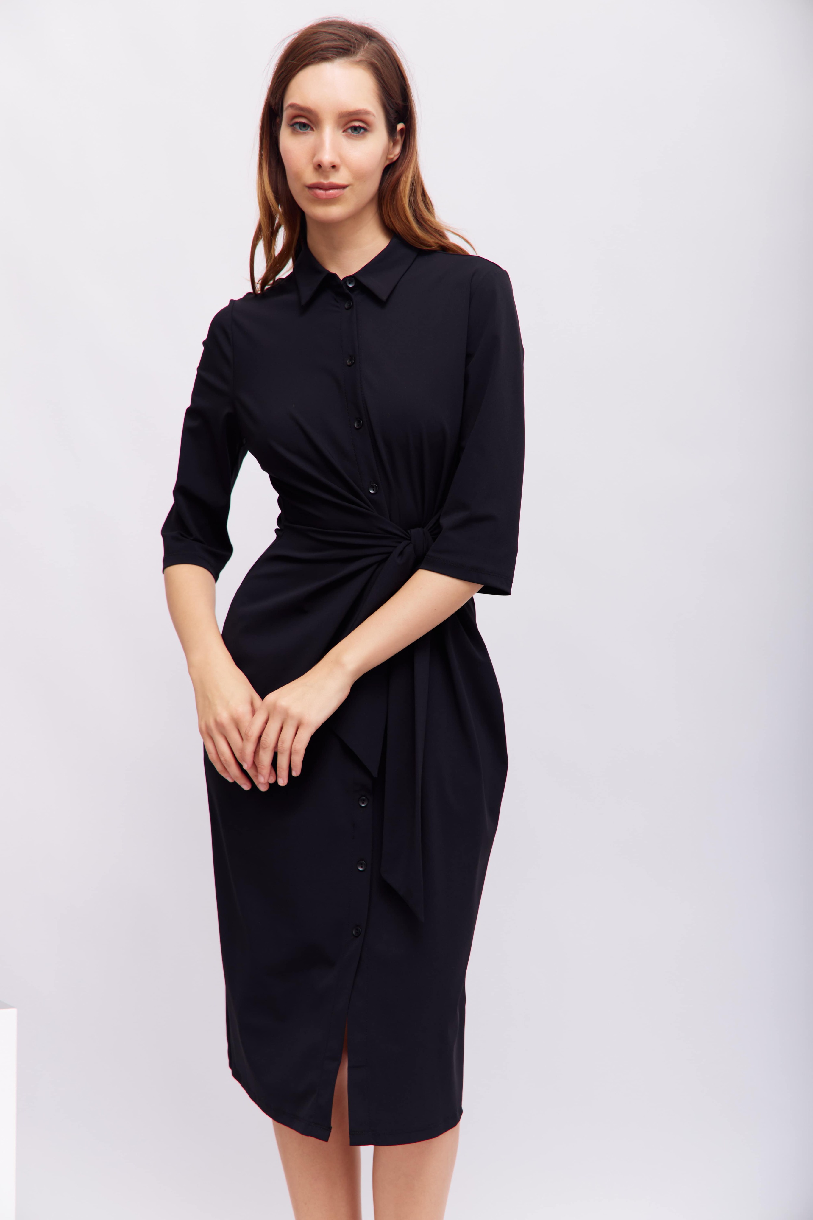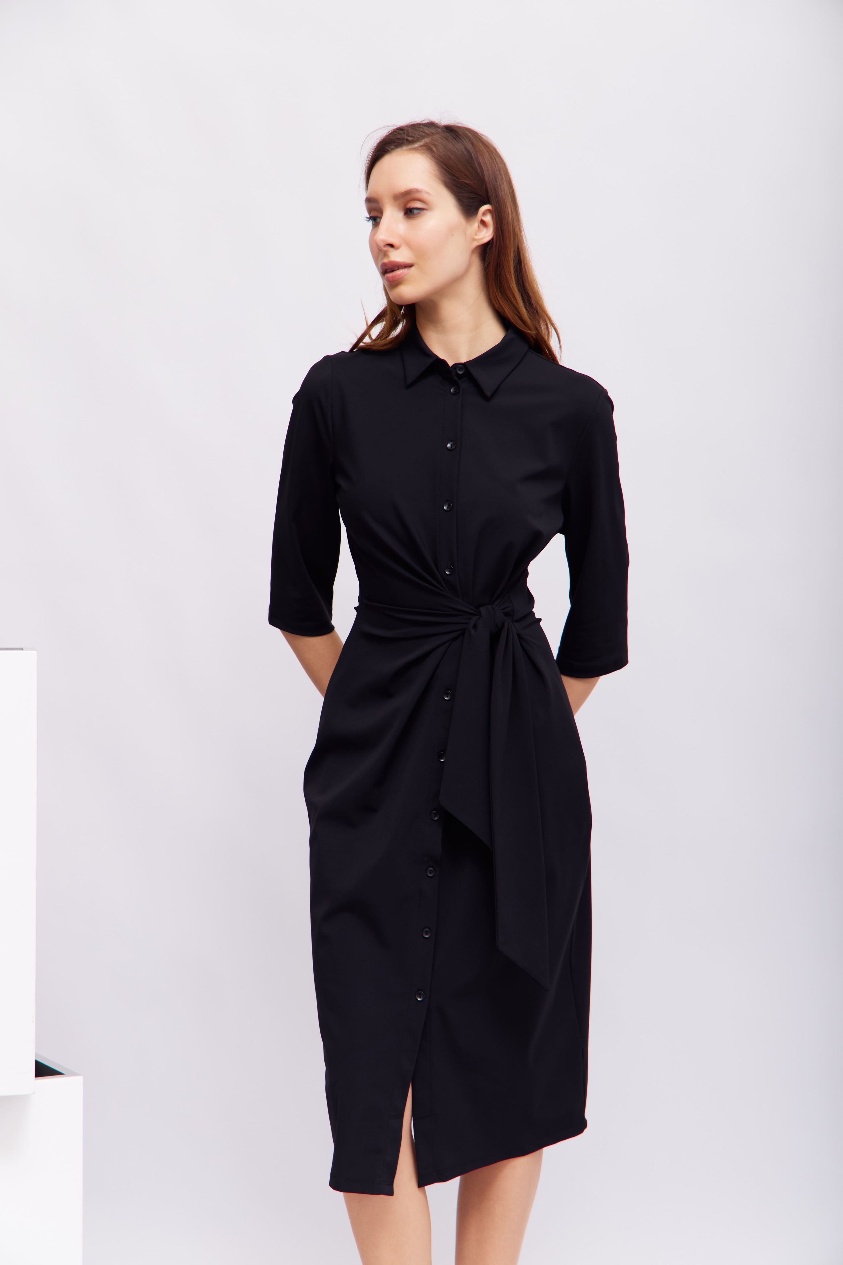 – ткань, приятная на ощупь и струящаяся, эластичная. Модель прямого кроя до колена с классическим воротником, застежкой на пуговицы и поясом, подчеркивающим талию. Рукава длиной 3/4 и едва заметные разделительные швы создают элегантный, вневременной образ. Идеально подходит как для деловых, так и для повседневных случаев.