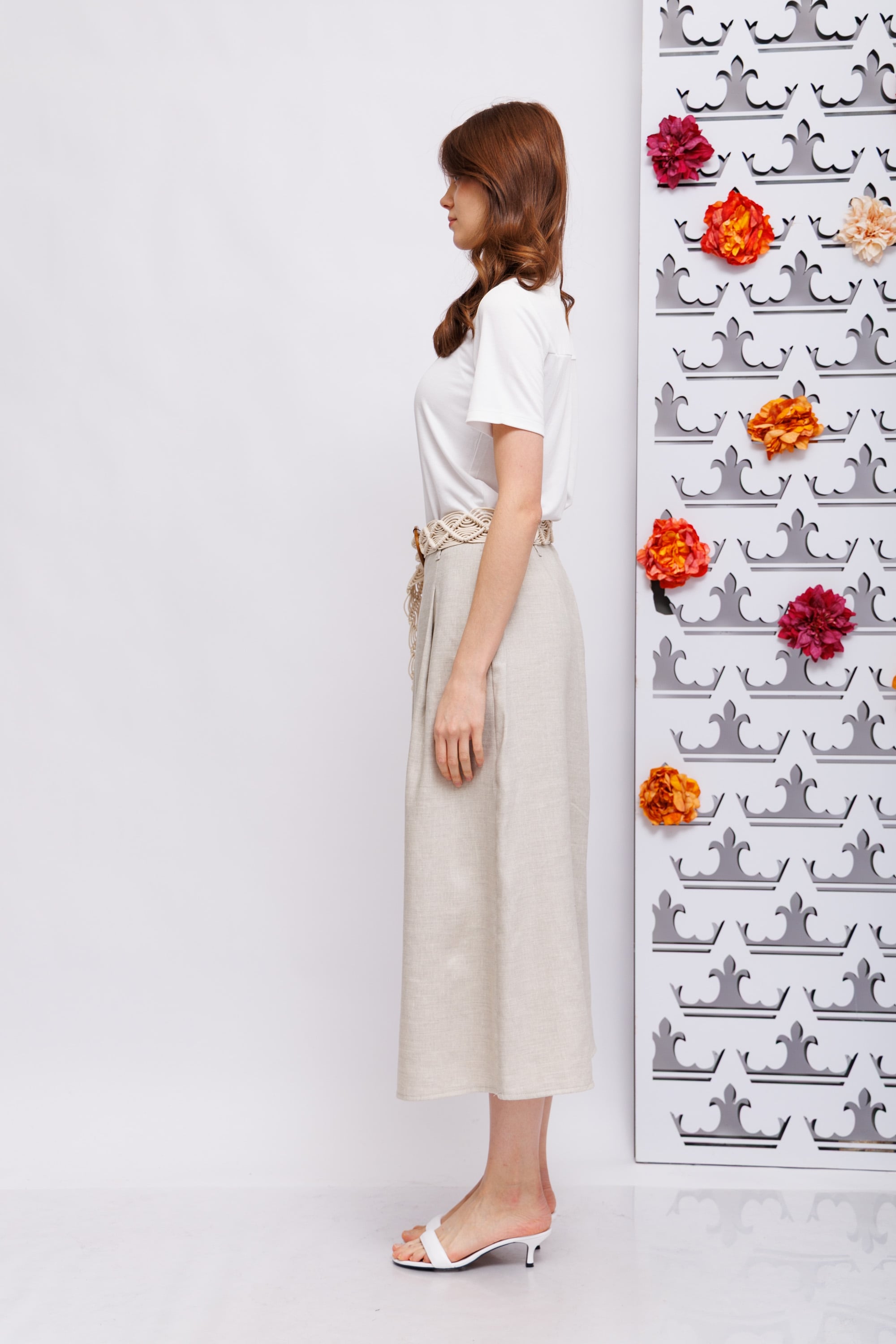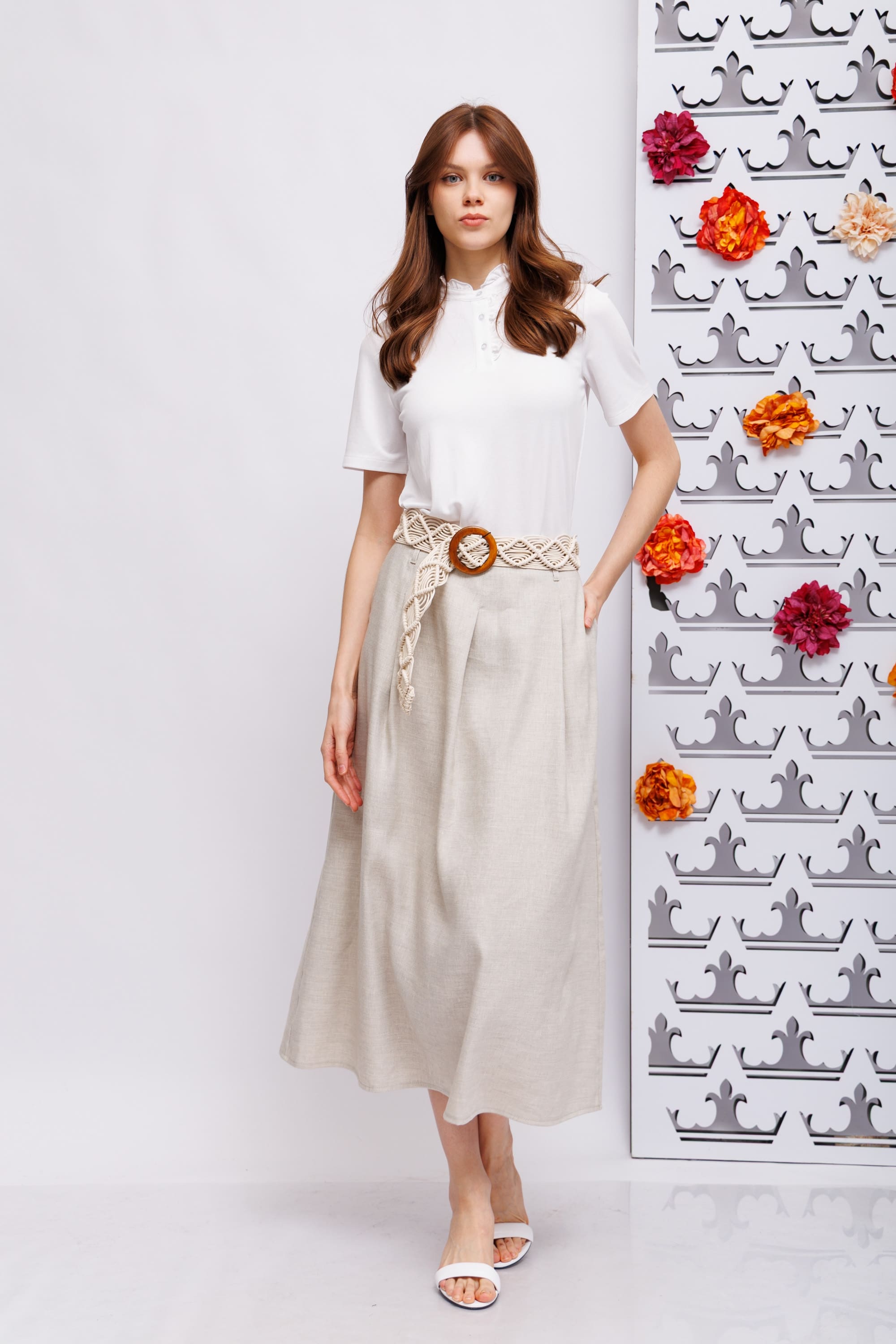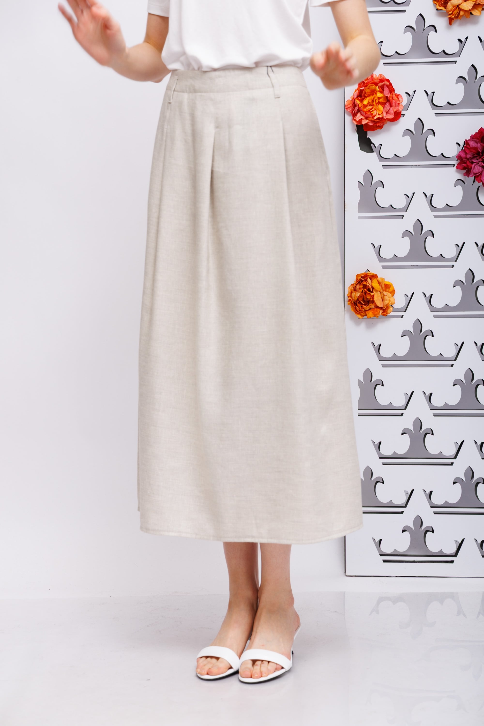 Модель NIDIN, изготовленная из смеси льна и ткани, имеет свободный А-образный силуэт с элегантными складками на поясе. Длина юбки составляет 90 см, она создает струящийся силуэт и непринужденный, но стильный образ. Легкая ткань делает ее идеальной для теплых дней и элегантных летних нарядов.