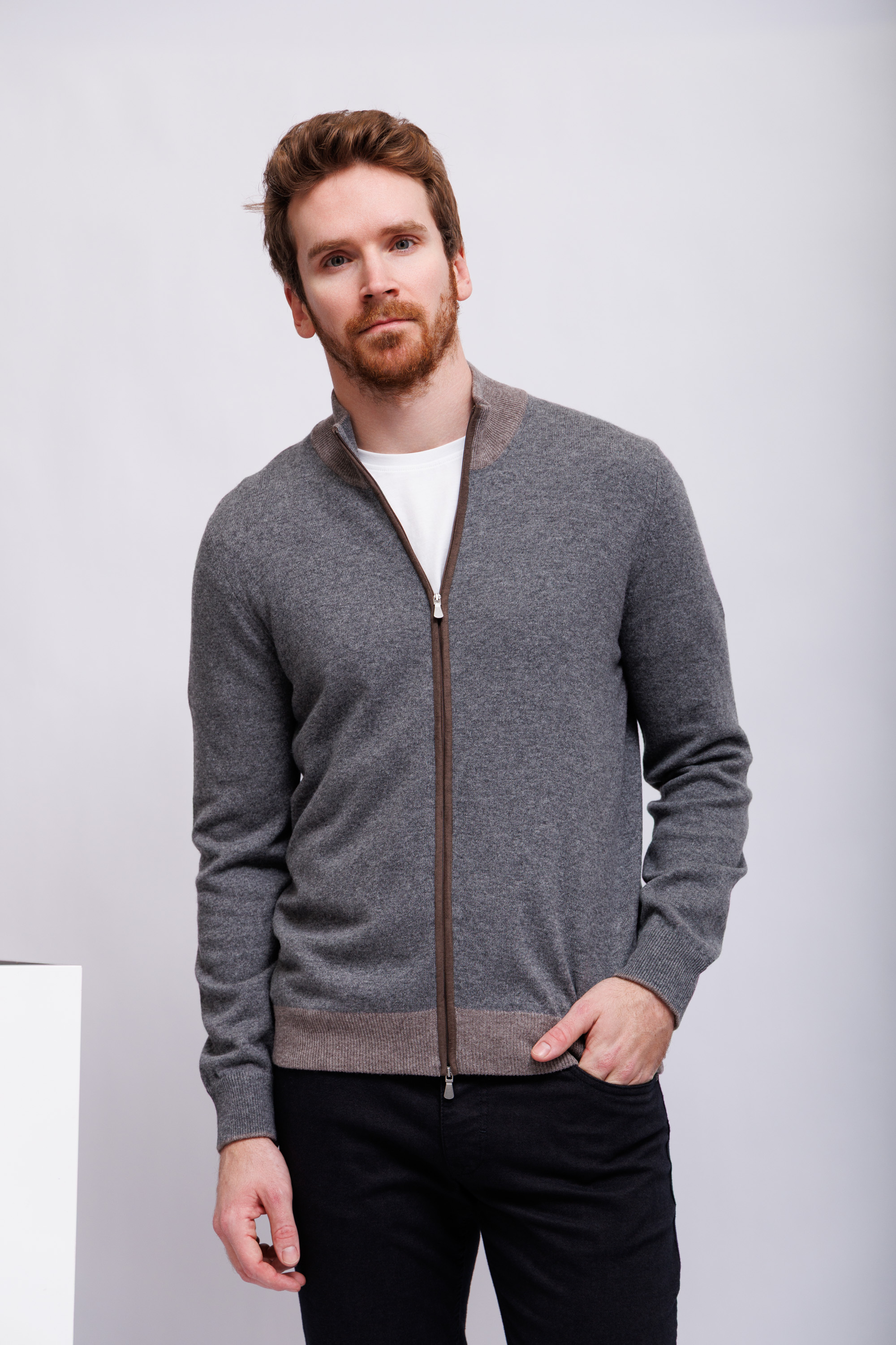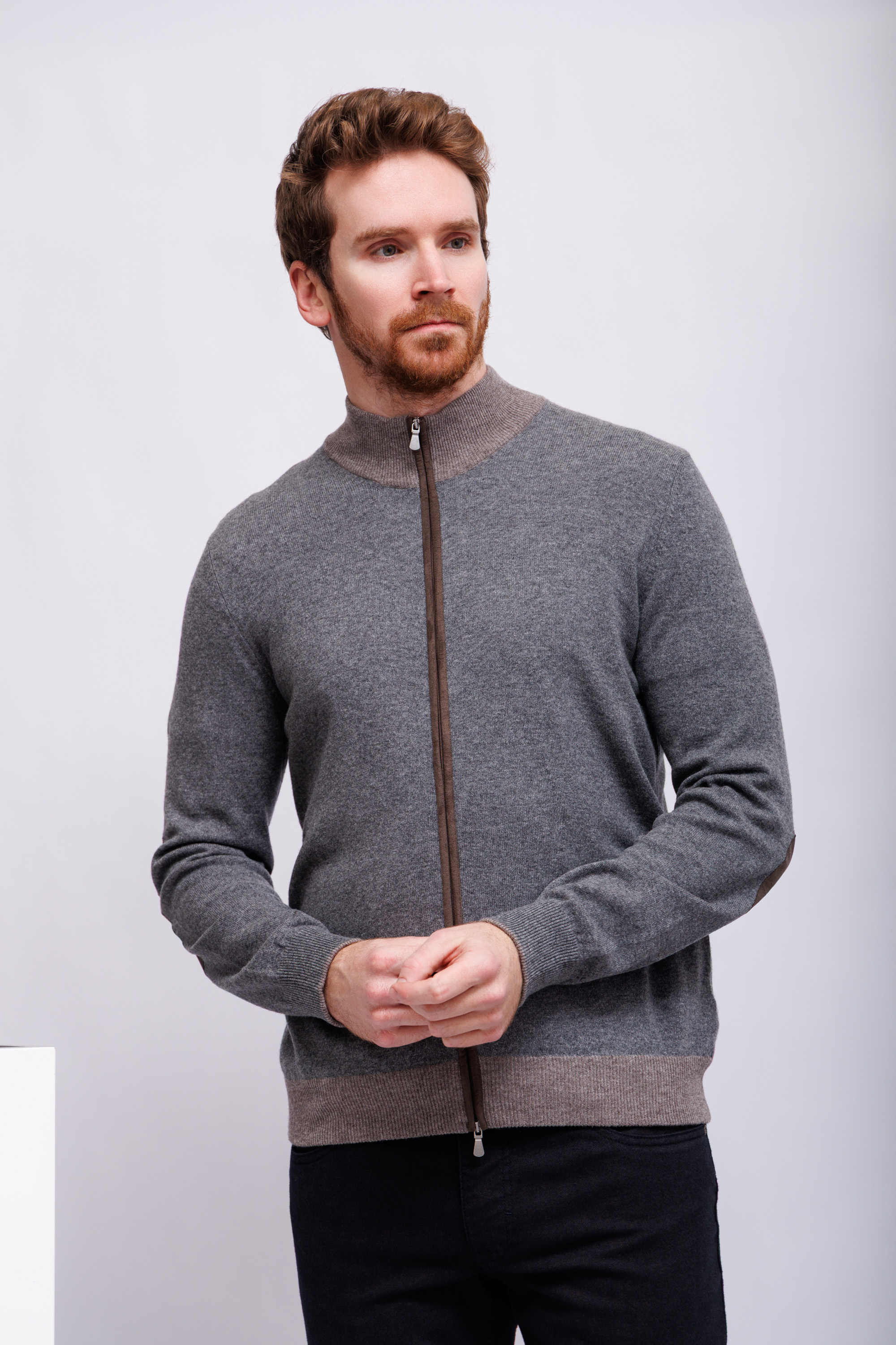 Кардиган светло-серый с эффектом меланжСветло-кофейная отделкаВорот-стойка с ребристой вязкойНа молнии Длинные рукава с контрастными налокотникамиМанжеты и низ изделия-эластичный ребристый трикотаж