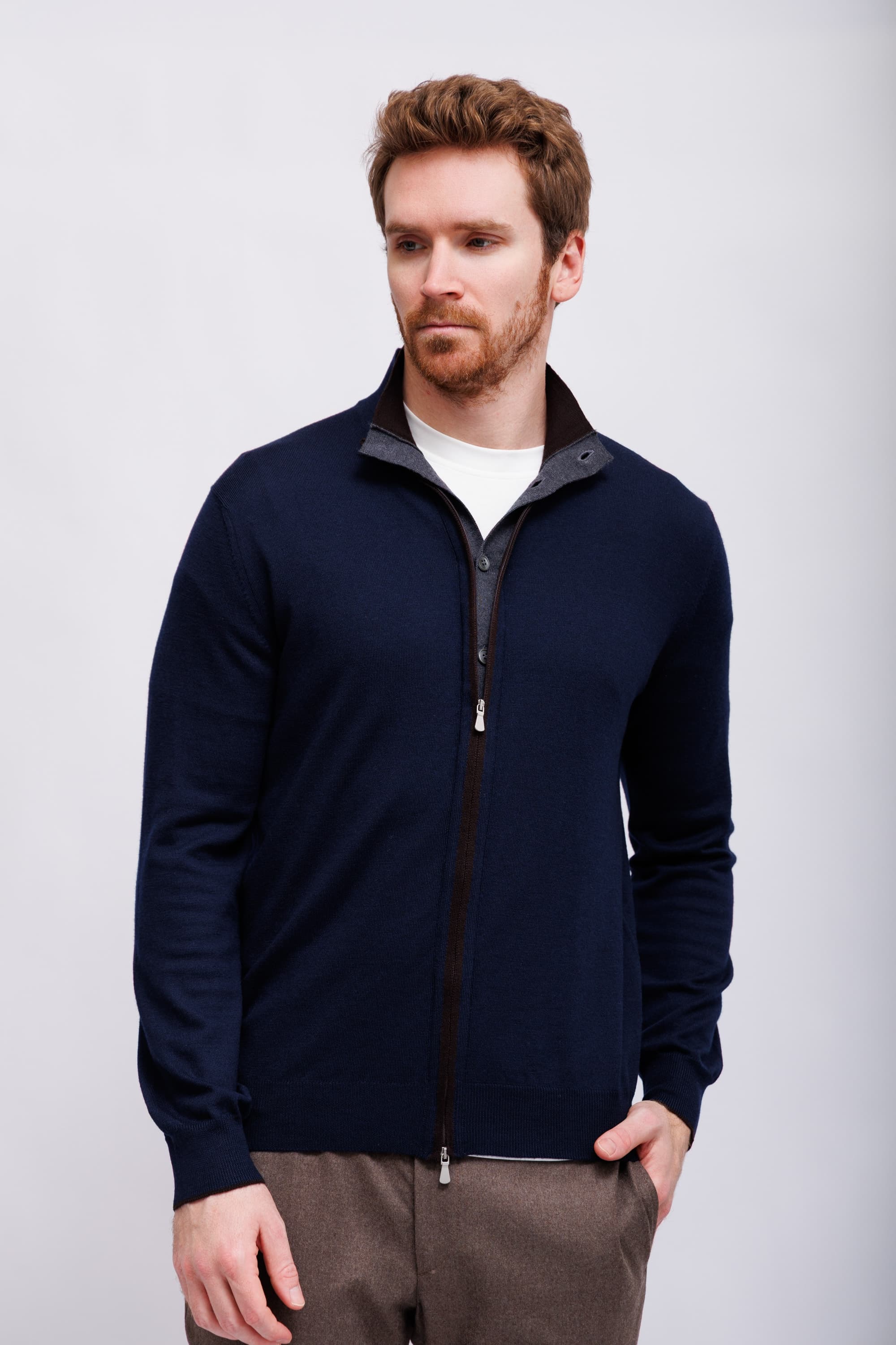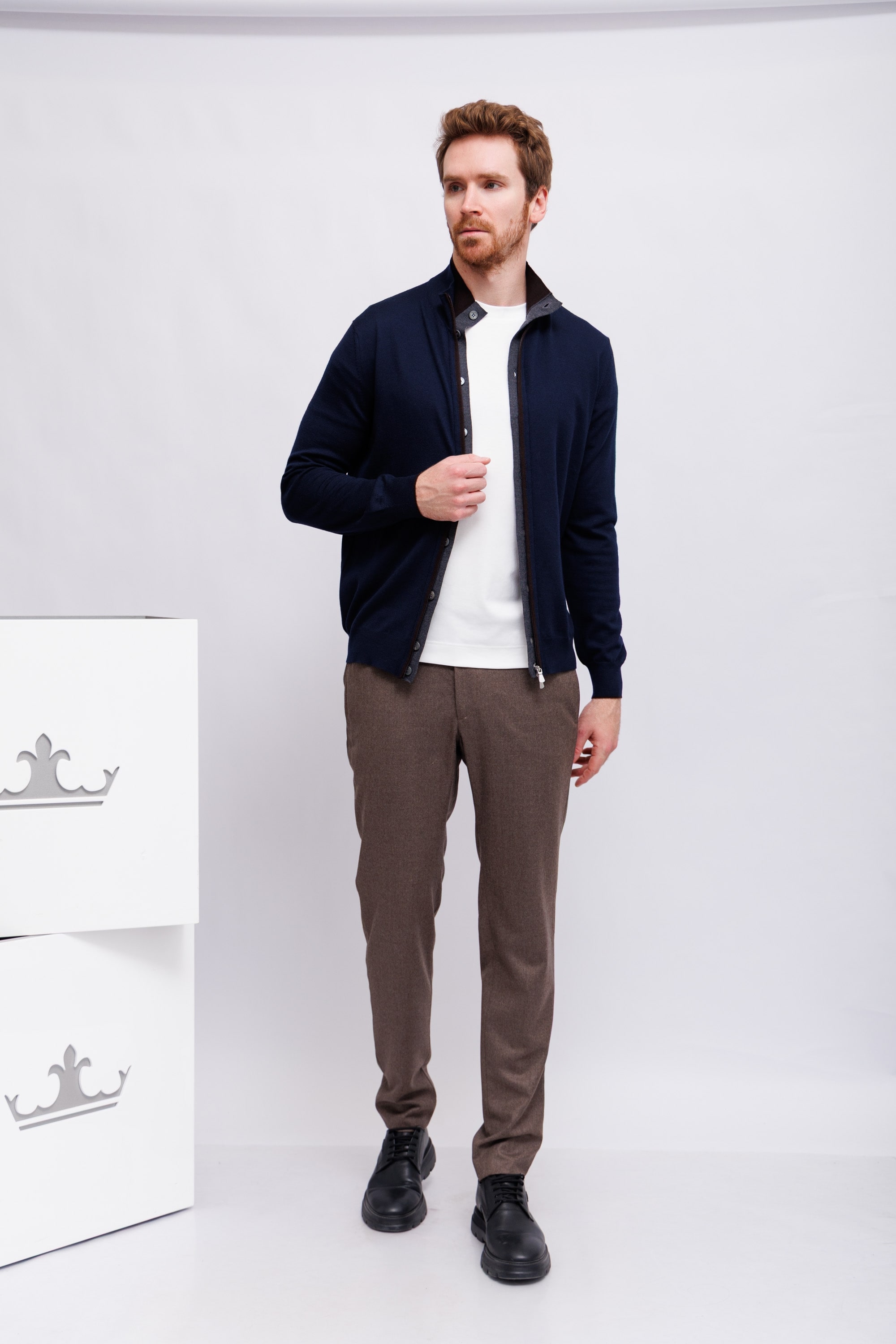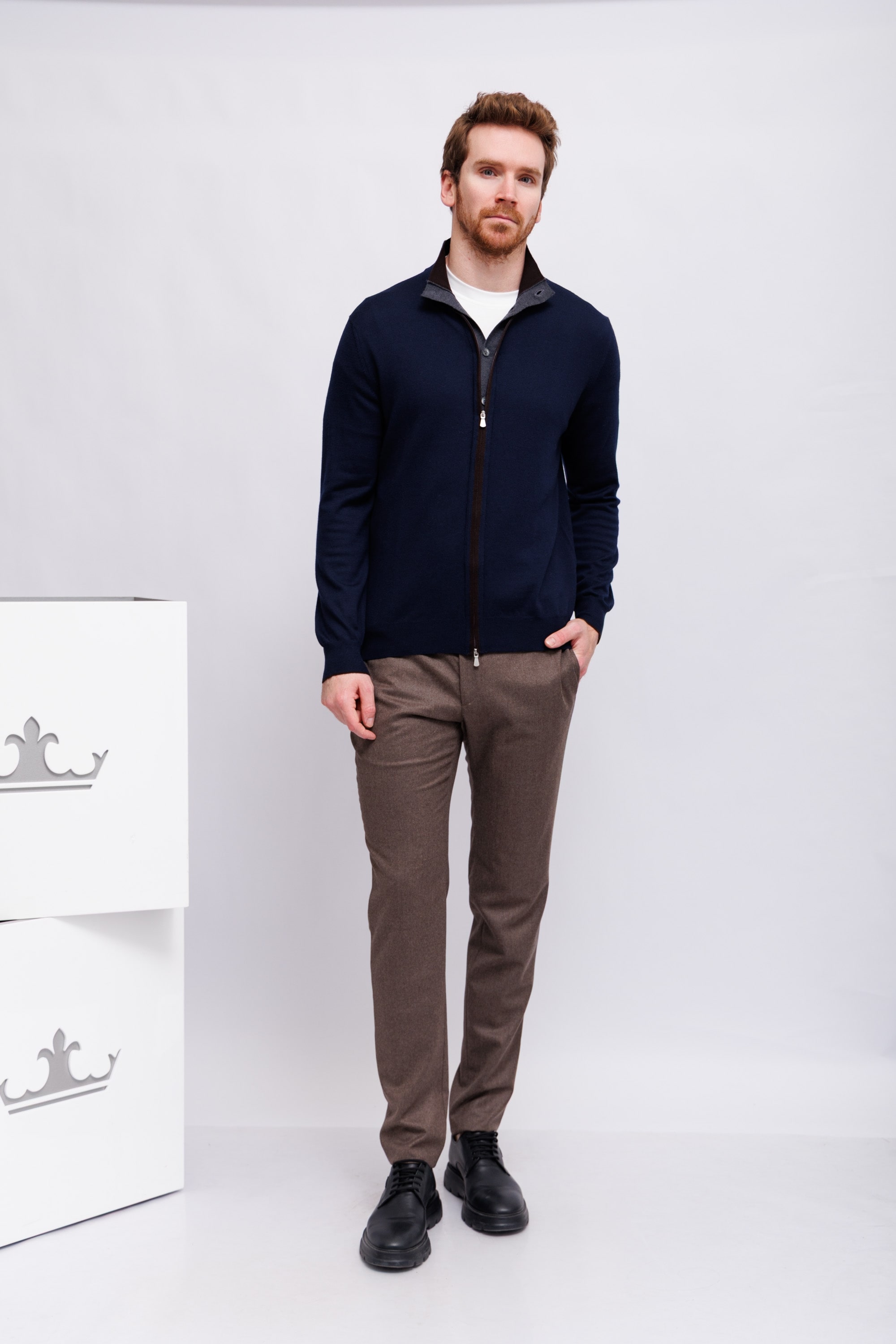 Кардиган тёмно-синийВорот-стойка с ребристой вязкойНа пуговицах и молнии с контрастной шоколадной и серой отделкойДлинные рукаваМанжеты и низ изделия-эластичный ребристый трикотаж