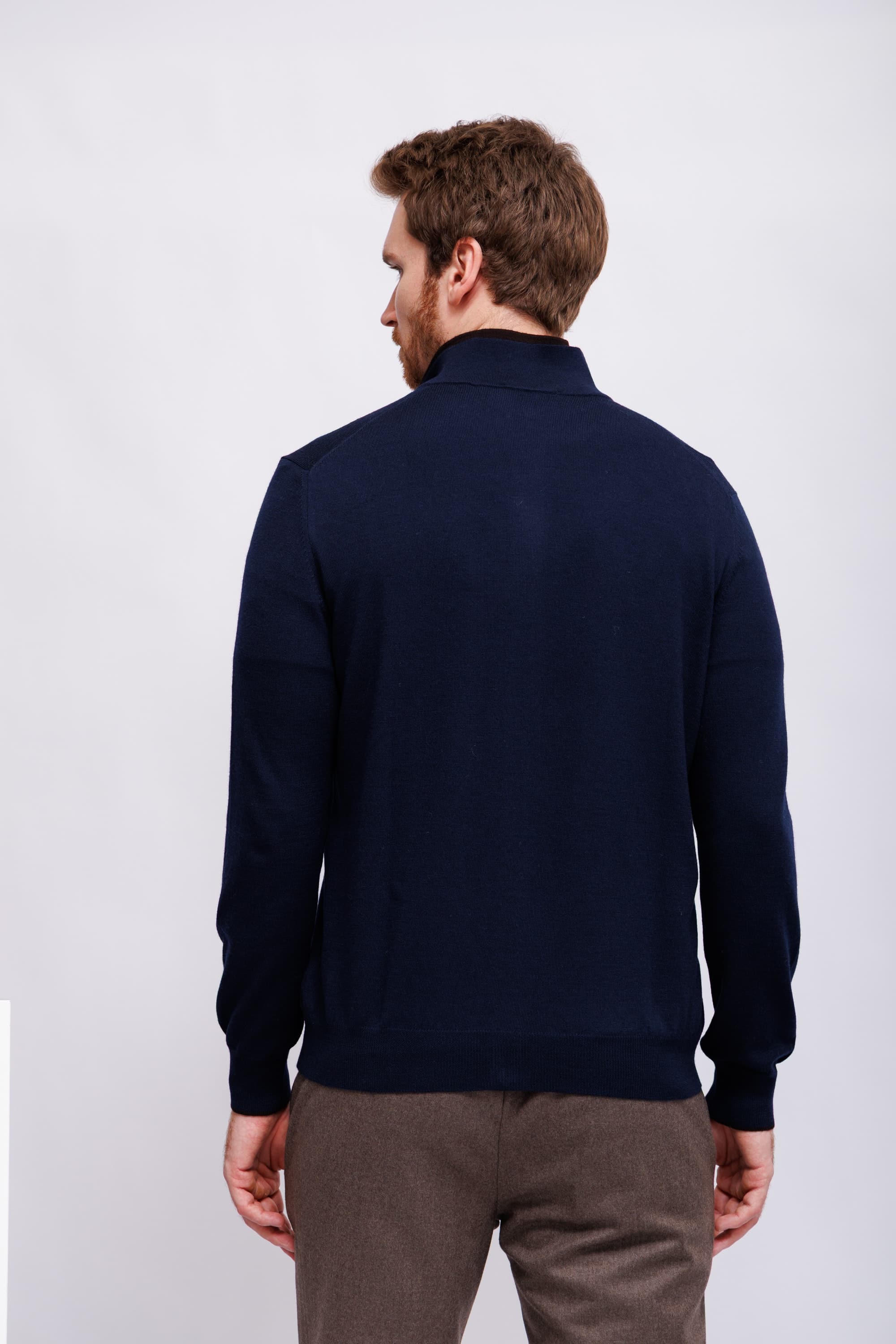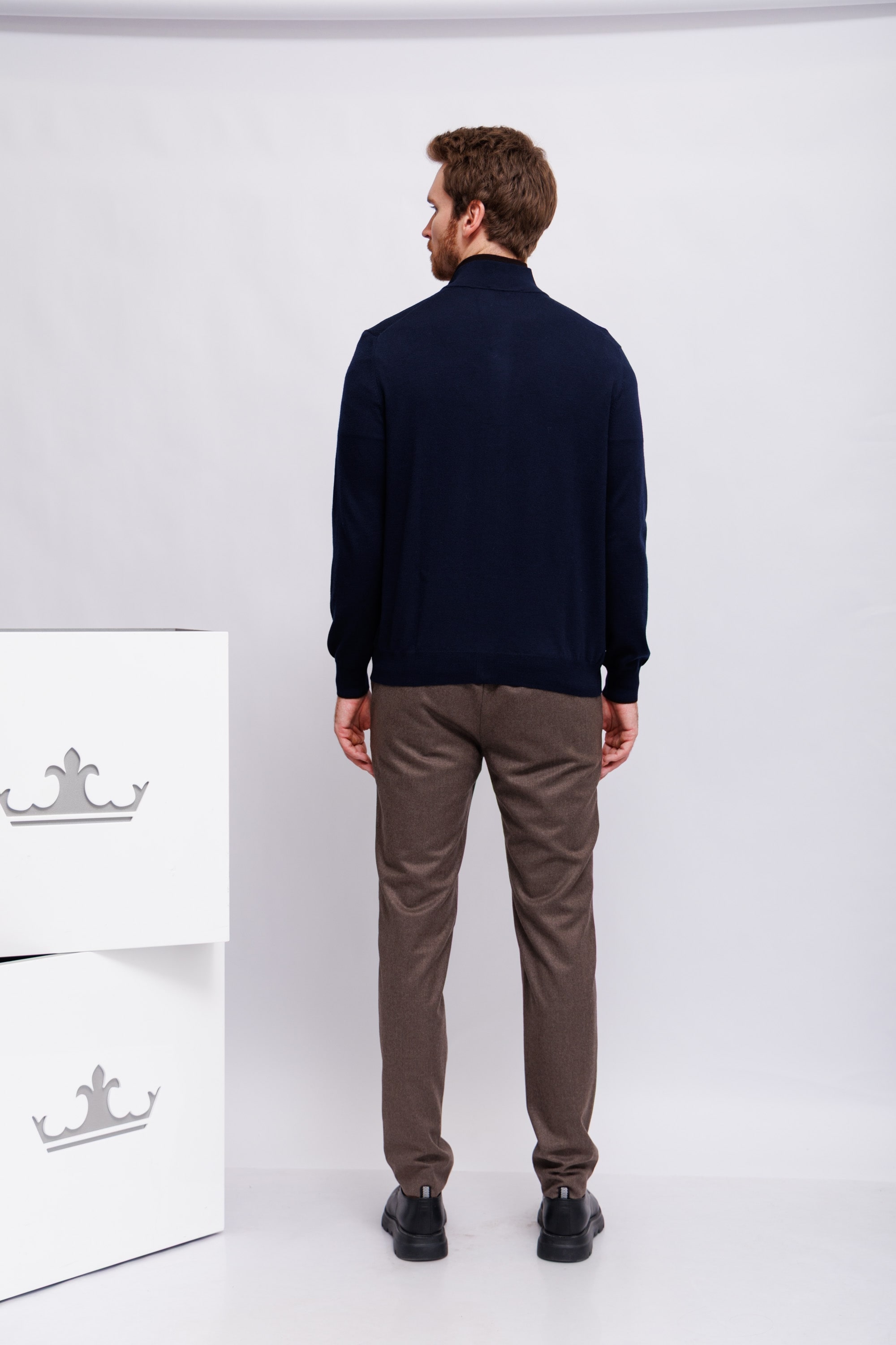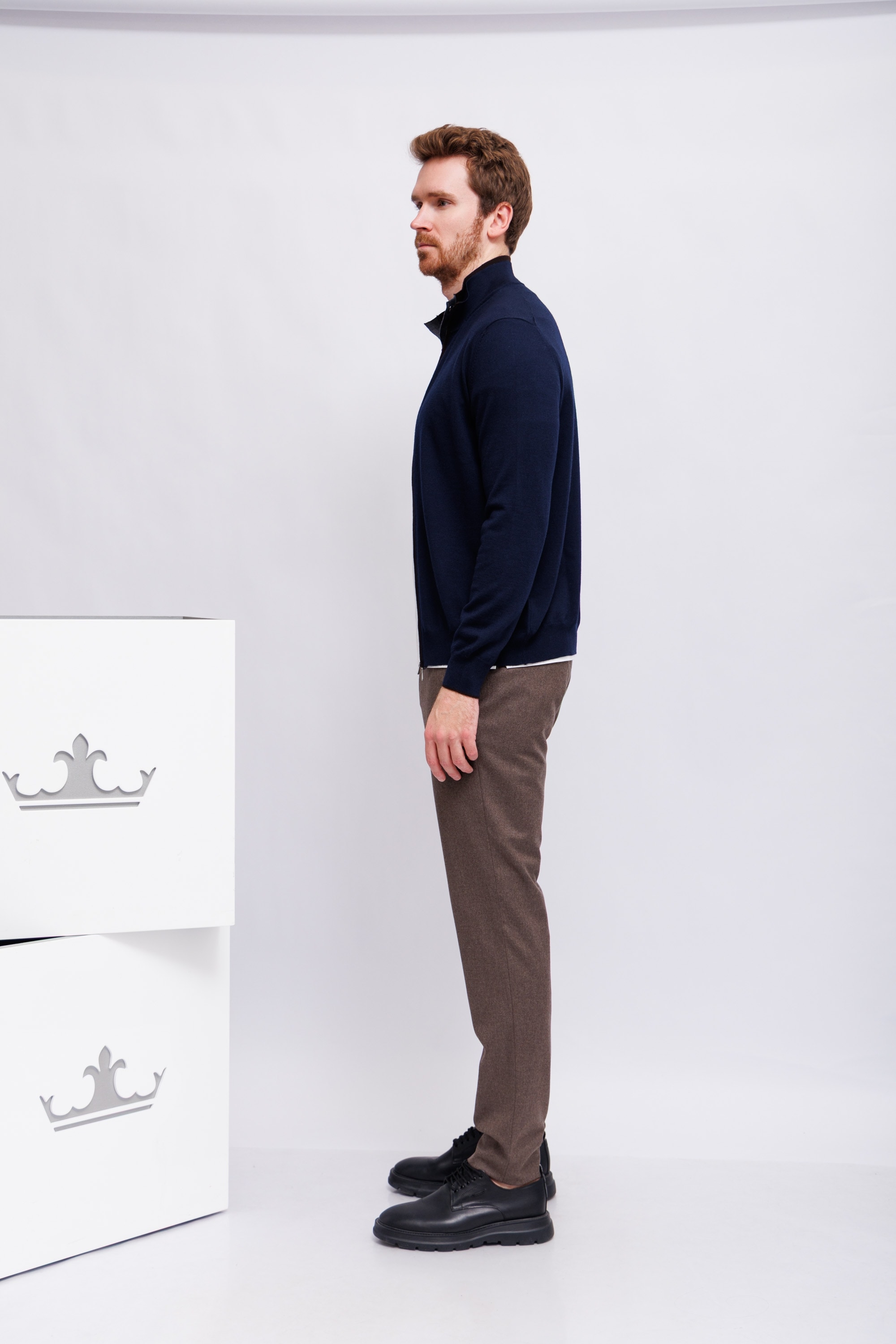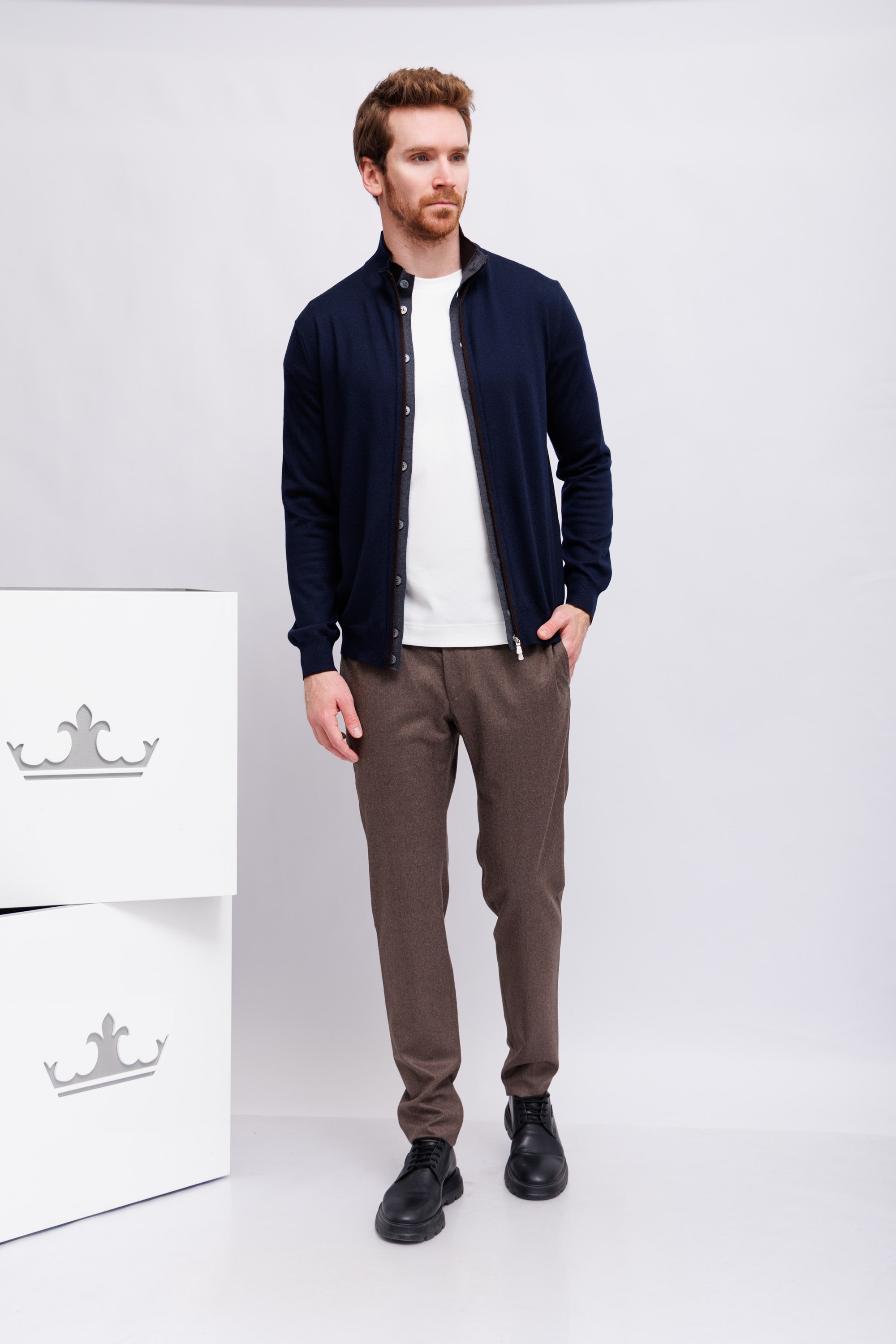 Кардиган тёмно-синийВорот-стойка с ребристой вязкойНа пуговицах и молнии с контрастной шоколадной и серой отделкойДлинные рукаваМанжеты и низ изделия-эластичный ребристый трикотаж