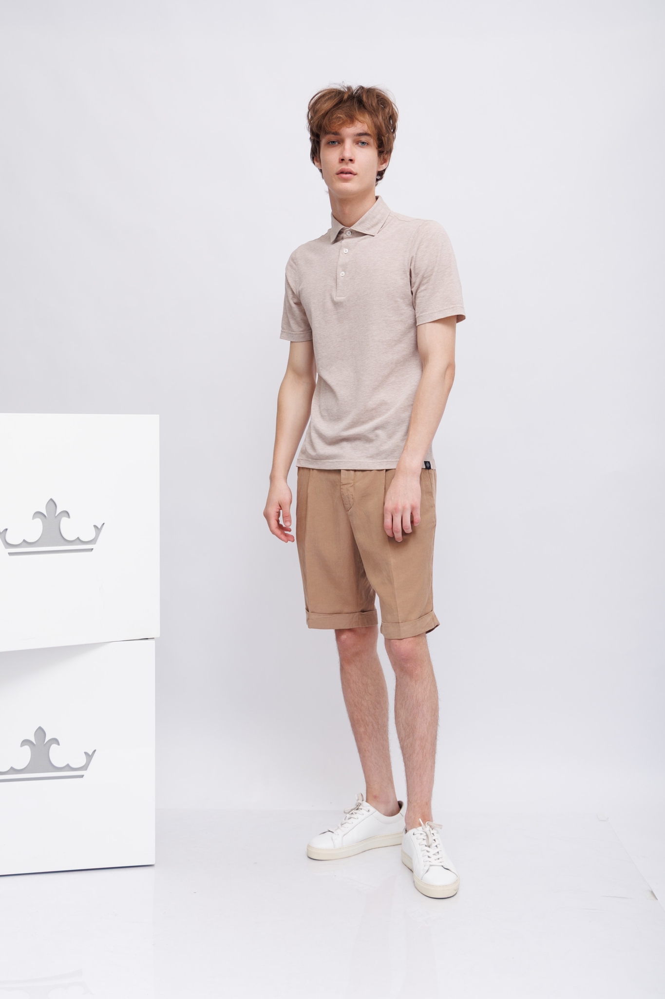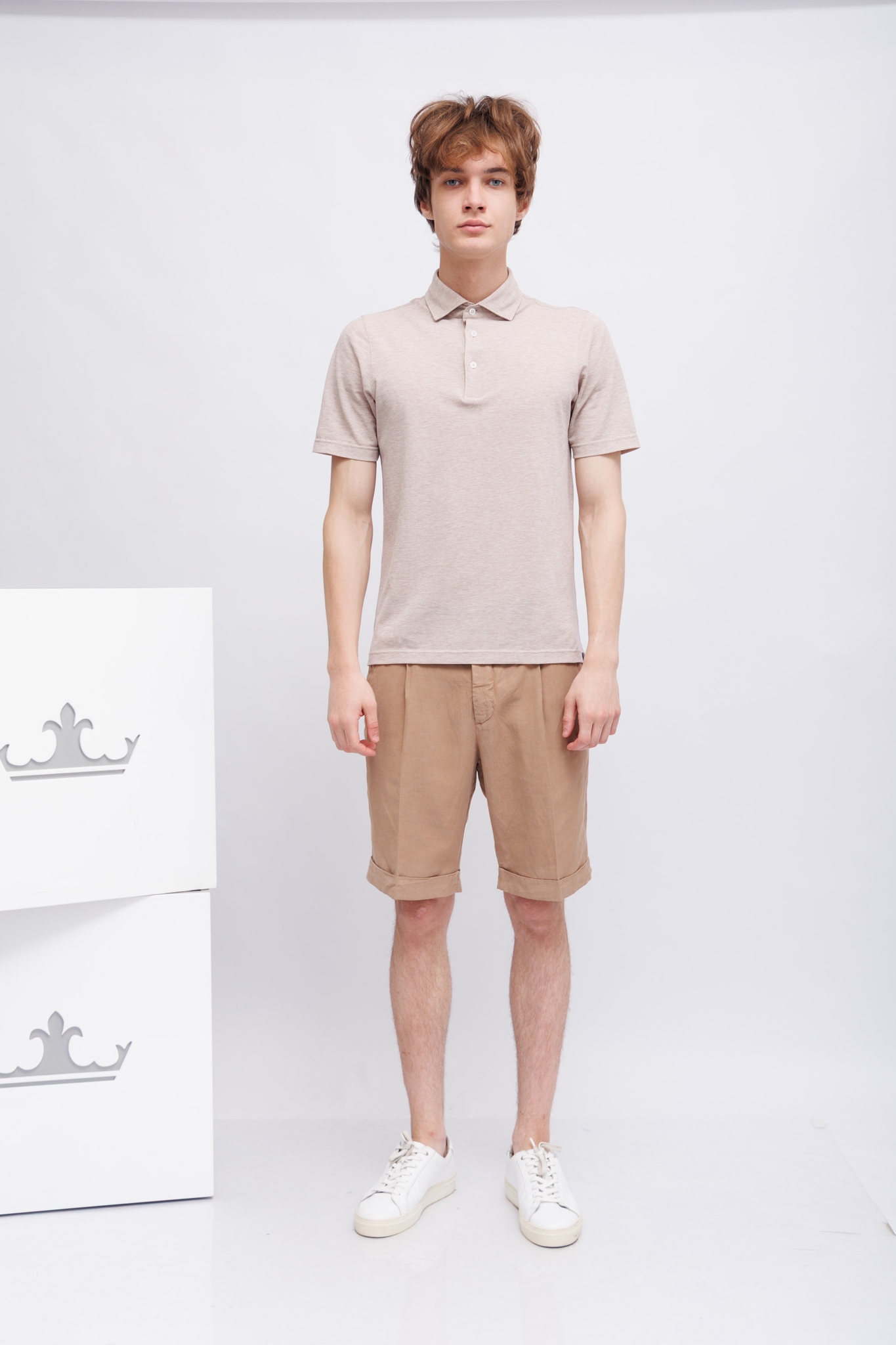 Поло хлопковое бежевого цвета с эффектом меланжСлегка приталенный кройВорот на пуговицахПо бокам-небольшие разрезы