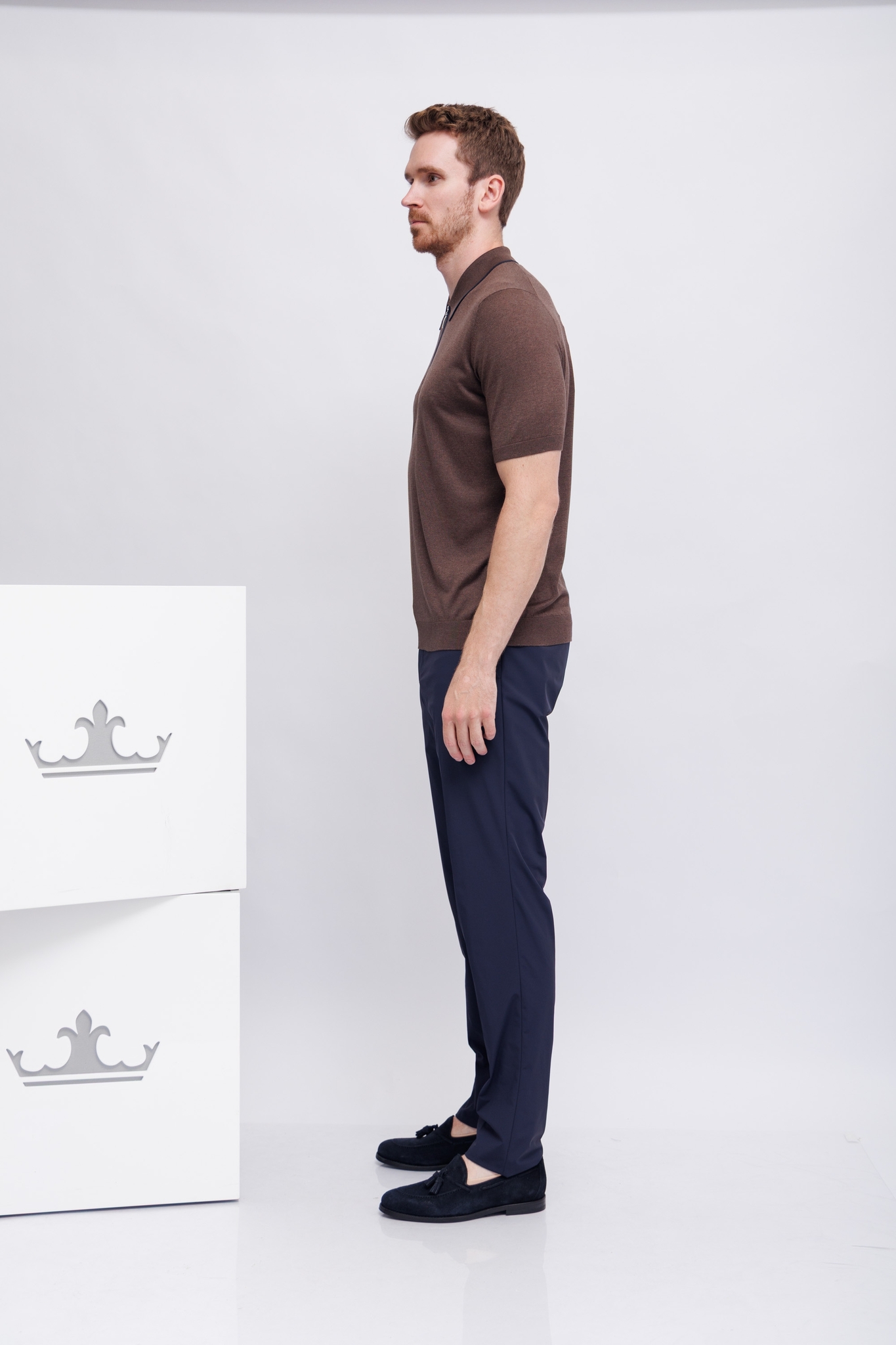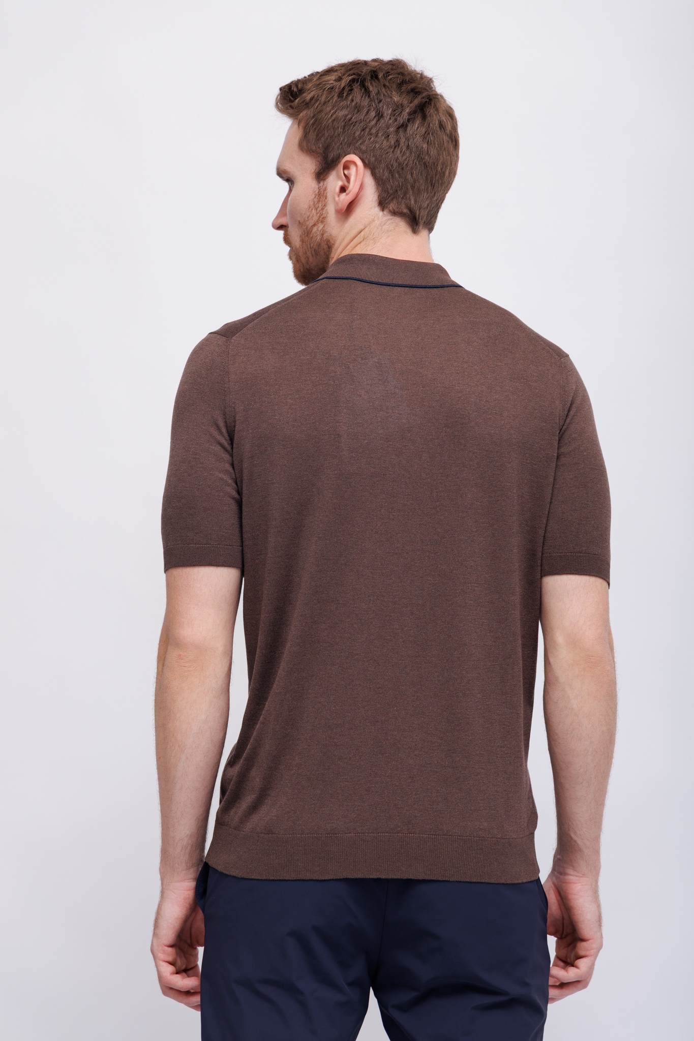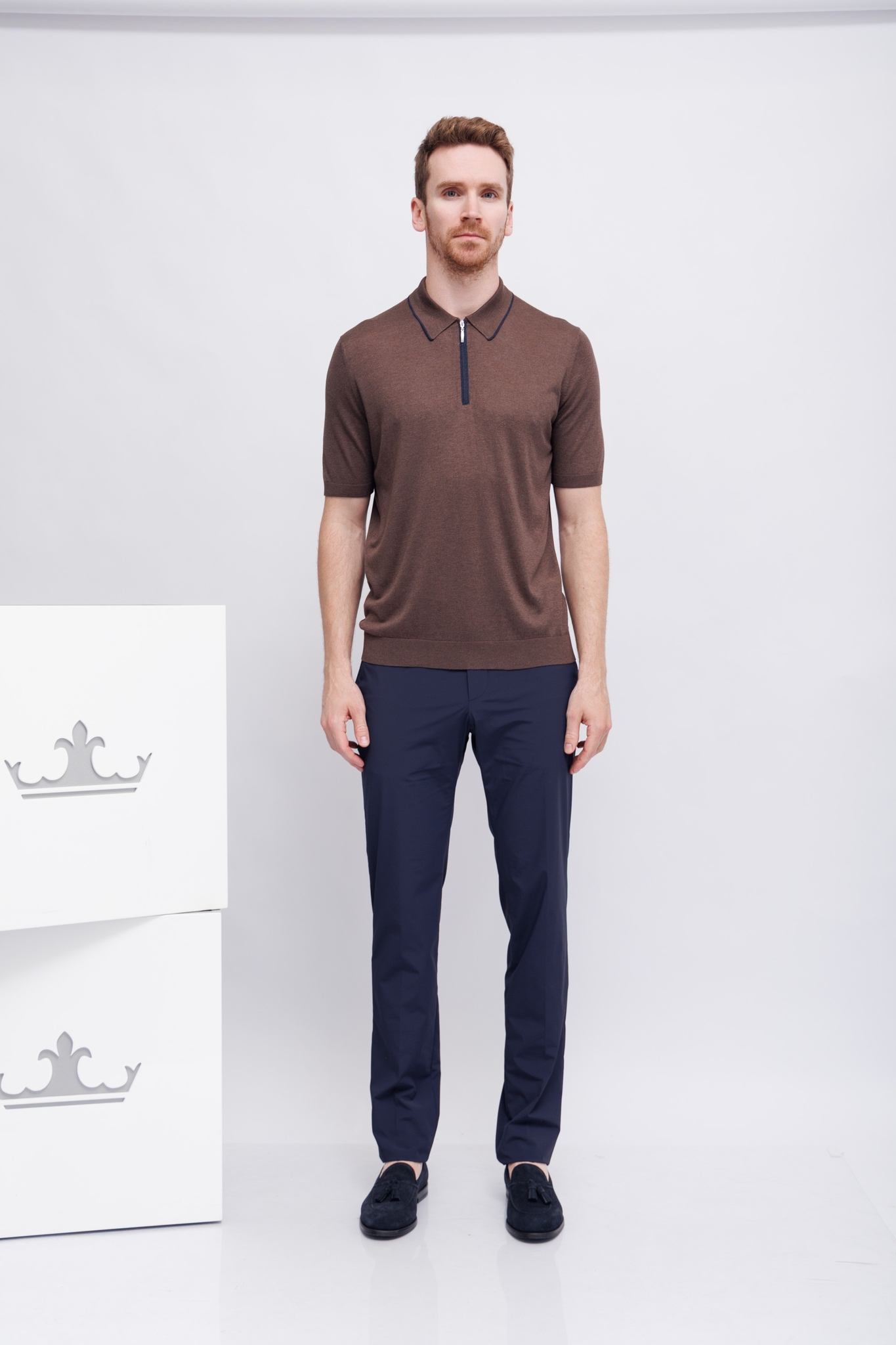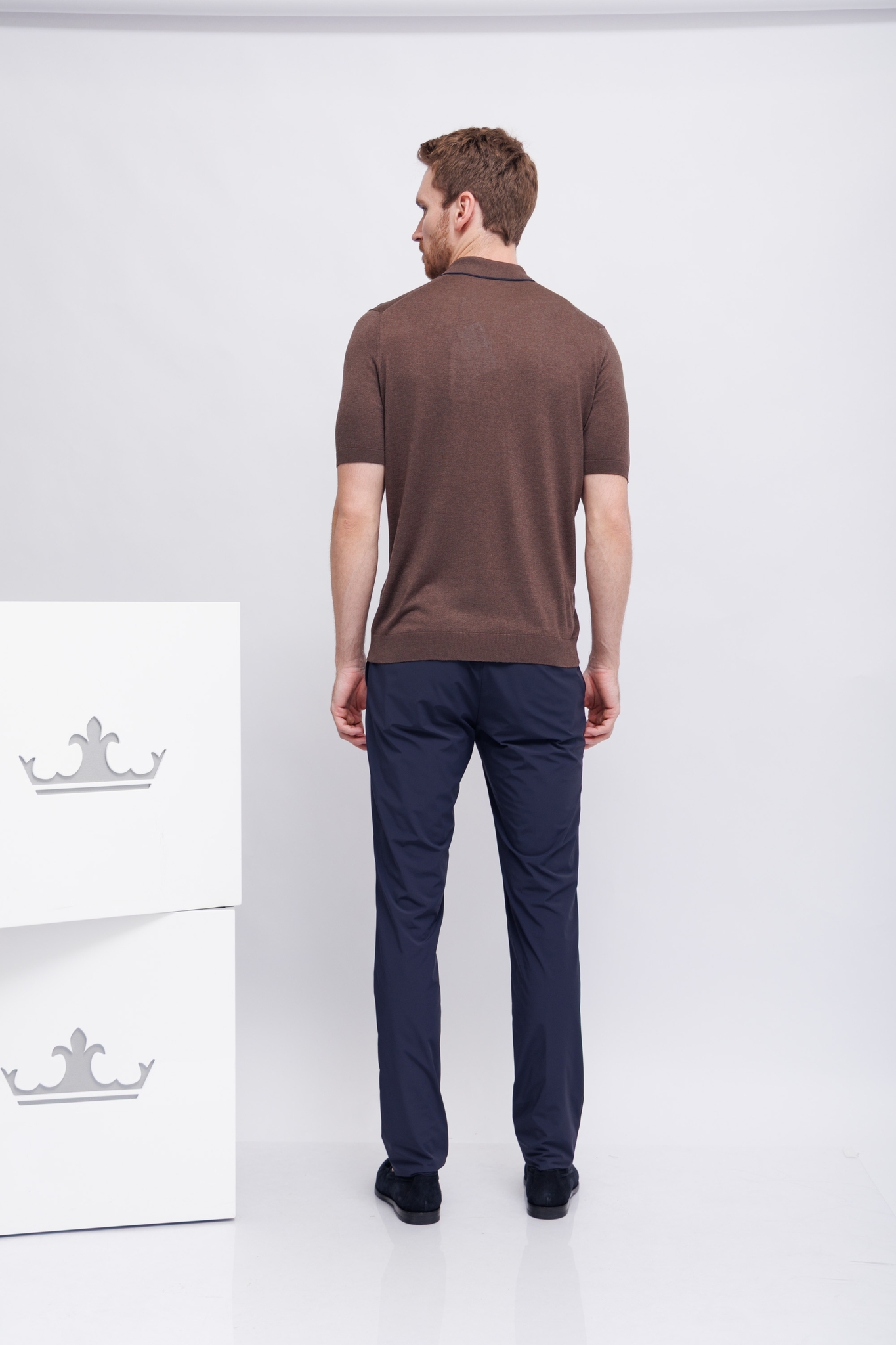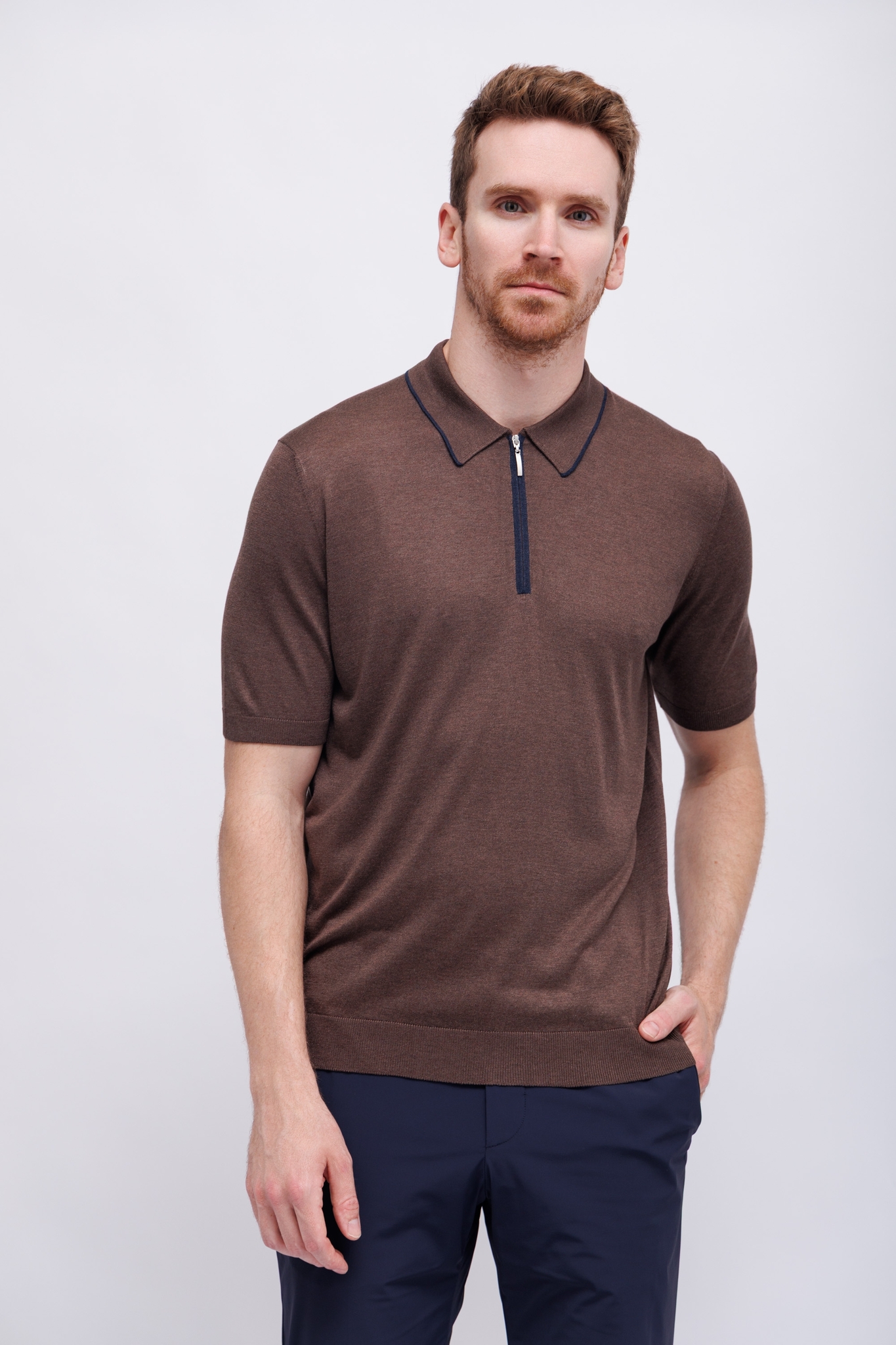 Шоколадного цвета с темно-синей отделкойСлегка приталенный кройВорот на молнииМанжеты рукавов и низ изделия -трикотажная резинка