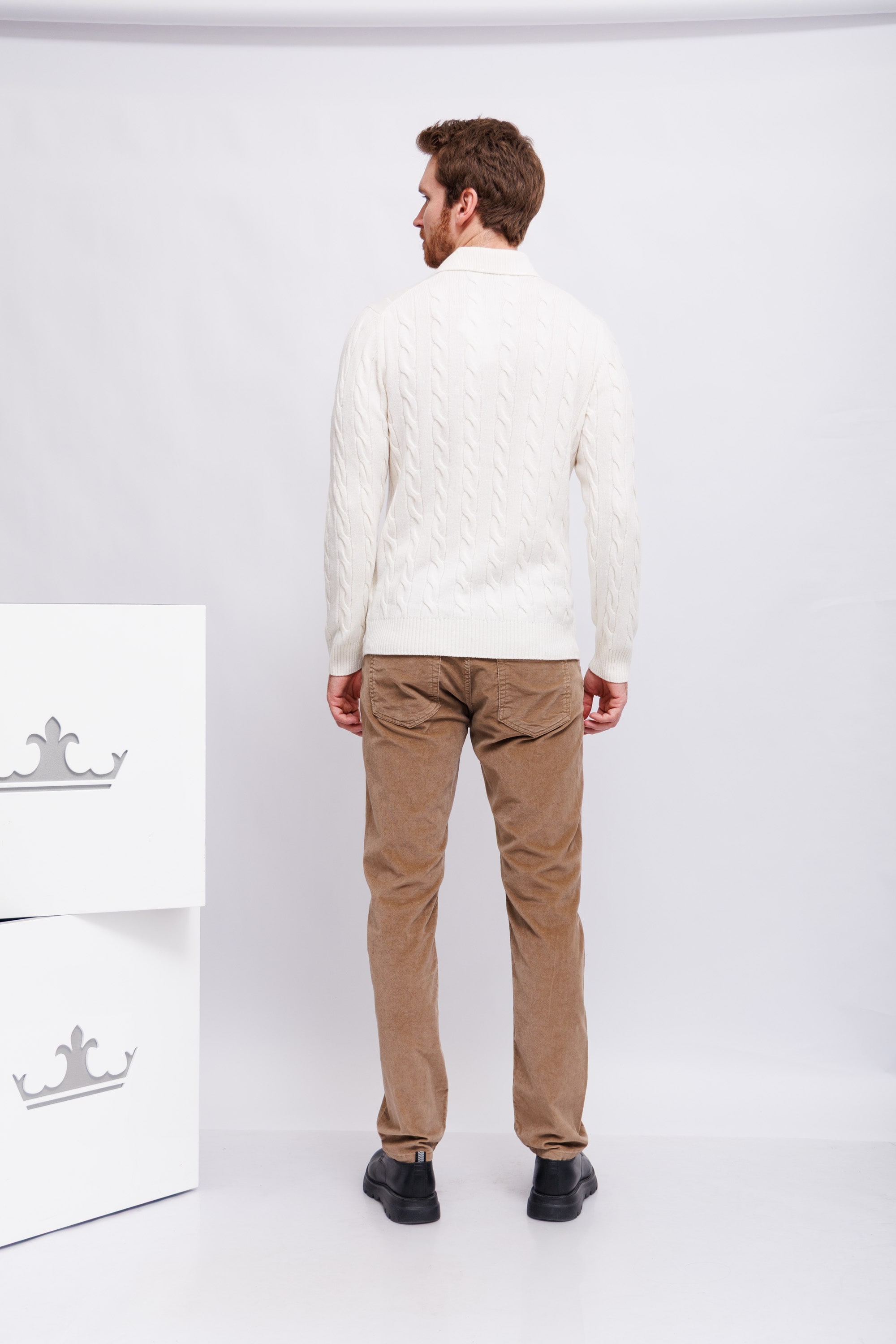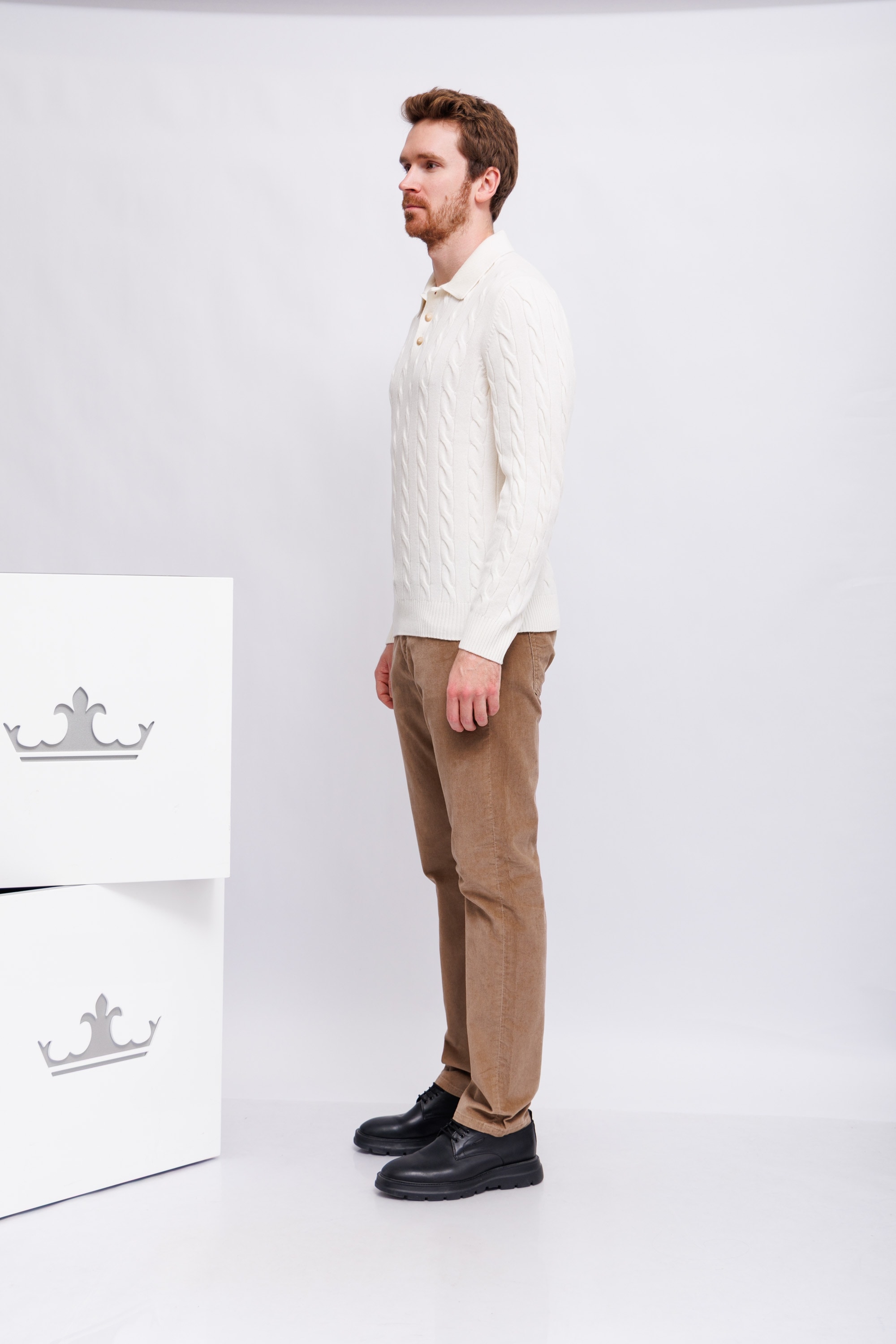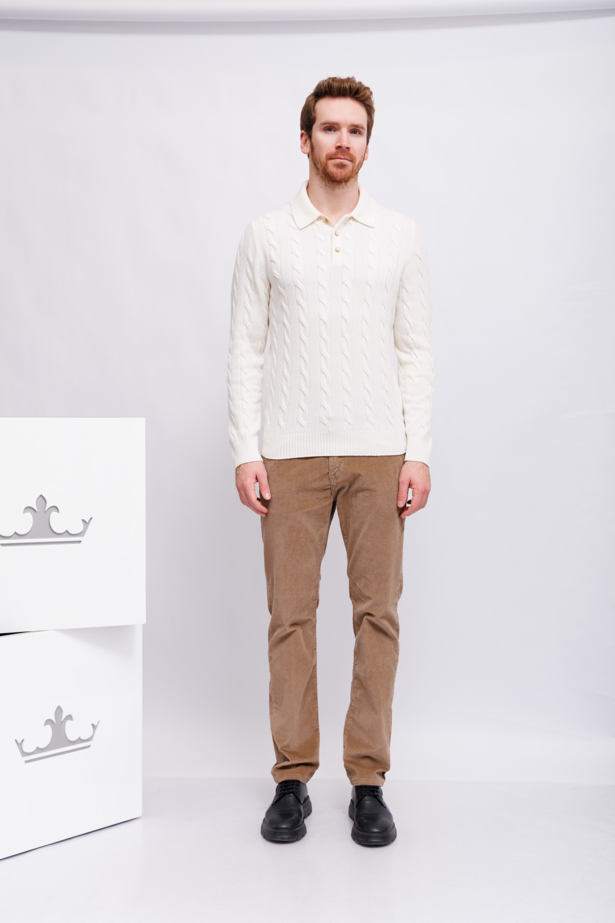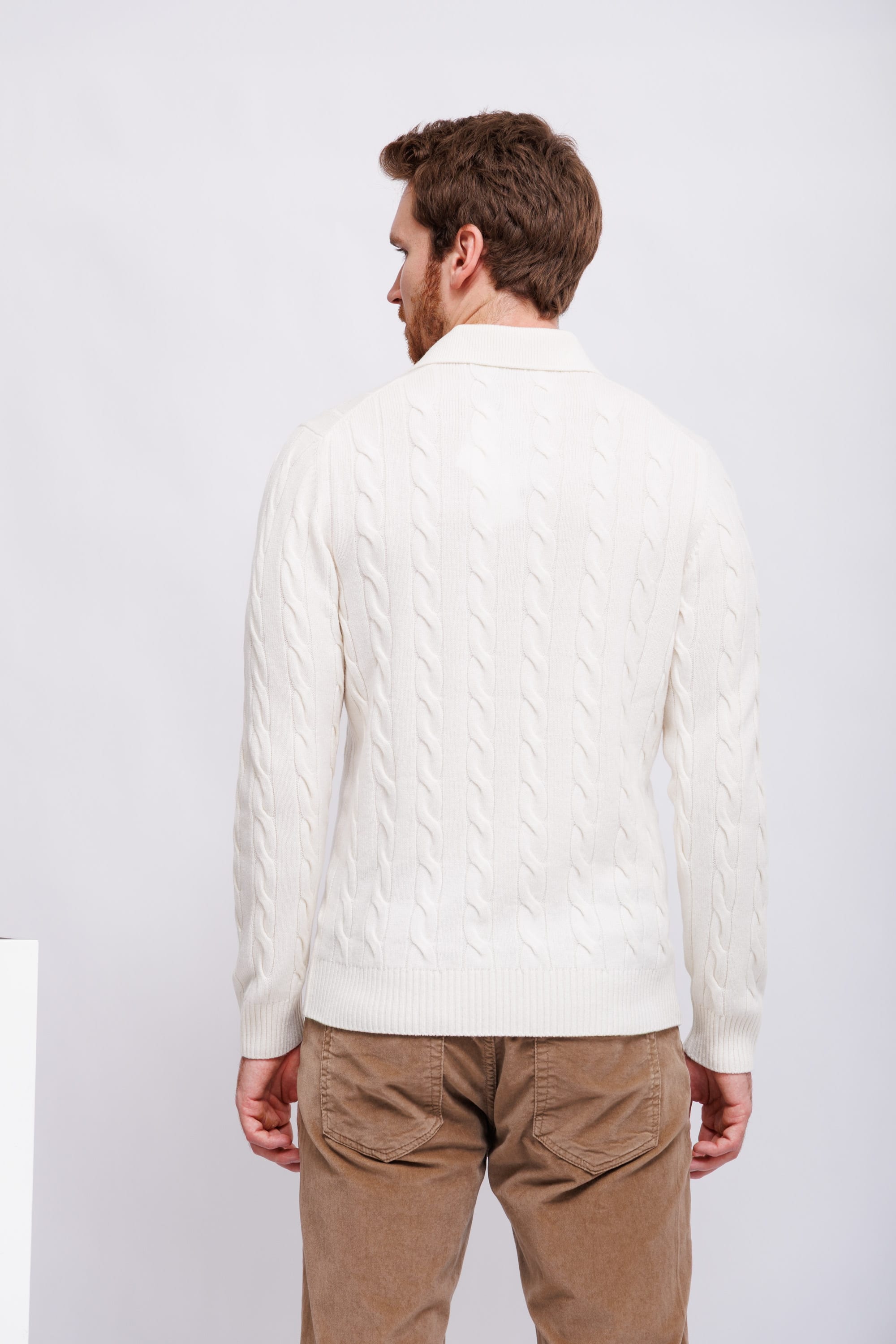 Поло вязаное молочного цветаОбъёмный вязаный узор: крупные косы- араныПрямой кройВорот на контрастных пуговицахМанжеты рукавов и низ изделия - трикотажная резинка