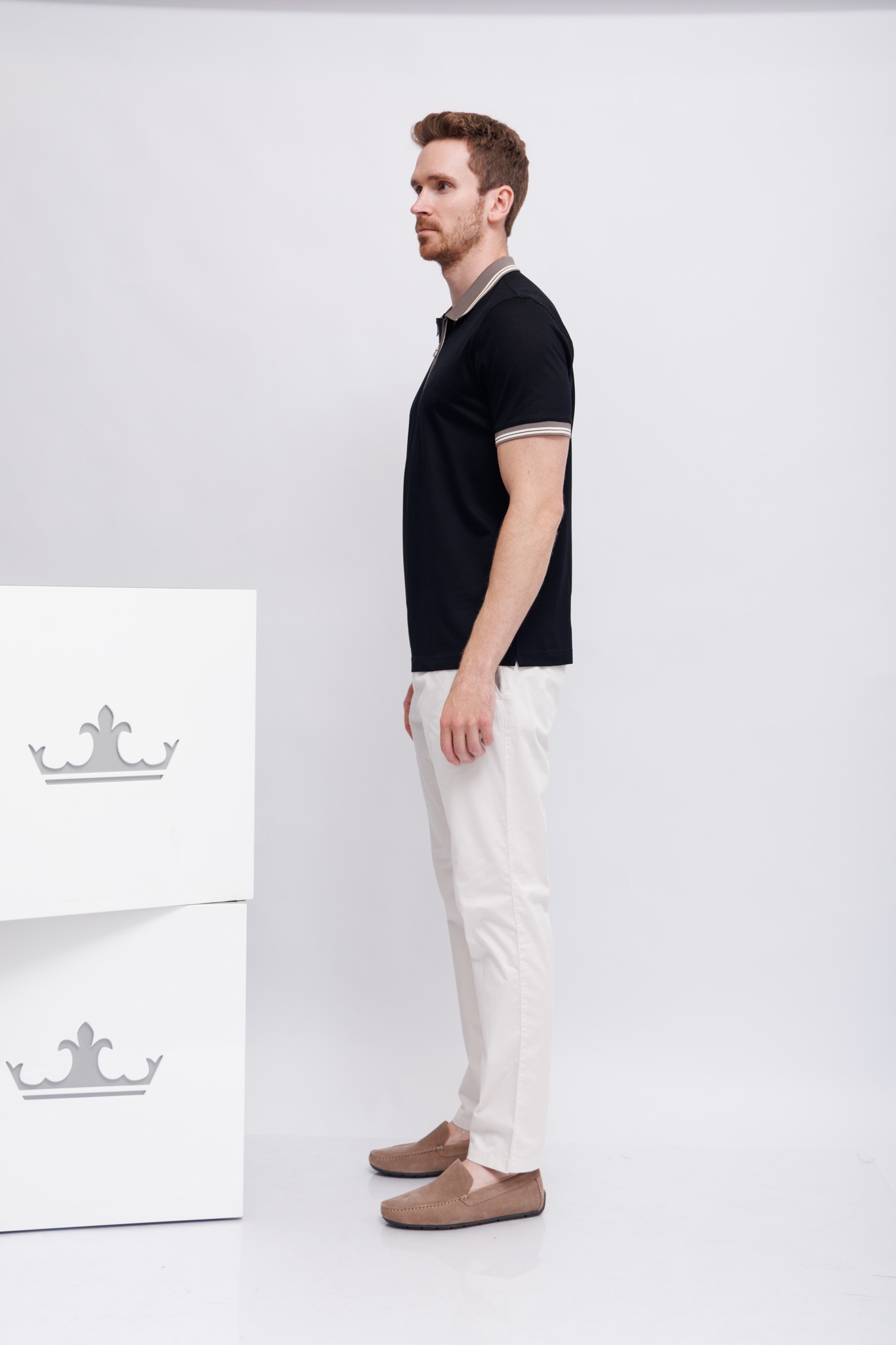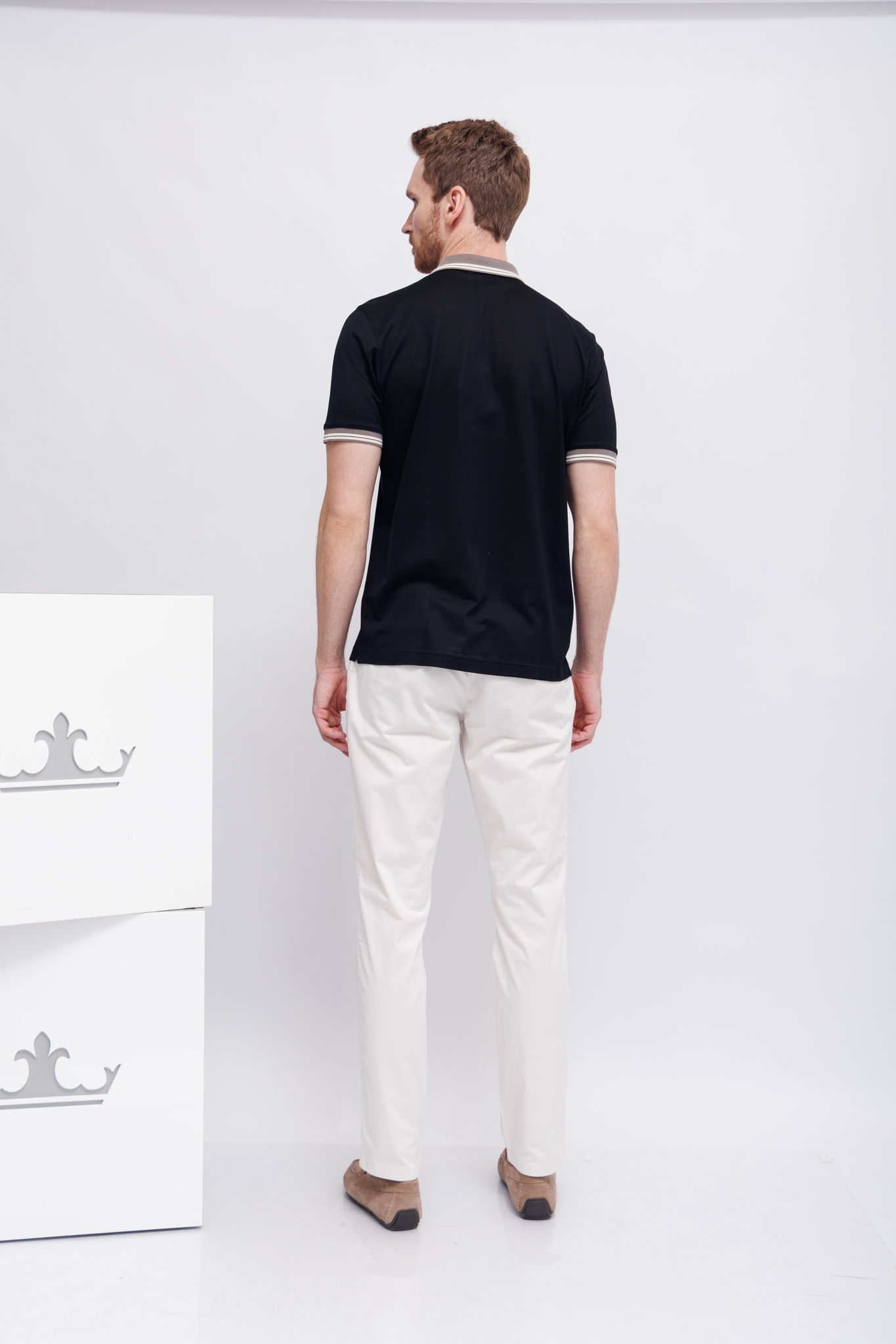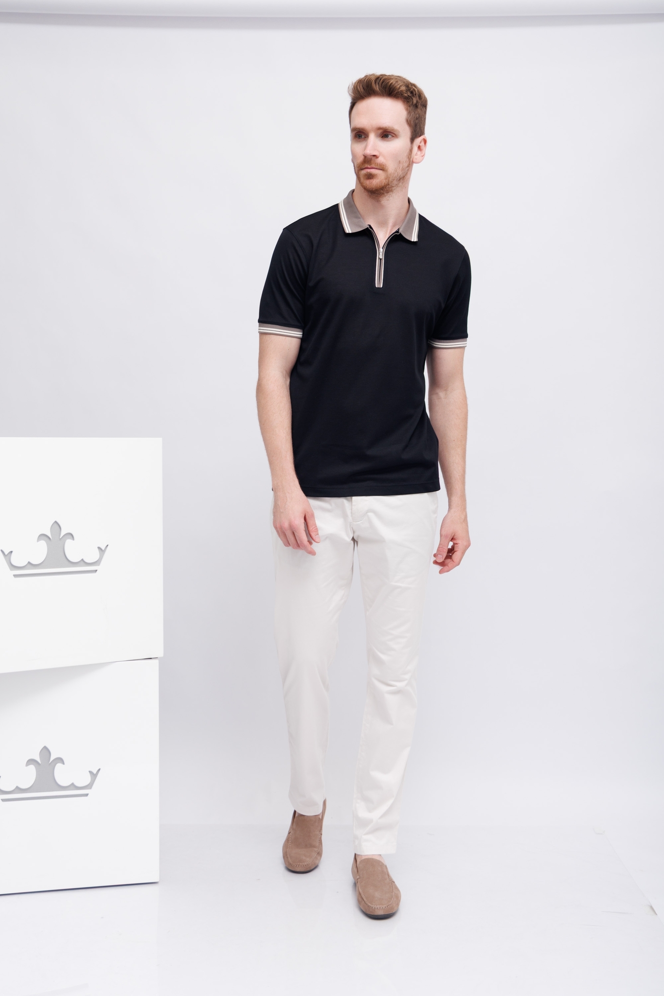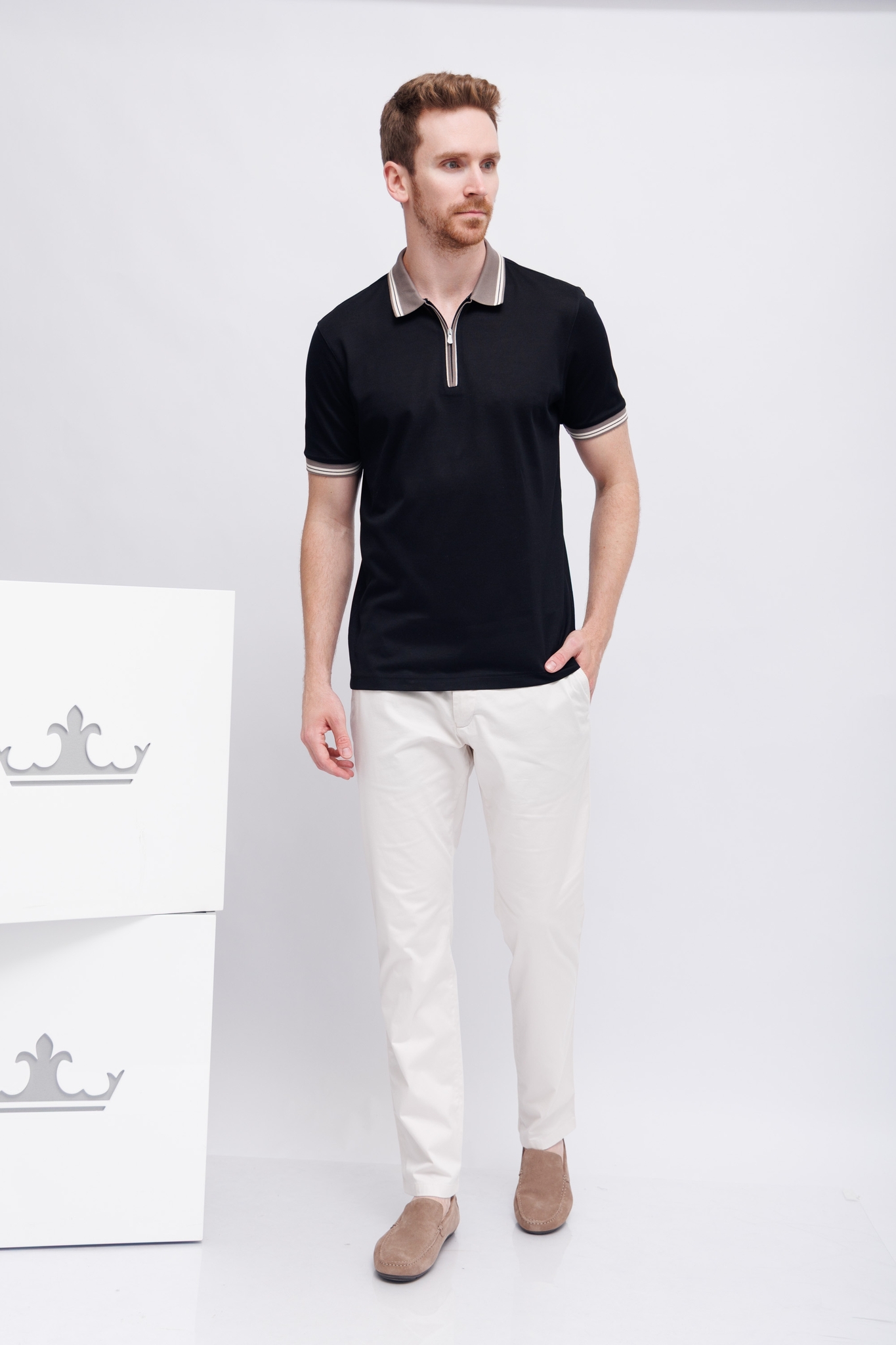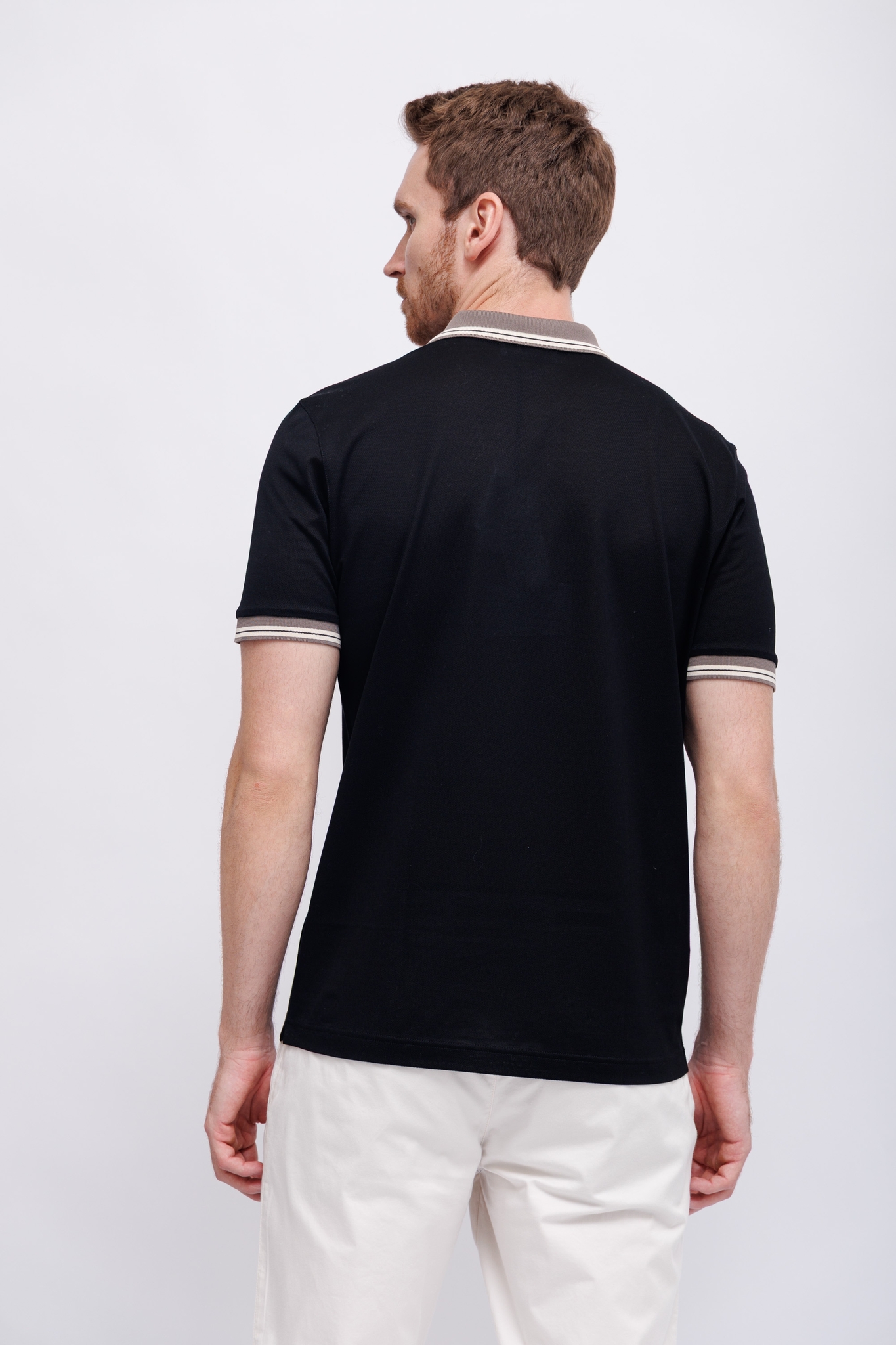 Поло чёрное с контрастной отделкойСлегка приталенный кройВорот на молнииМанжеты рукавов -трикотажная резинкаПо бокам-небольшие разрезы
