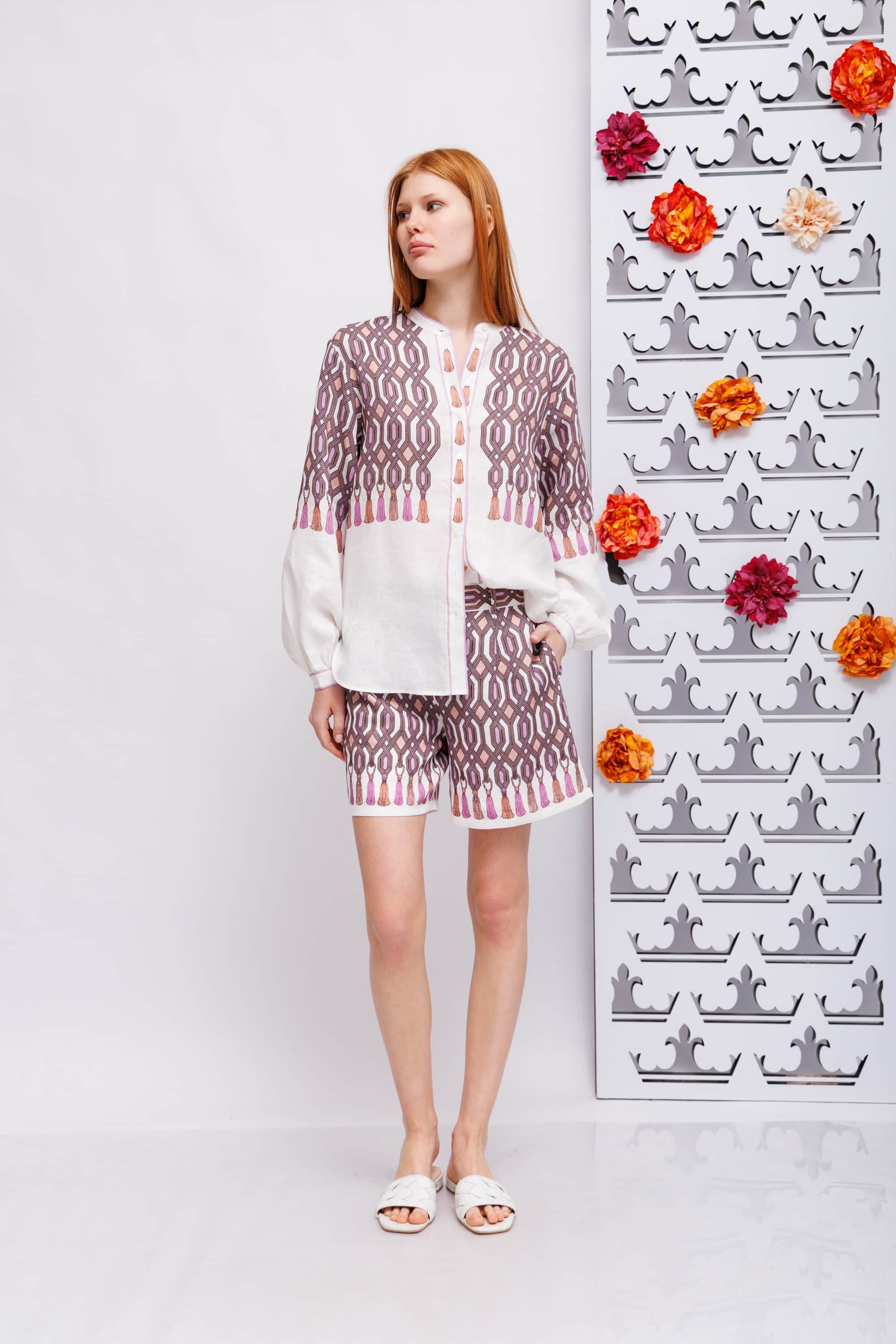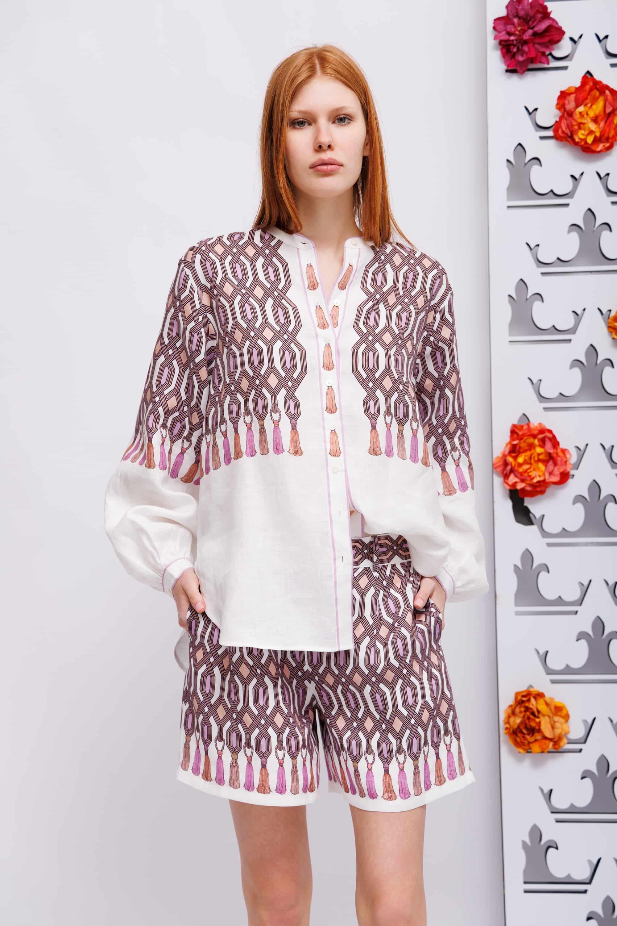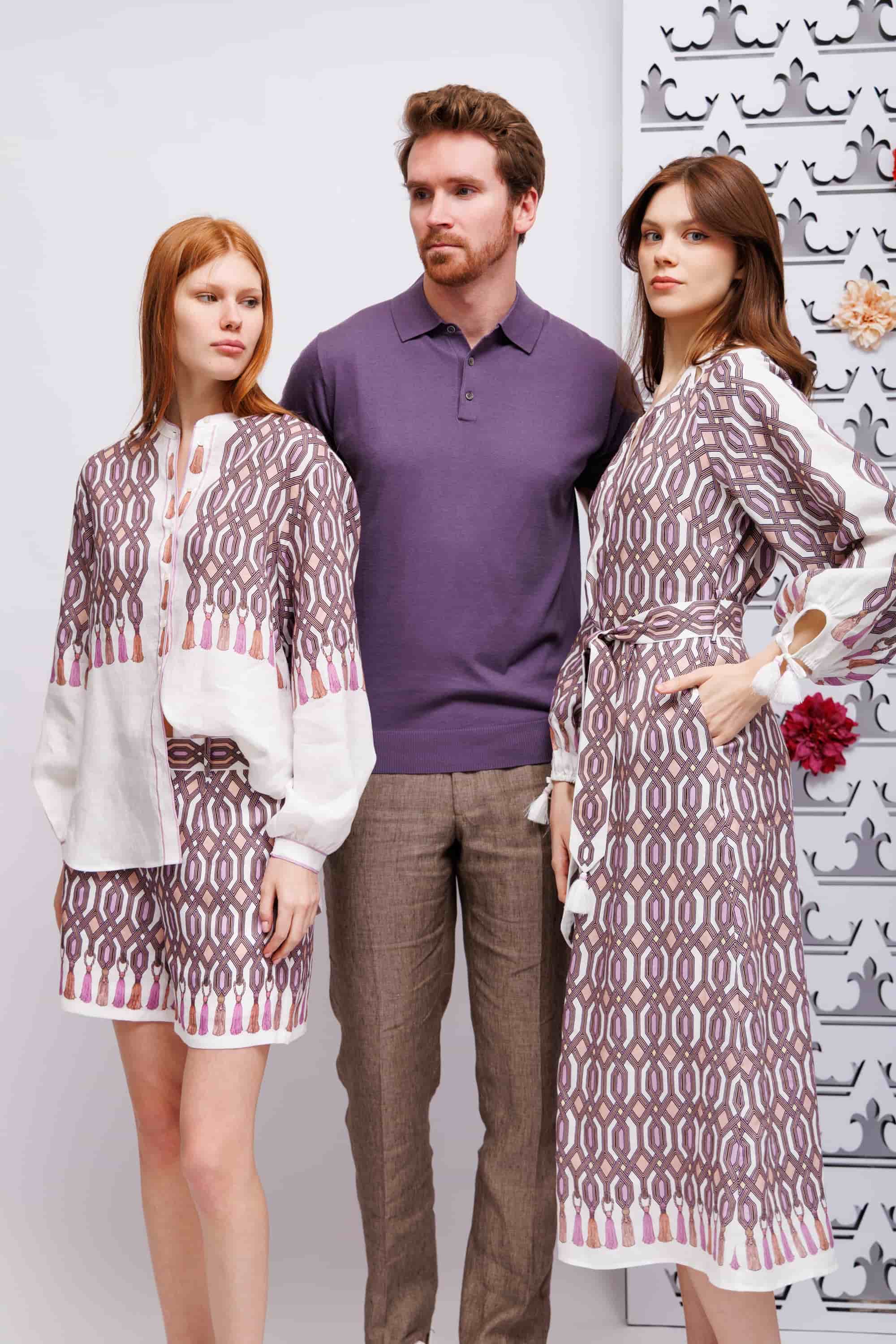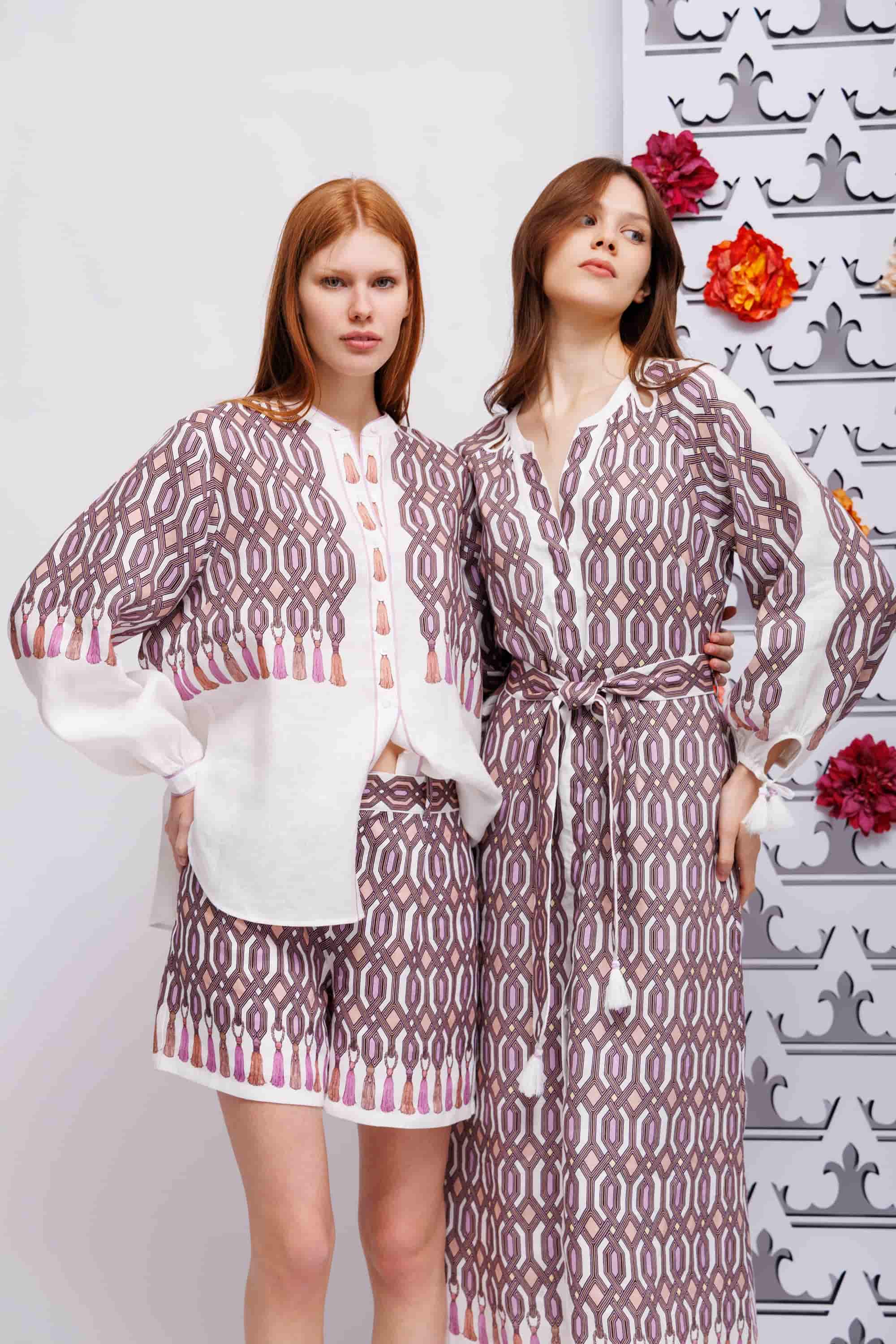Костюм льняной в геометрический узор с кисточками