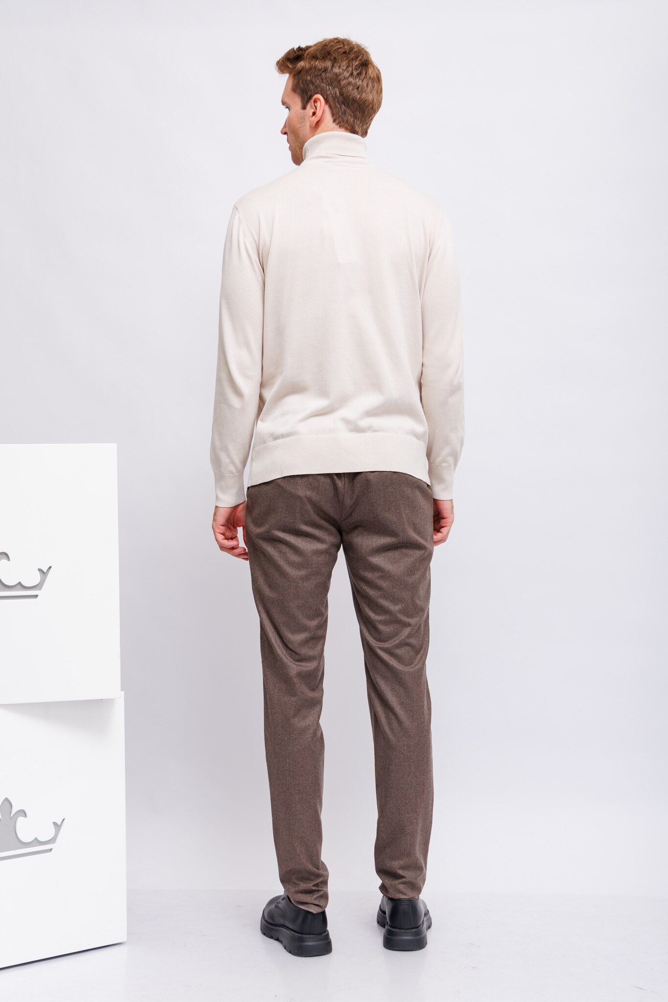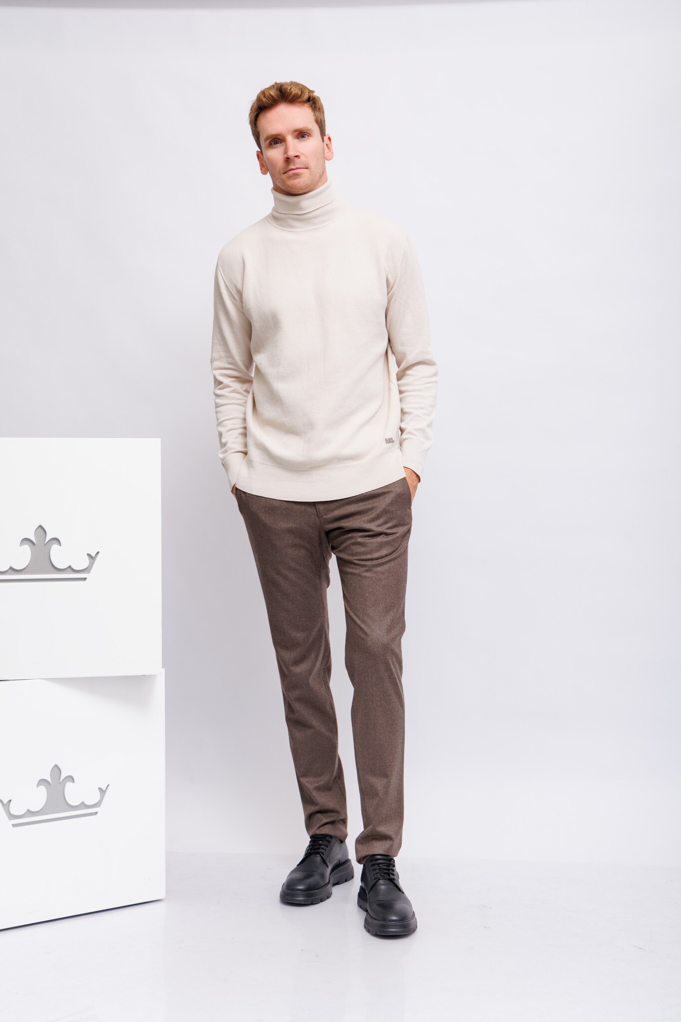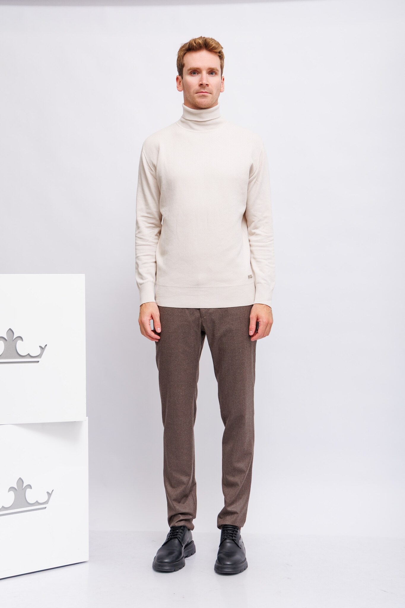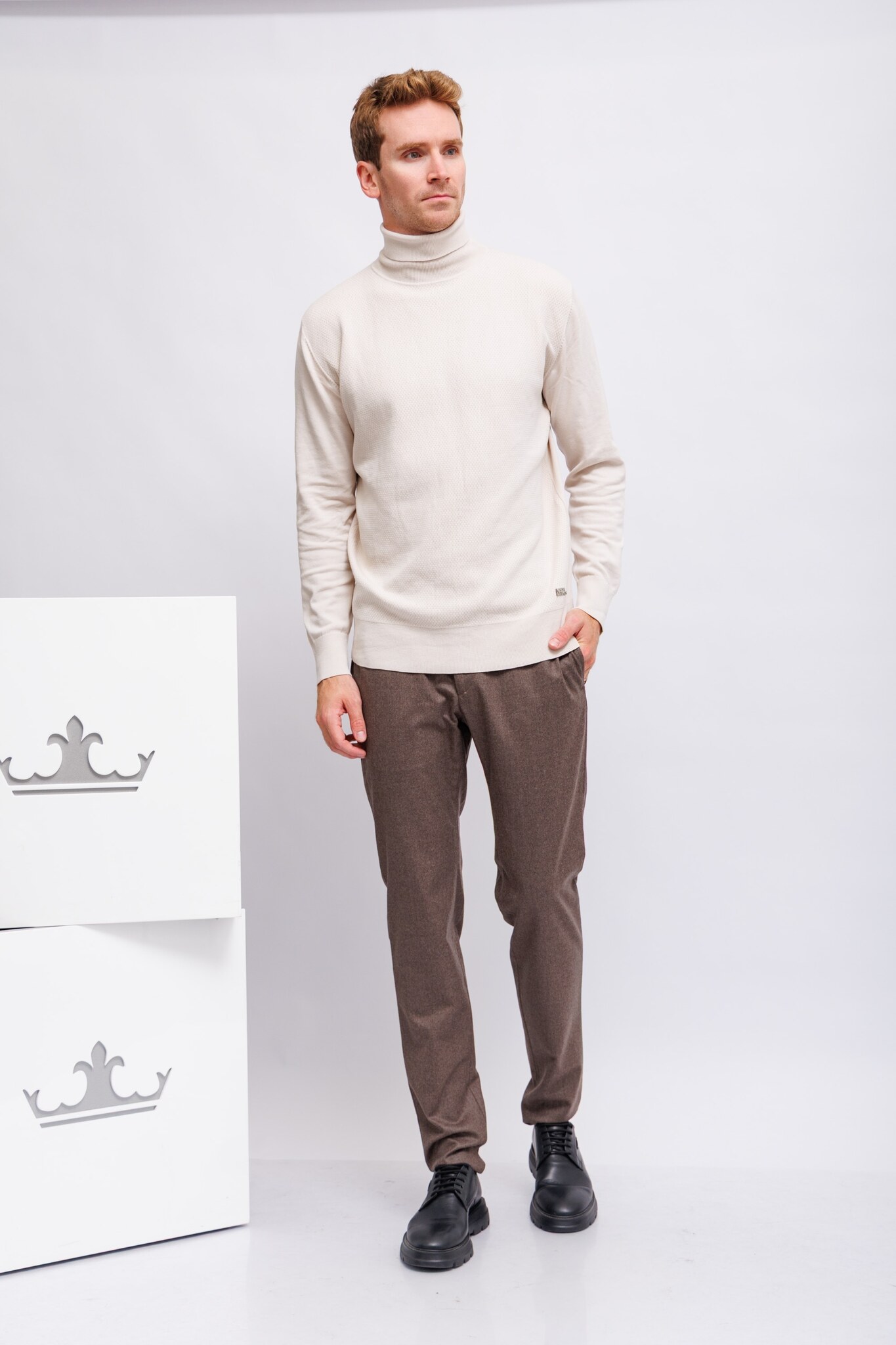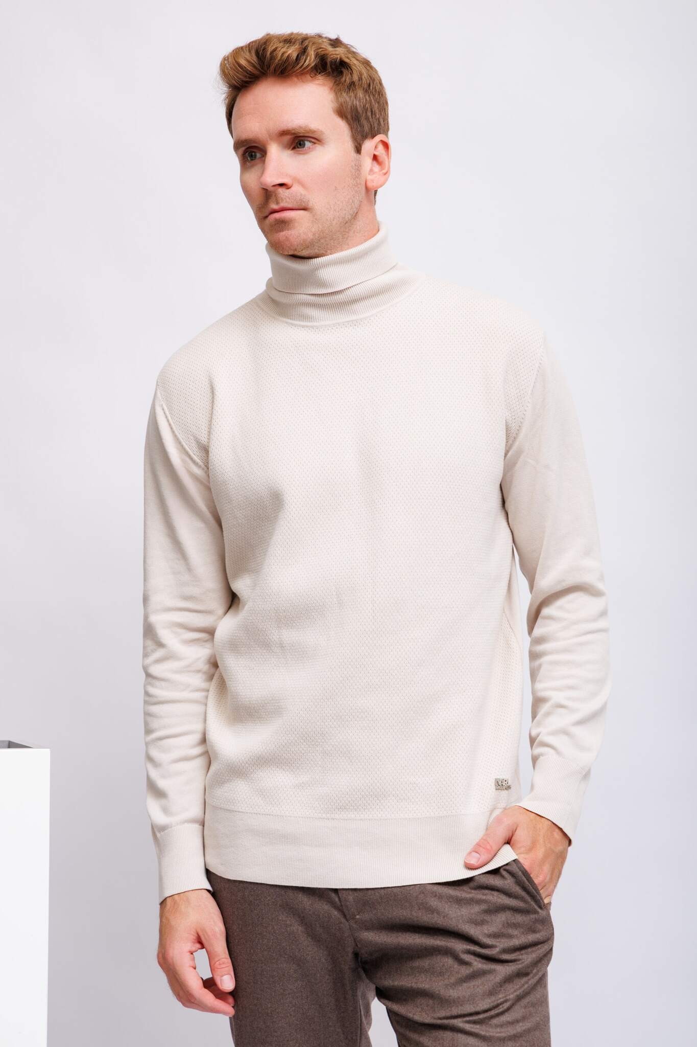 Свитер светло-бежевыйВ выработкуДлинные рукаваВысокий ворот с отворотамиПолуприталенный кройТрикотажная резинка по низу и рукавам