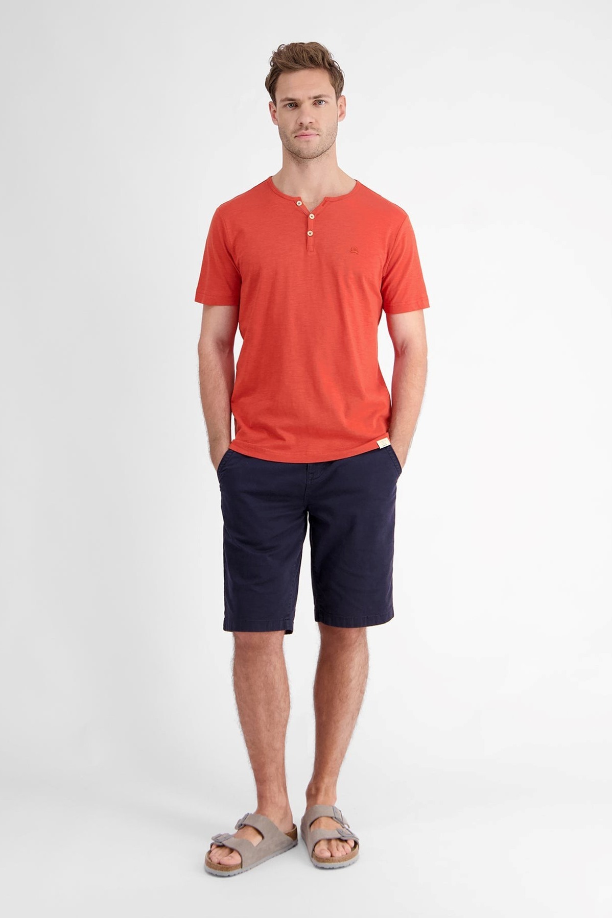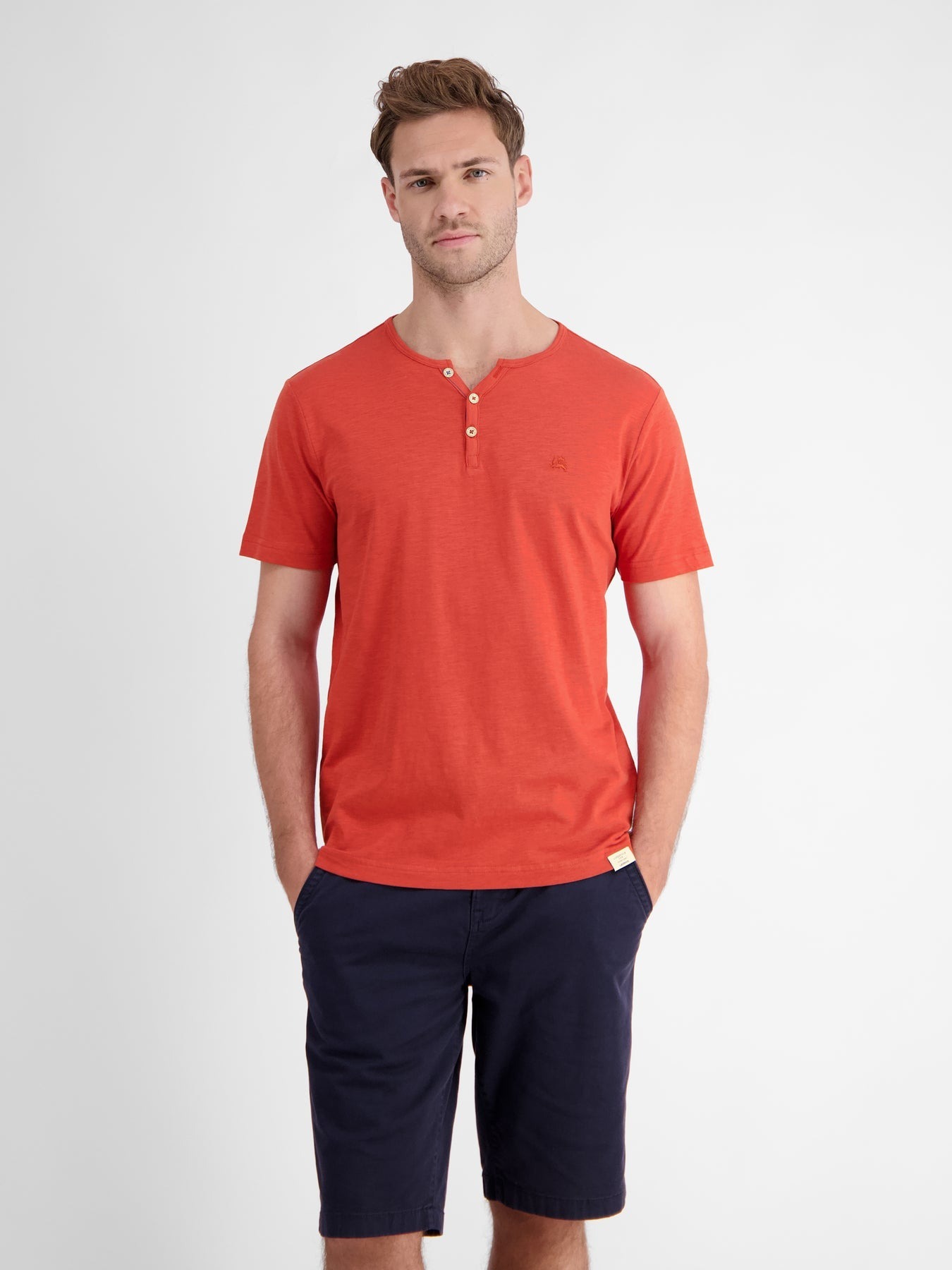 Футболка краснаяНа груди- вышитый логотипКруглый вырез на пуговицахКороткие рукаваПрямой крой