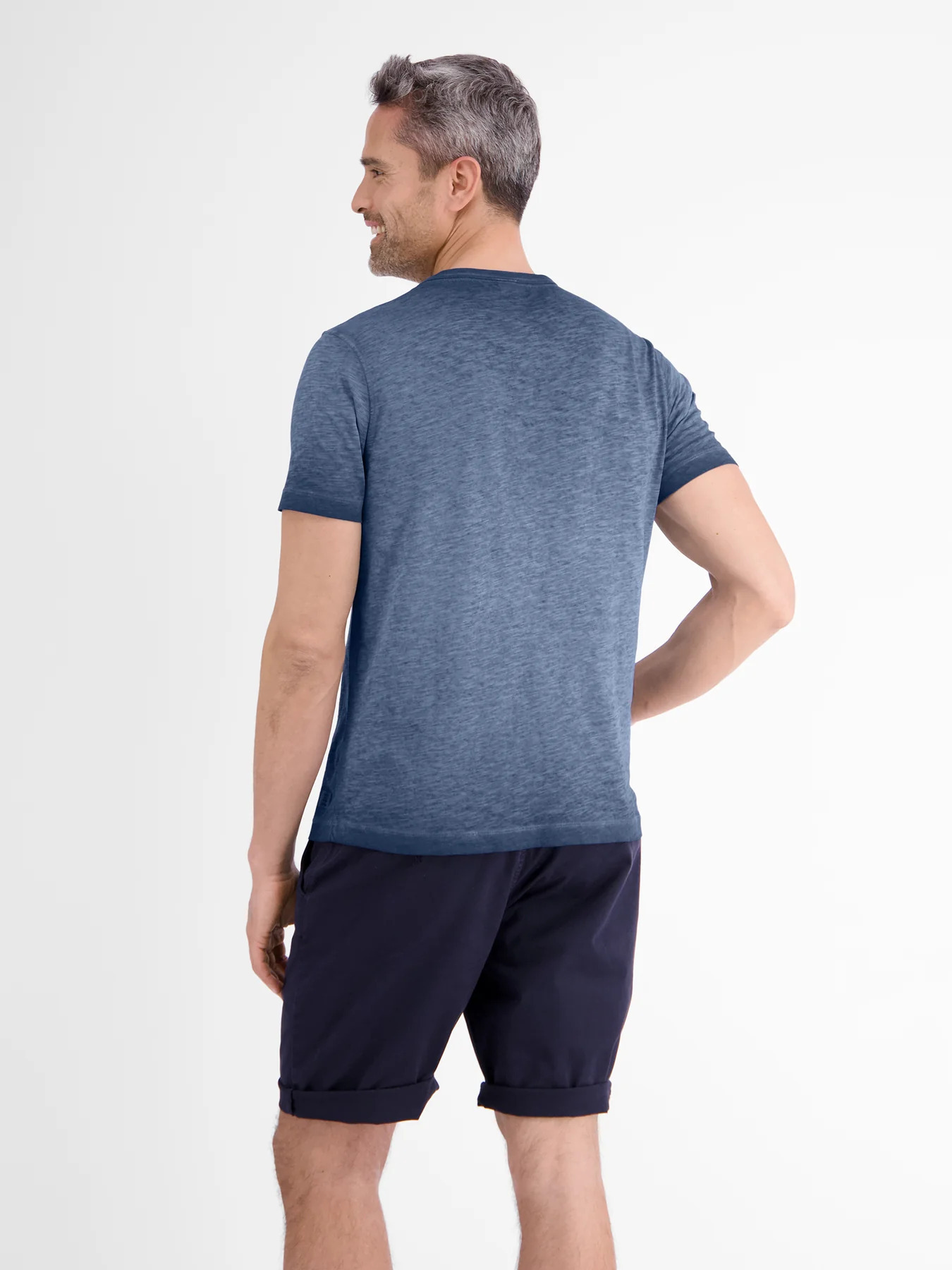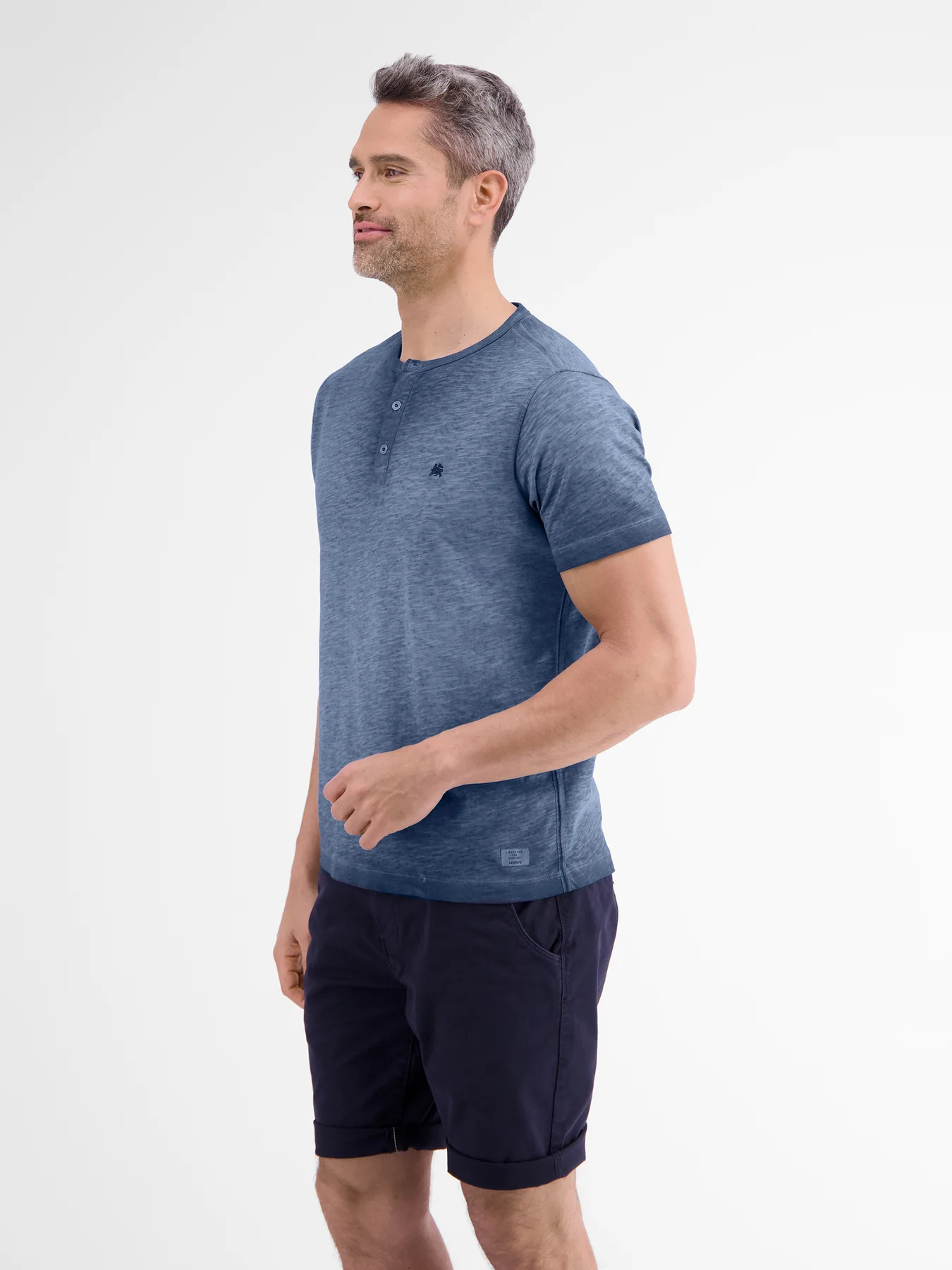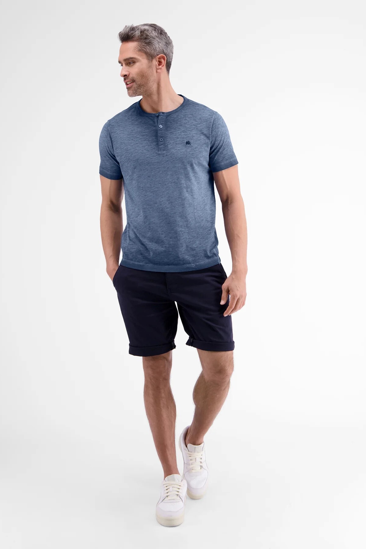 Футболка синяя с эффектом меланжКруглый вырез на контрастных пуговицахНа груди- вышитый логотипКороткие рукаваПрямой крой