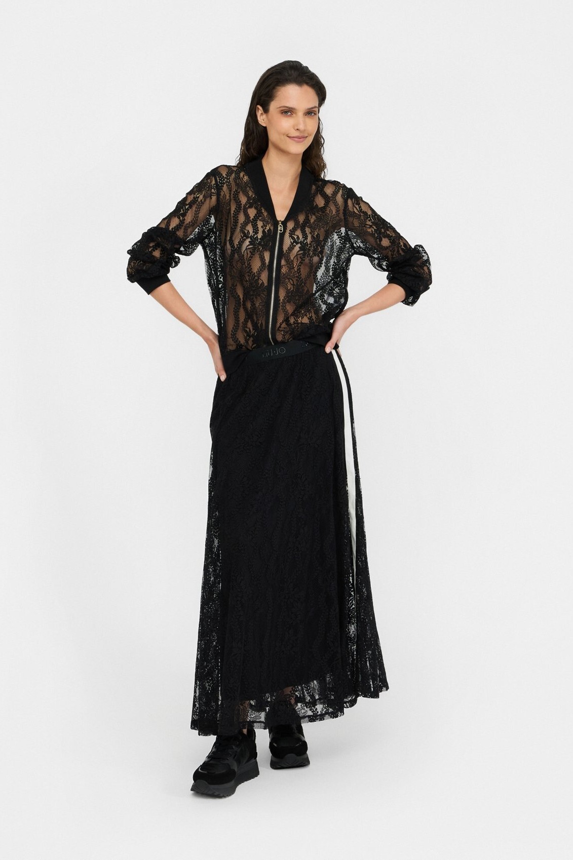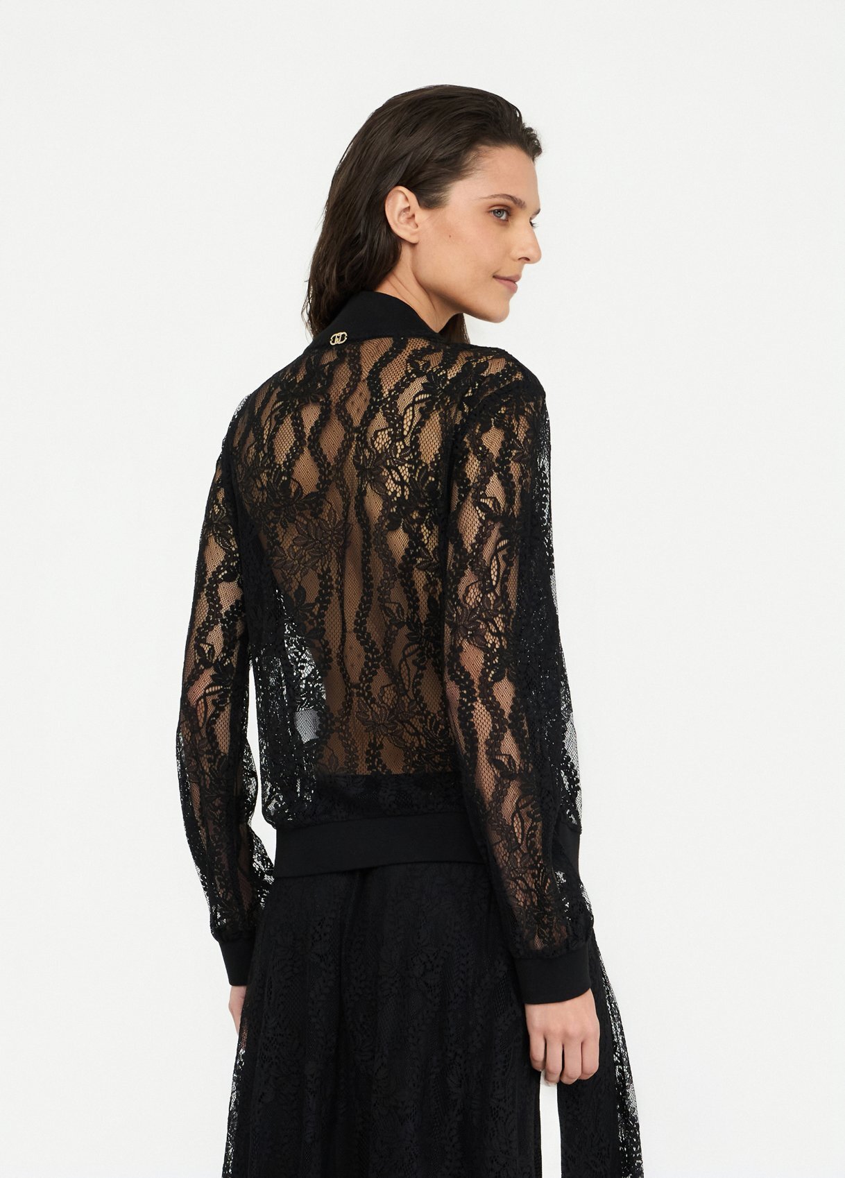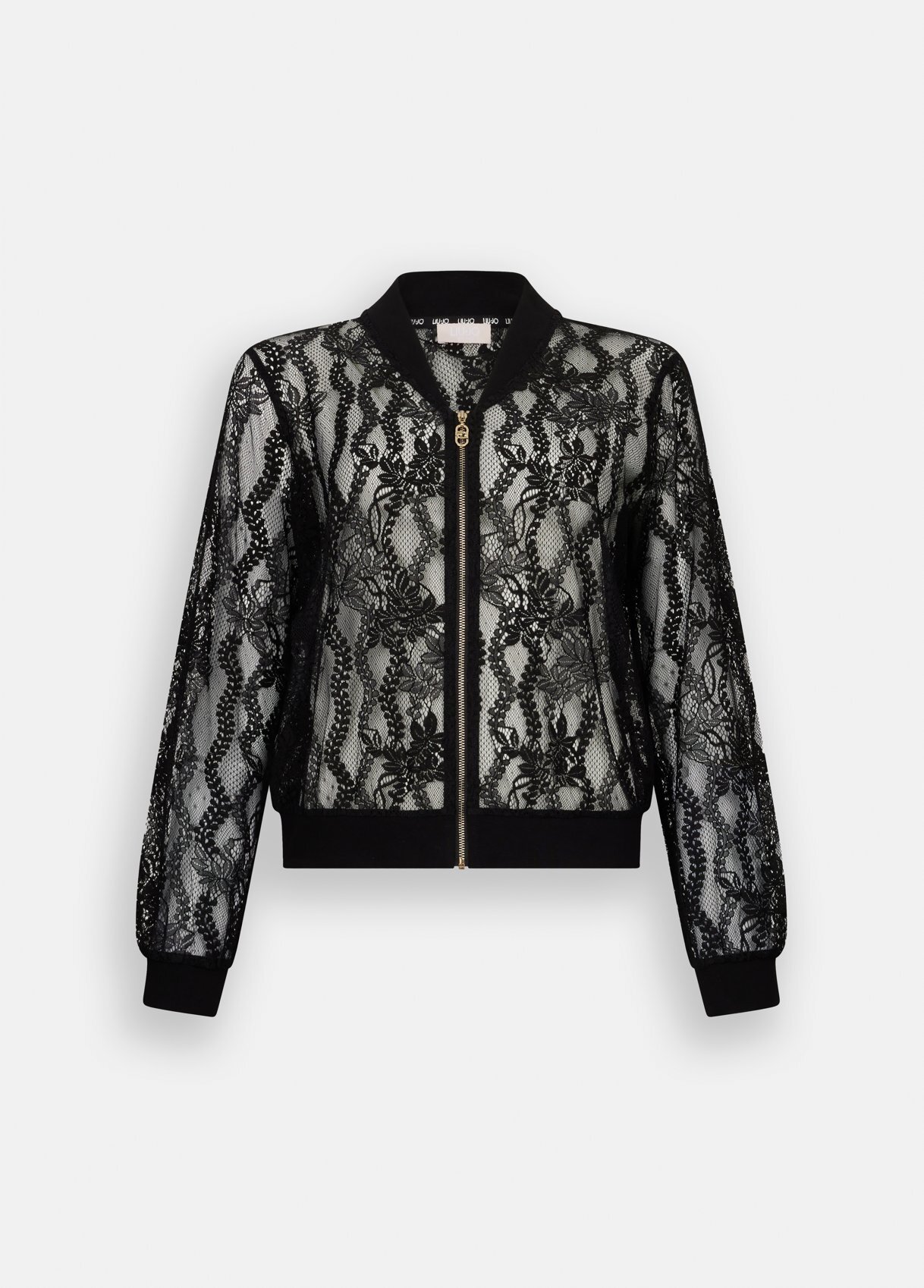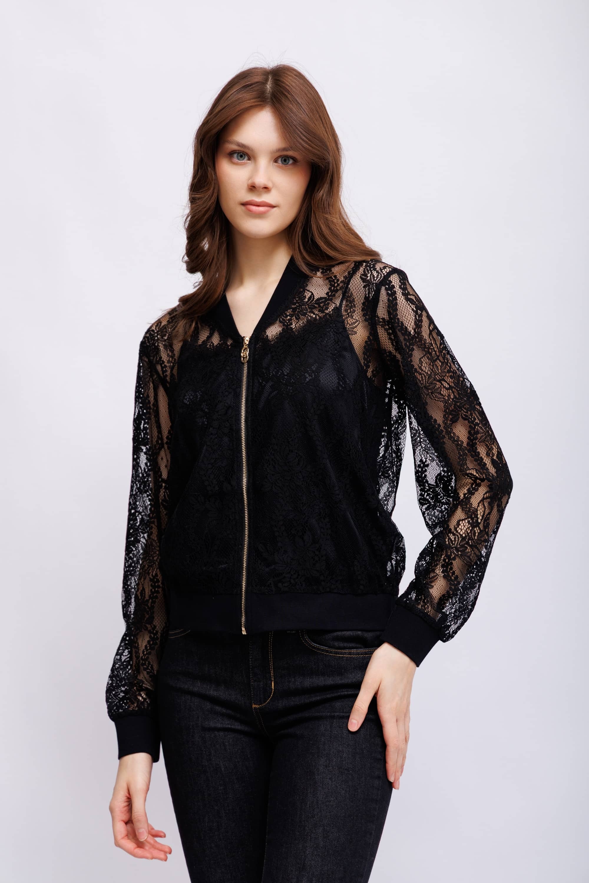 Бомбер из хлопкового кружеваДетали из джерсиВоротник трикотажный, полустойкаМеталлический логотип на спинеЗастежка-молния с логотипомРазмеры указаны