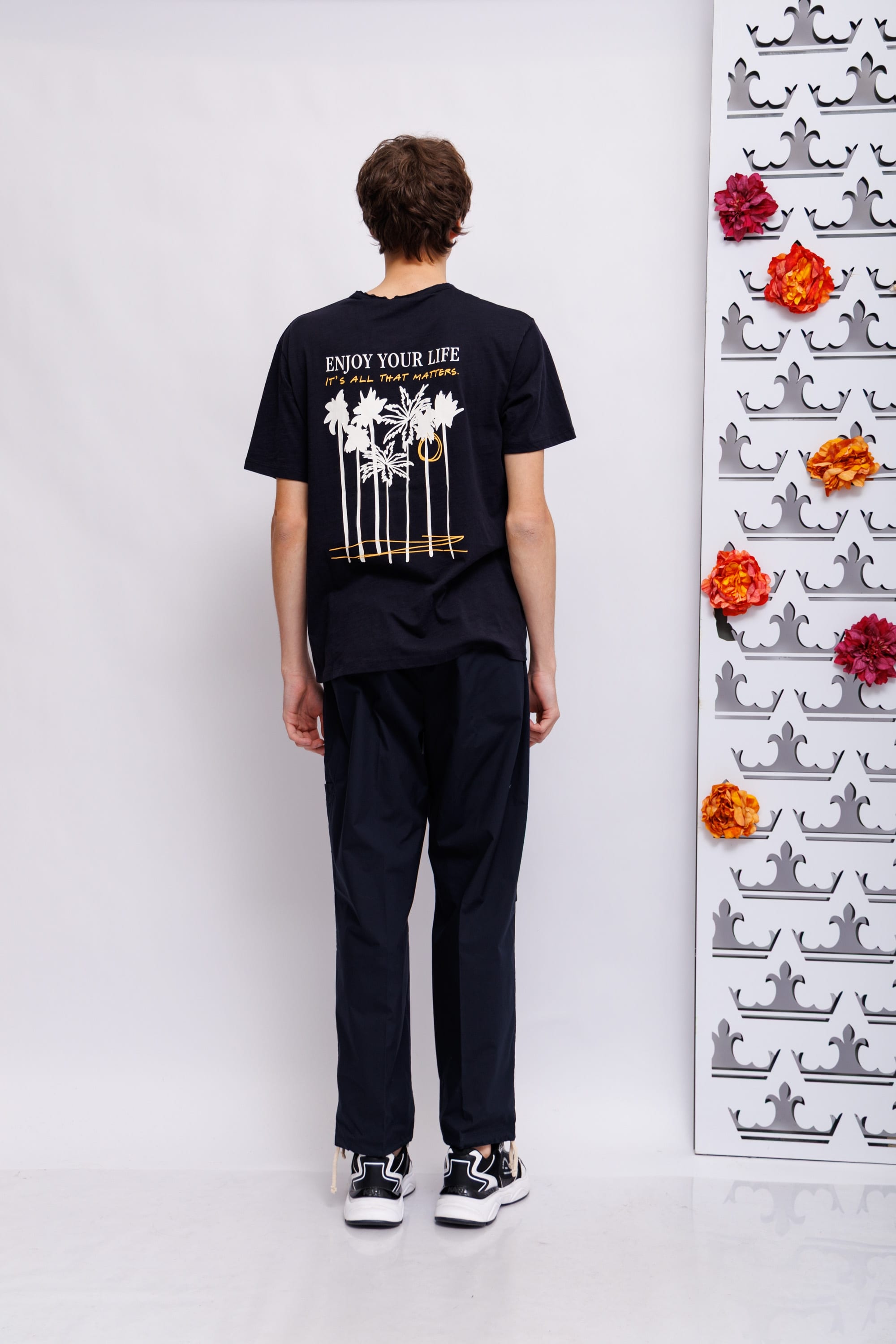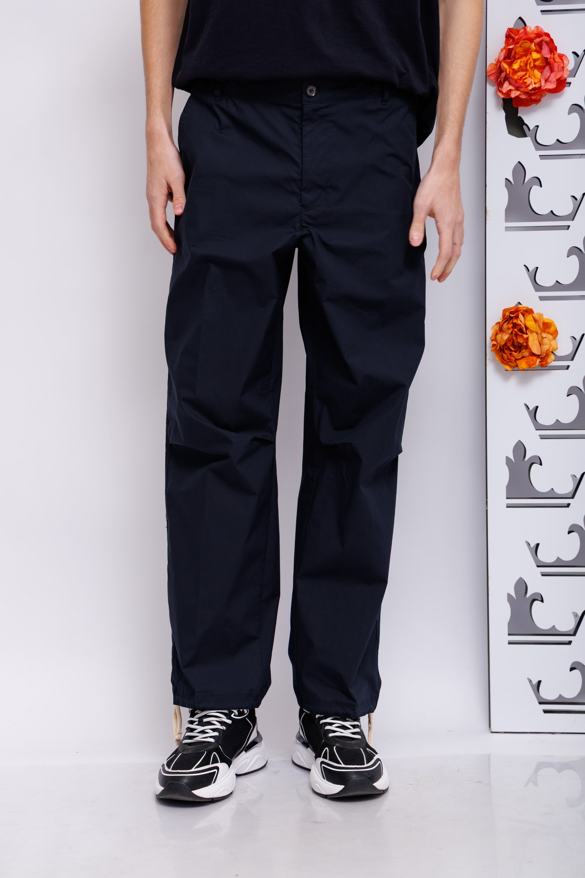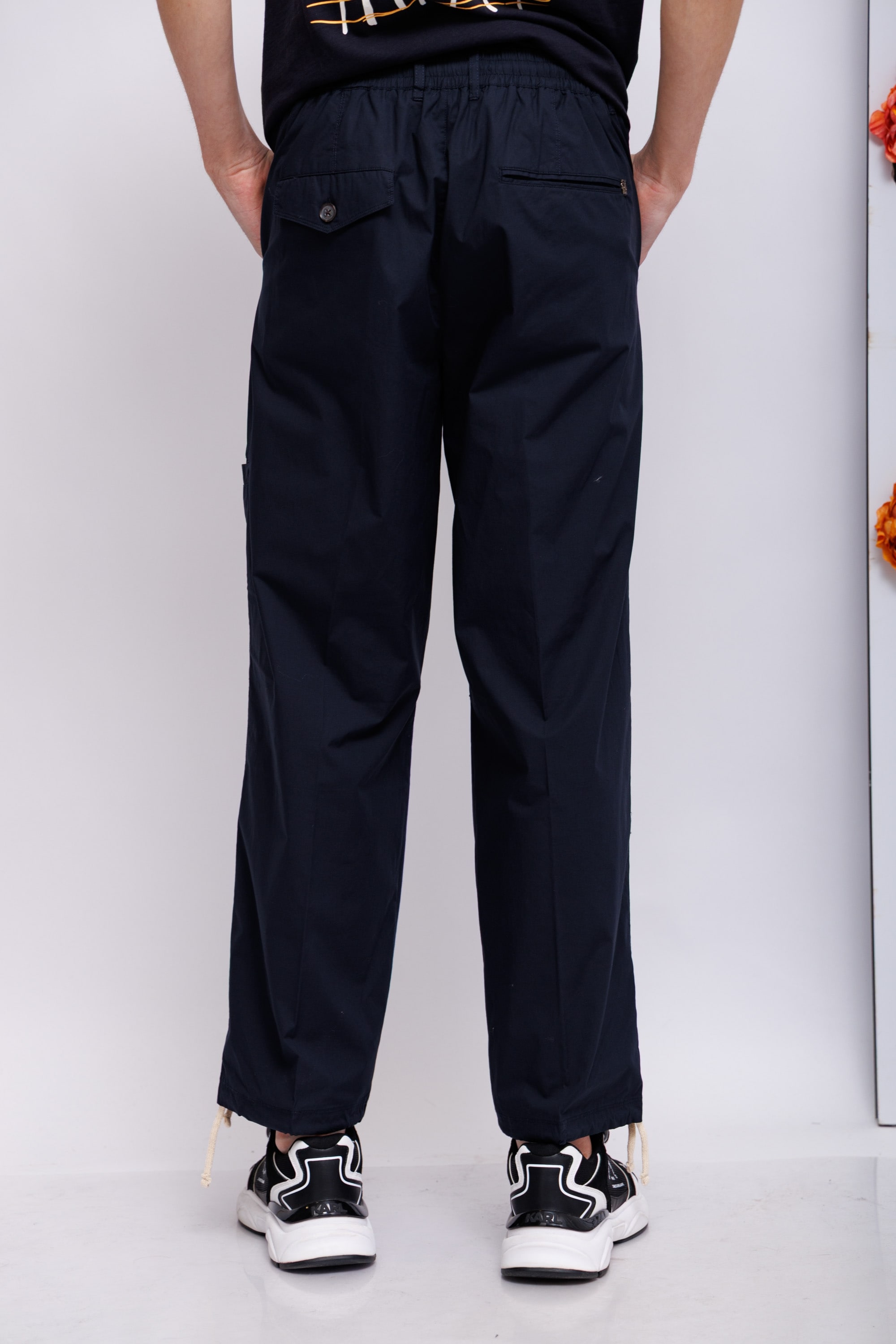 Брюки из поплинаКрой расслабленный широкийПояс эластичный на пуговицеКосые боковые карманыСзади- карманы-трансформеры: можно носить как карманы-рамки,так и карманы-клапаны на пуговицах