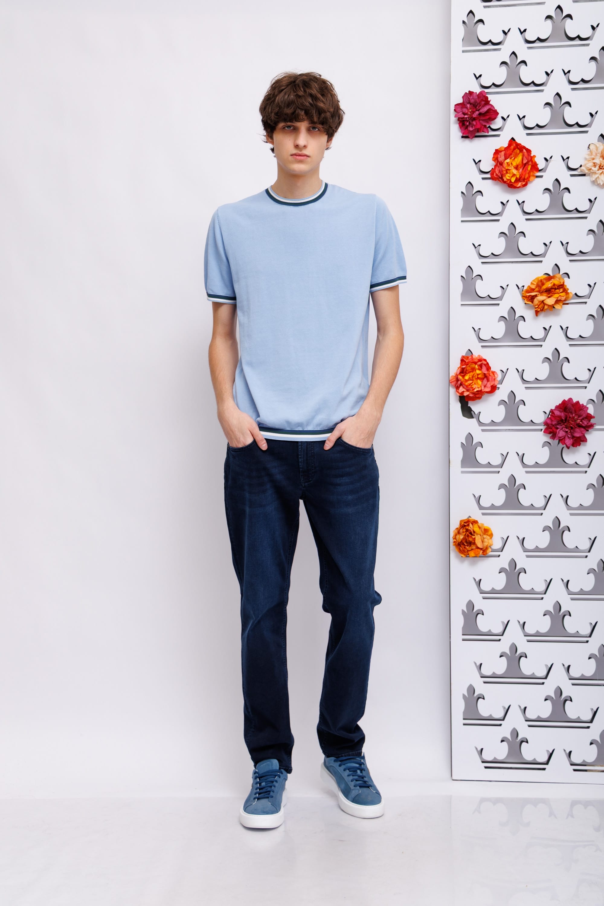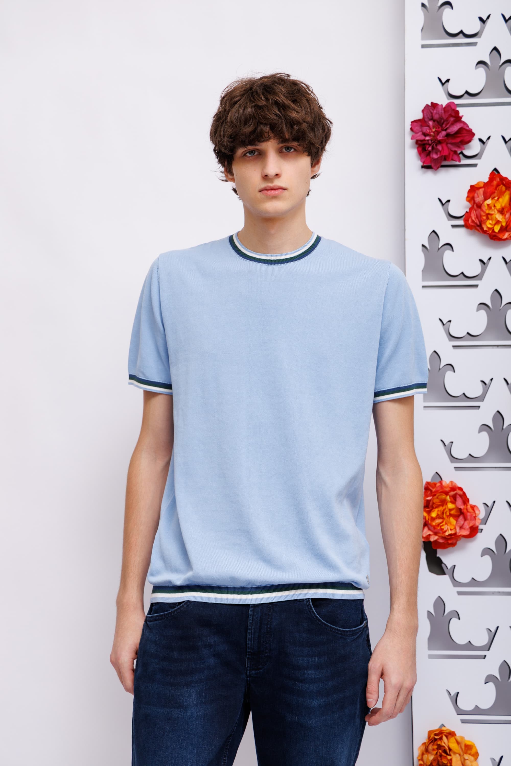 Джемпер голубого цвета с контрастной отделкойКруглый вырезКороткие рукаваСлегка приталенный кройМанжеты и низ изделия-эластичный ребристый трикотаж