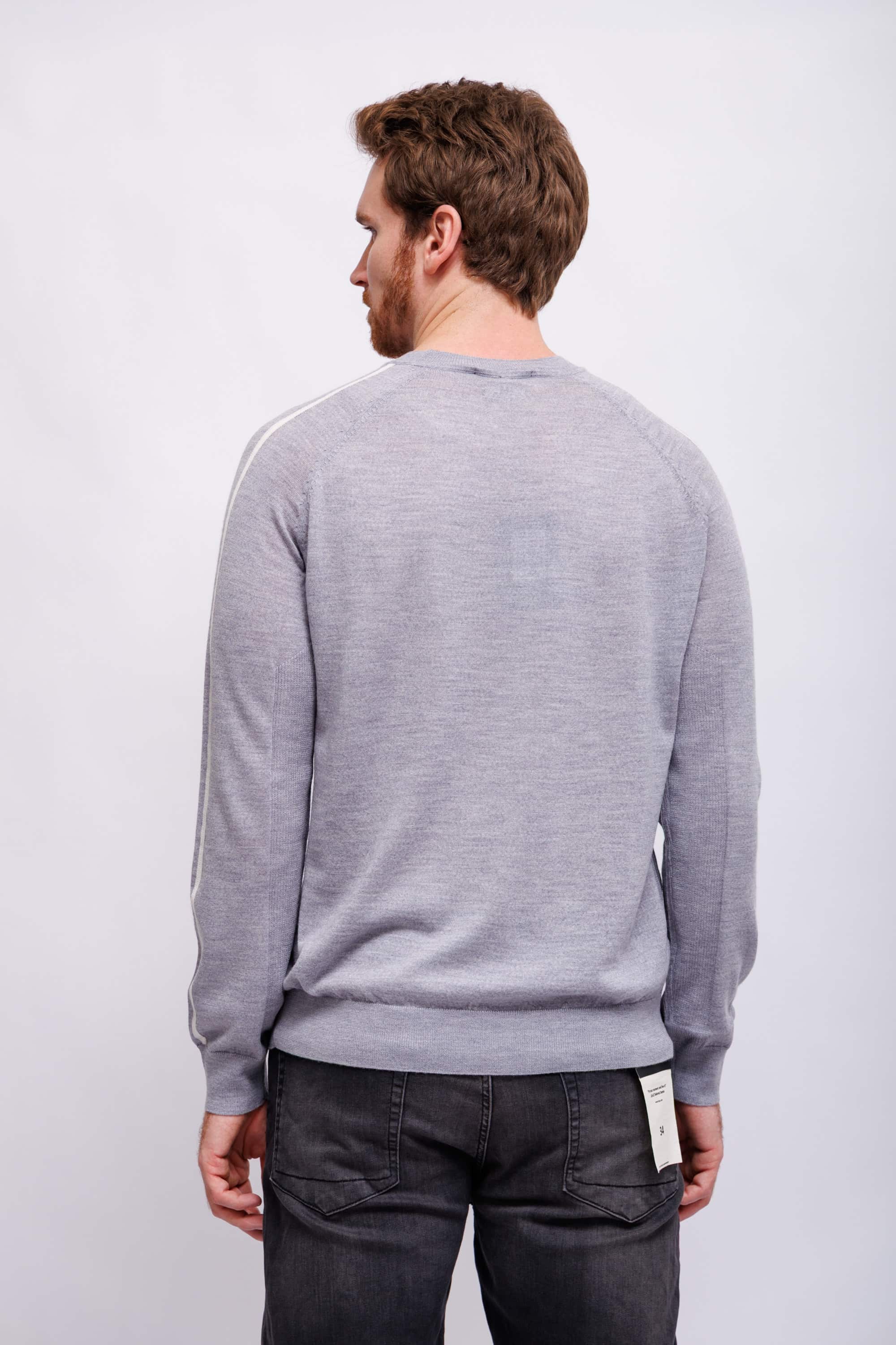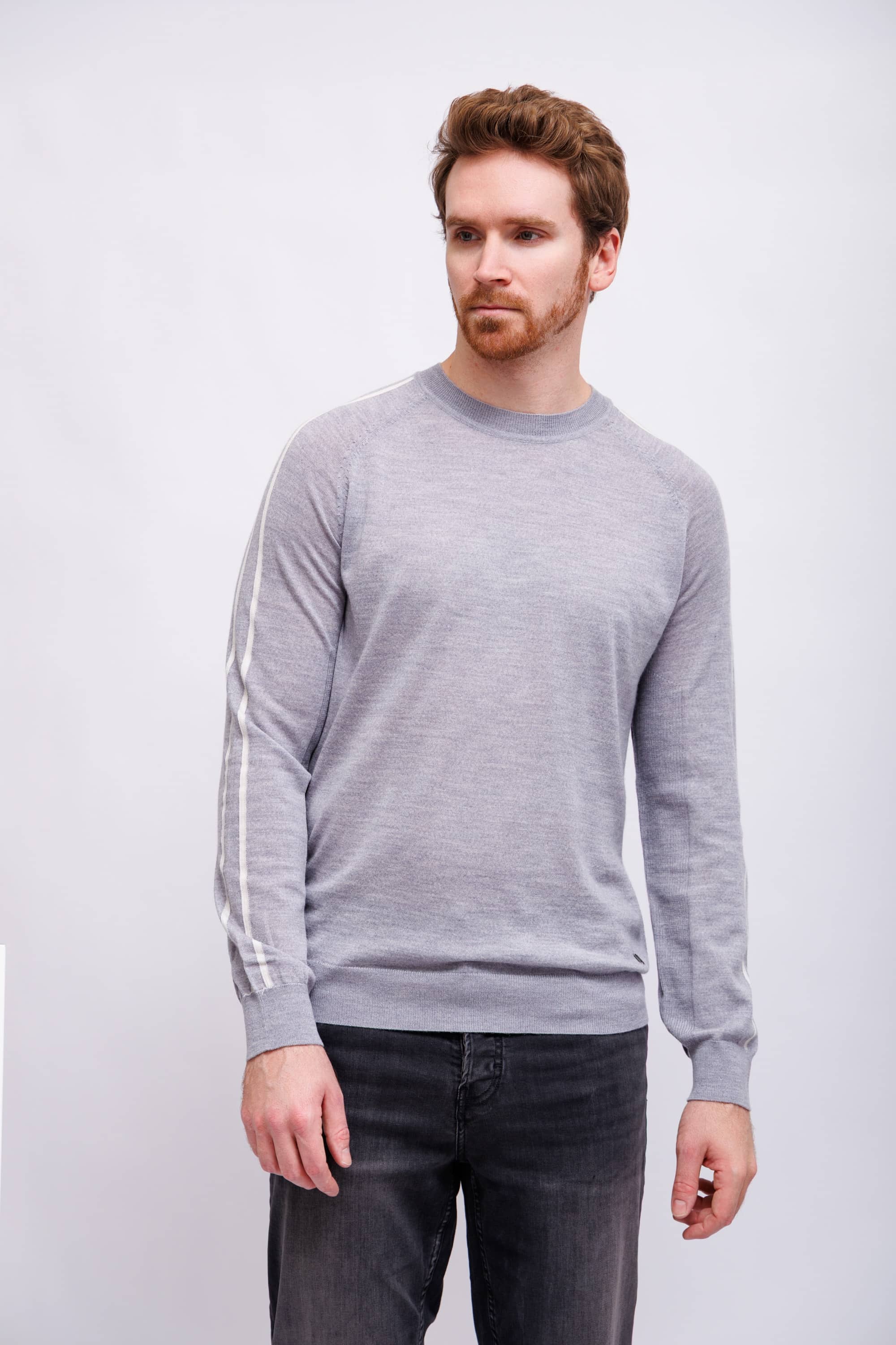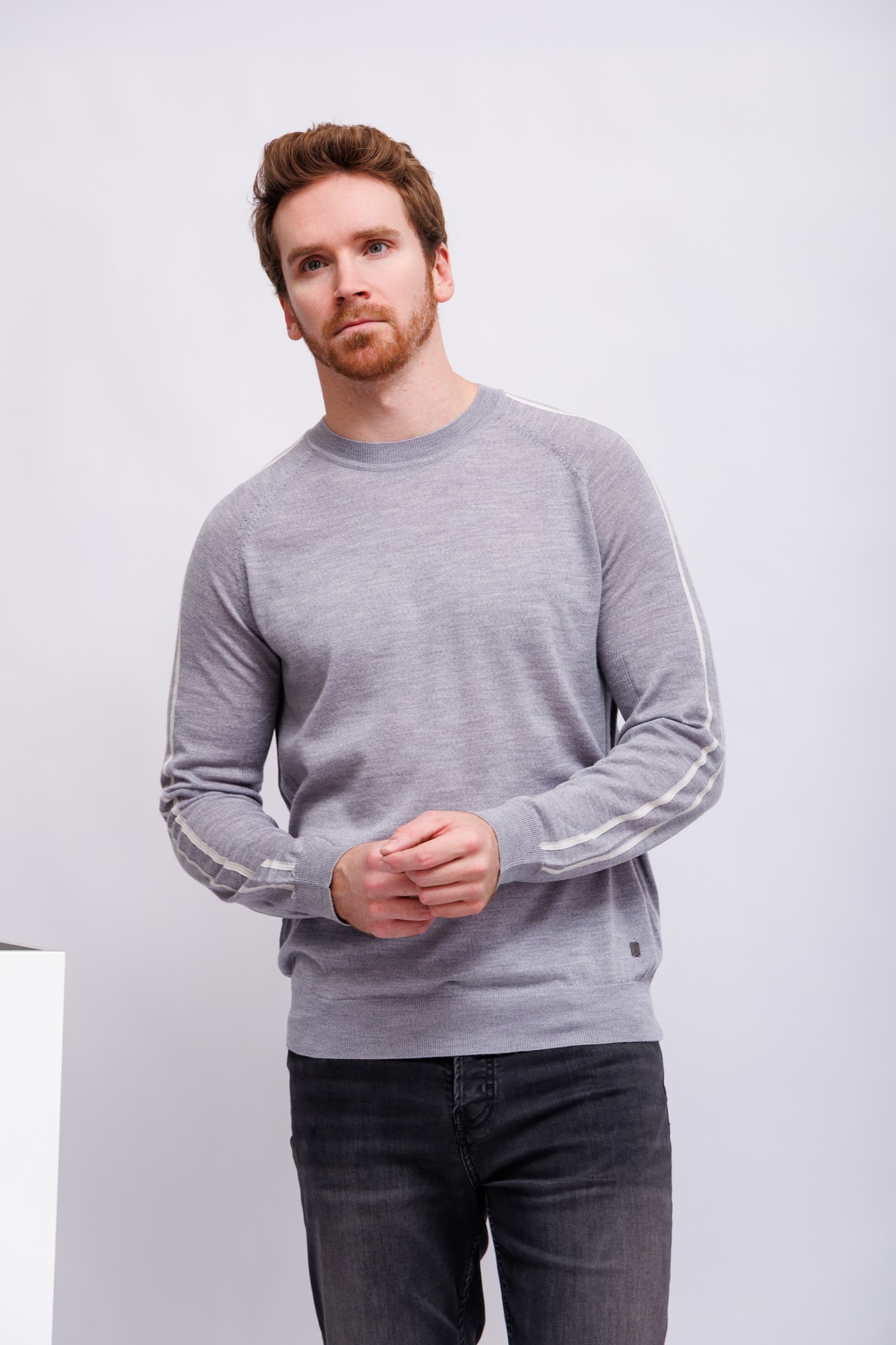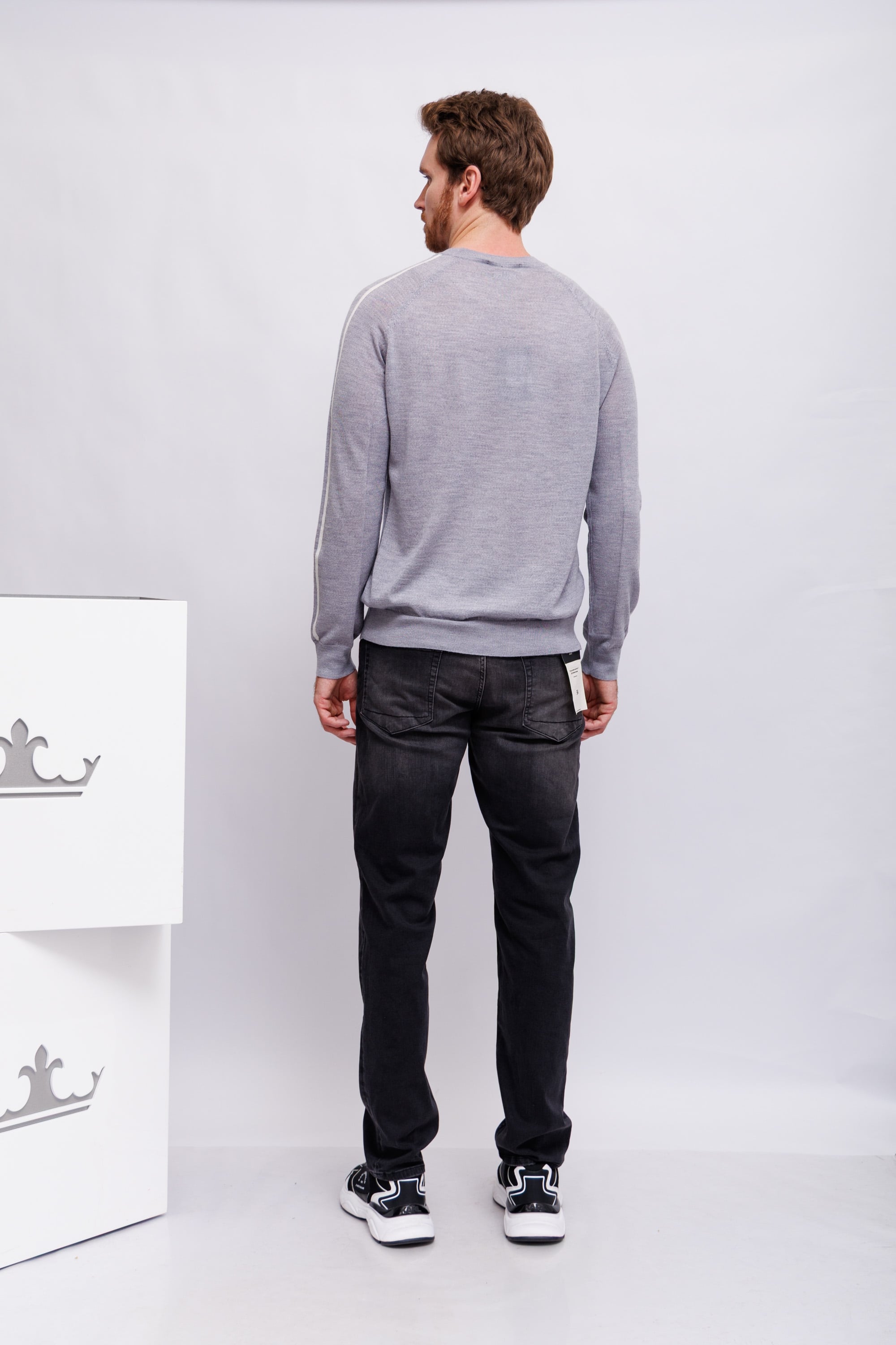 Джемпер светло-серого цветаКруглый вырезДлинные рукаваПрямой кройМанжеты и низ изделия-эластичный ребристый трикотаж