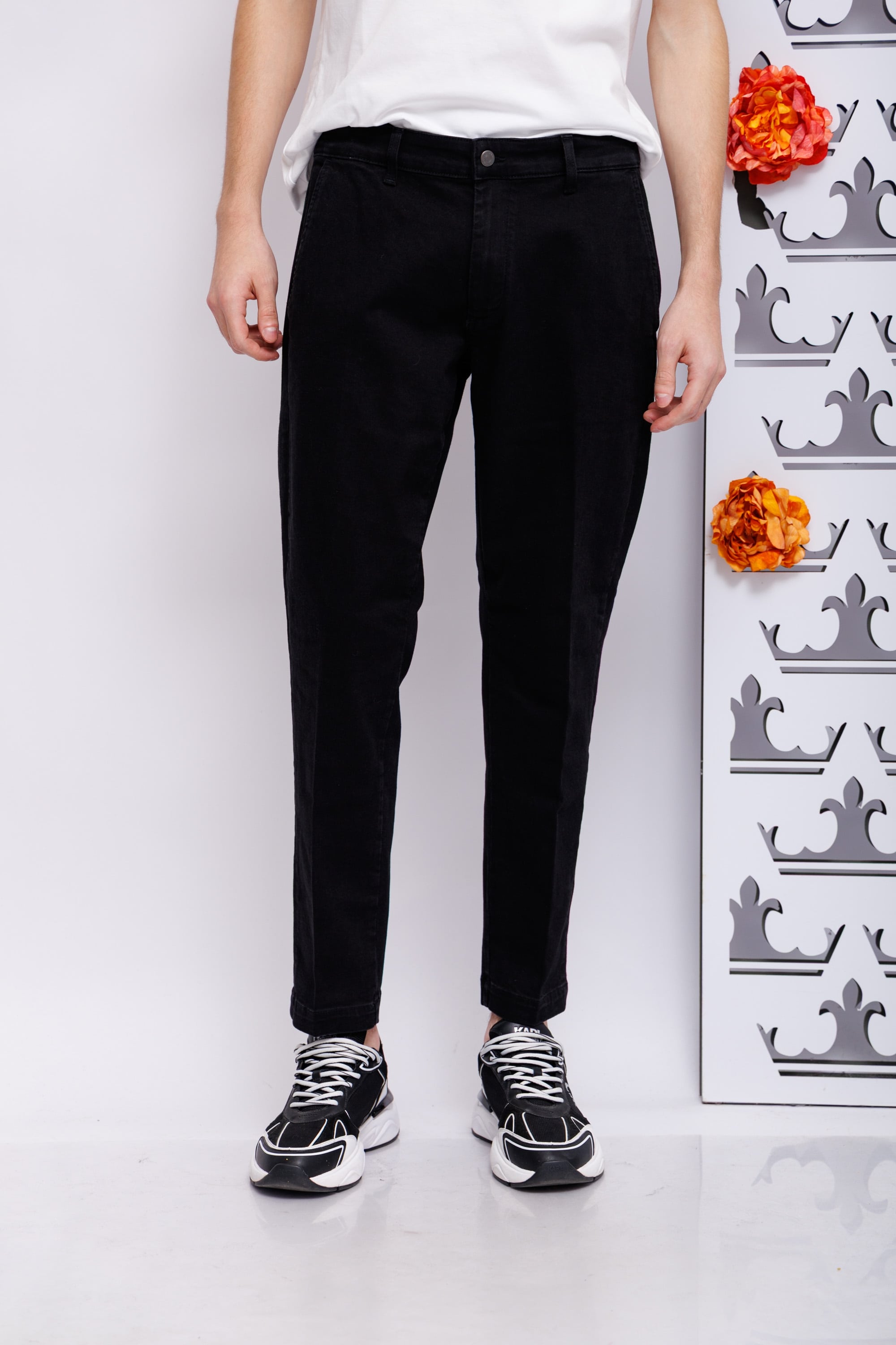 Джинсы-слаксы из черного хлопкаКрой расслабленный, слегка зауженныйПояс со шлевкамиГульфик на скрытой молнии и пуговицеКосые боковые карманыСзади- карманы-рамки