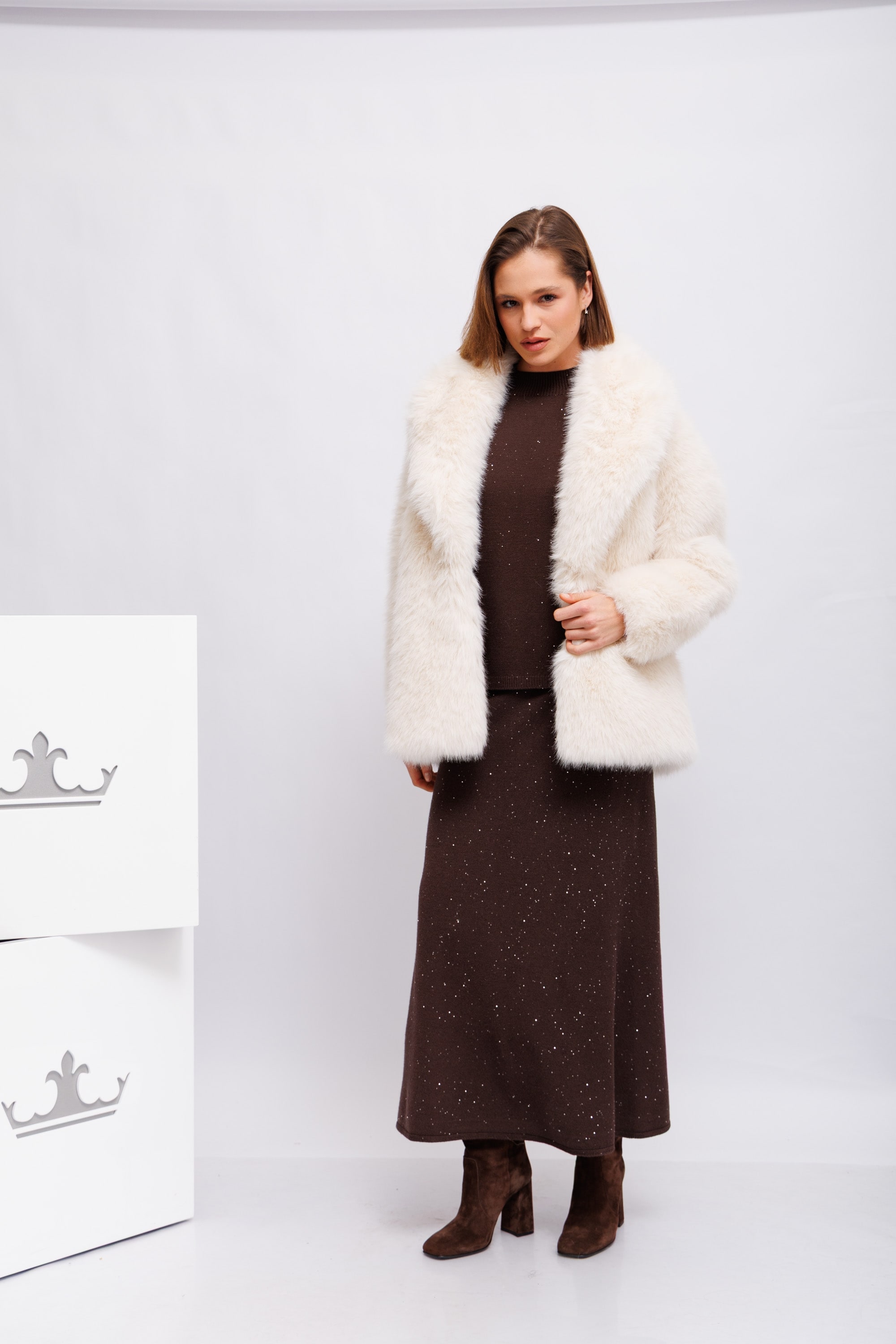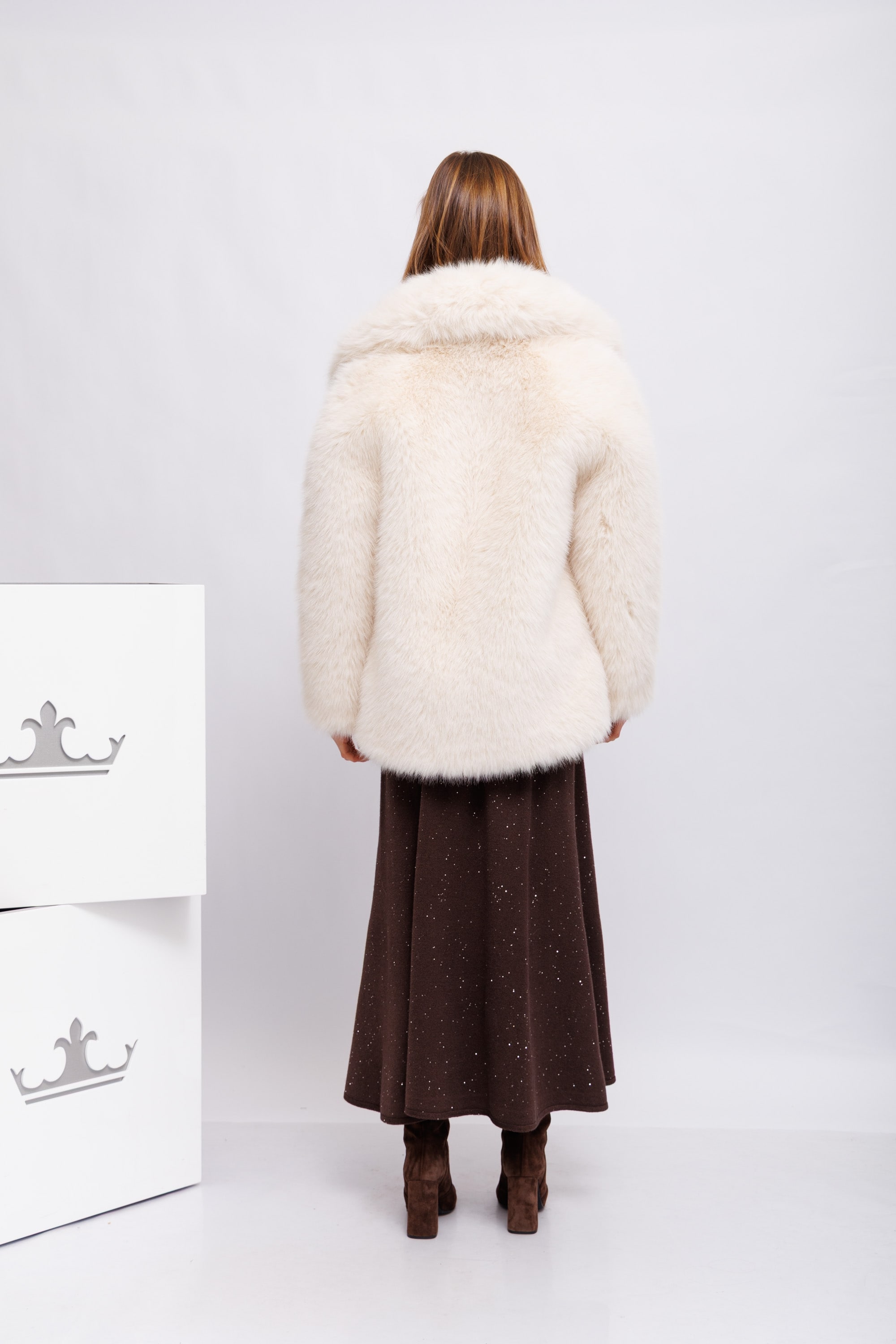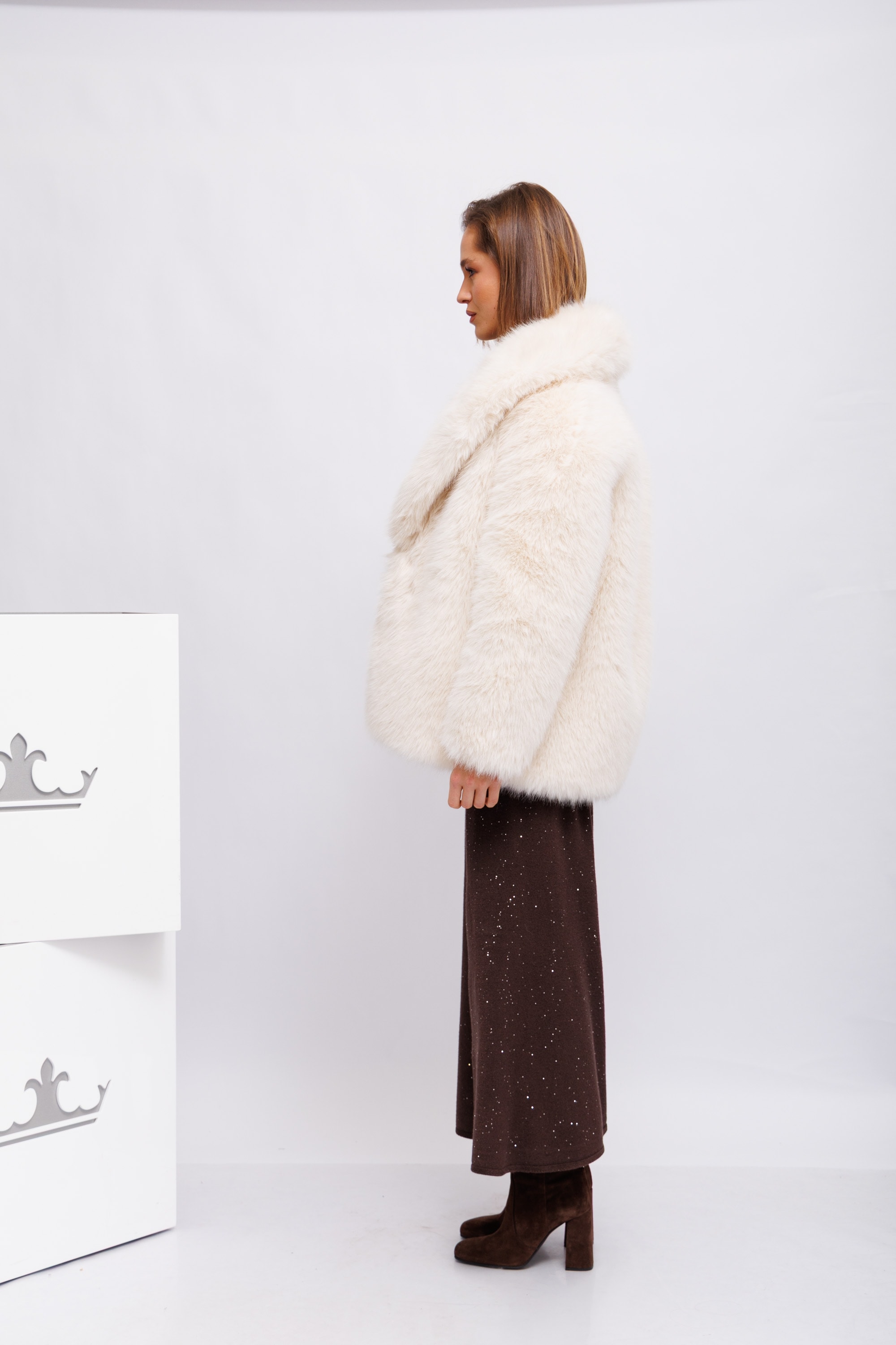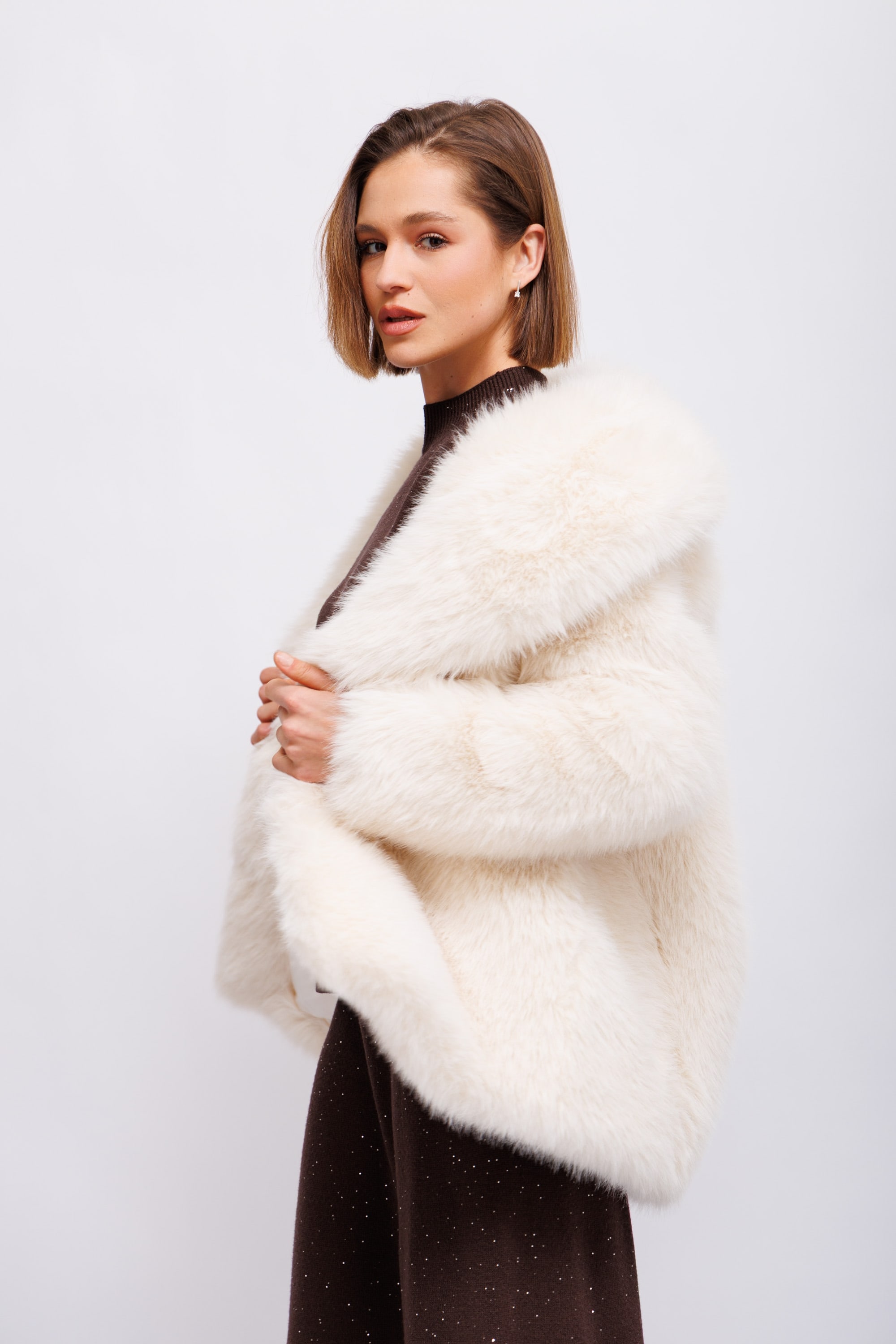 Искусственный мехВоротник с лацканамиКарманы по бокамЗастежка на маленький невидимый крючокНа подкладке