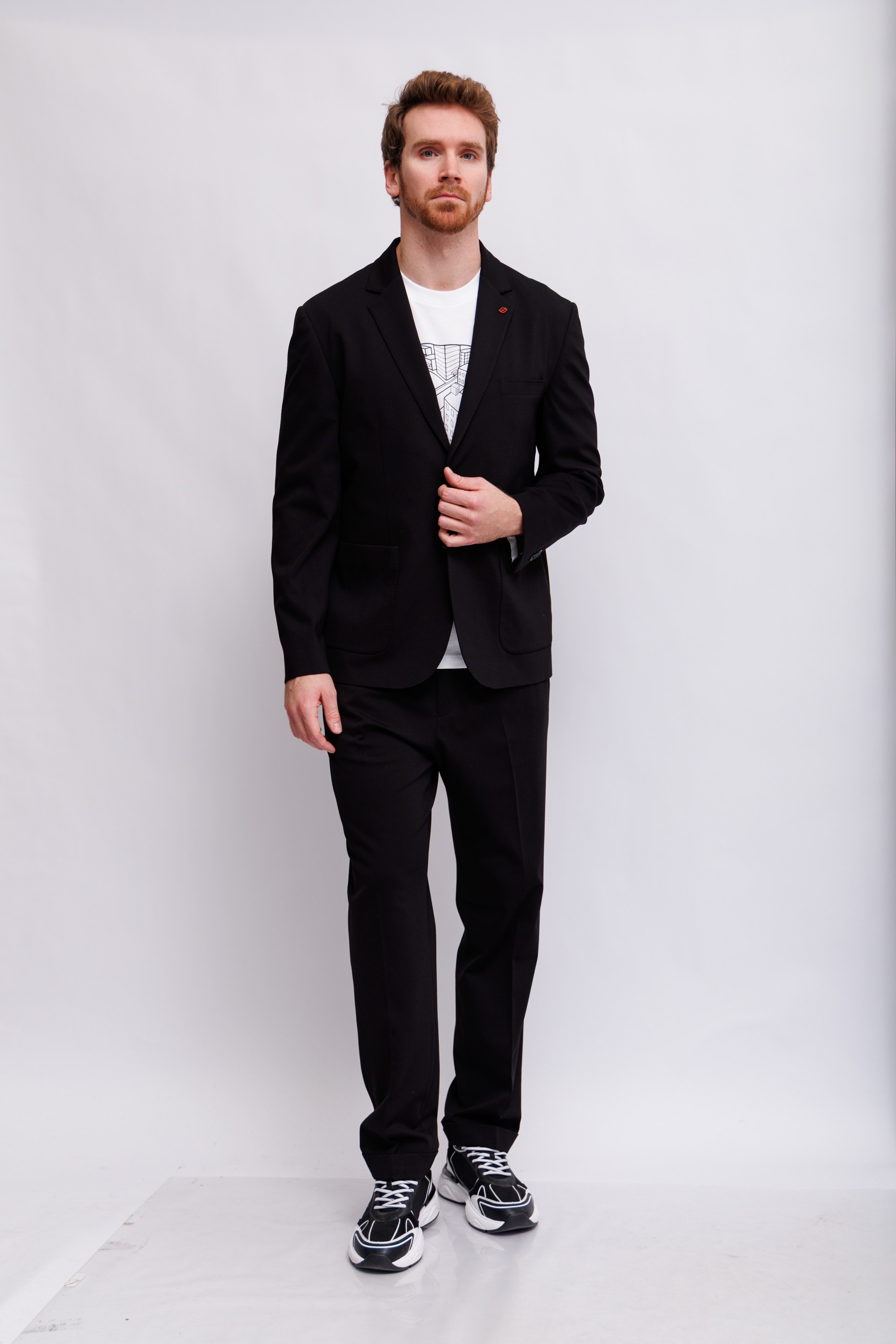 Черный цветСлегка приталенный кройЛацканы классические2 пуговицы2 шлицыКарманы накладныеНа груди- карман-листочкаНа рукавах- прорезные петли и "целующиеся"(соприкасающиеся) пуговицы