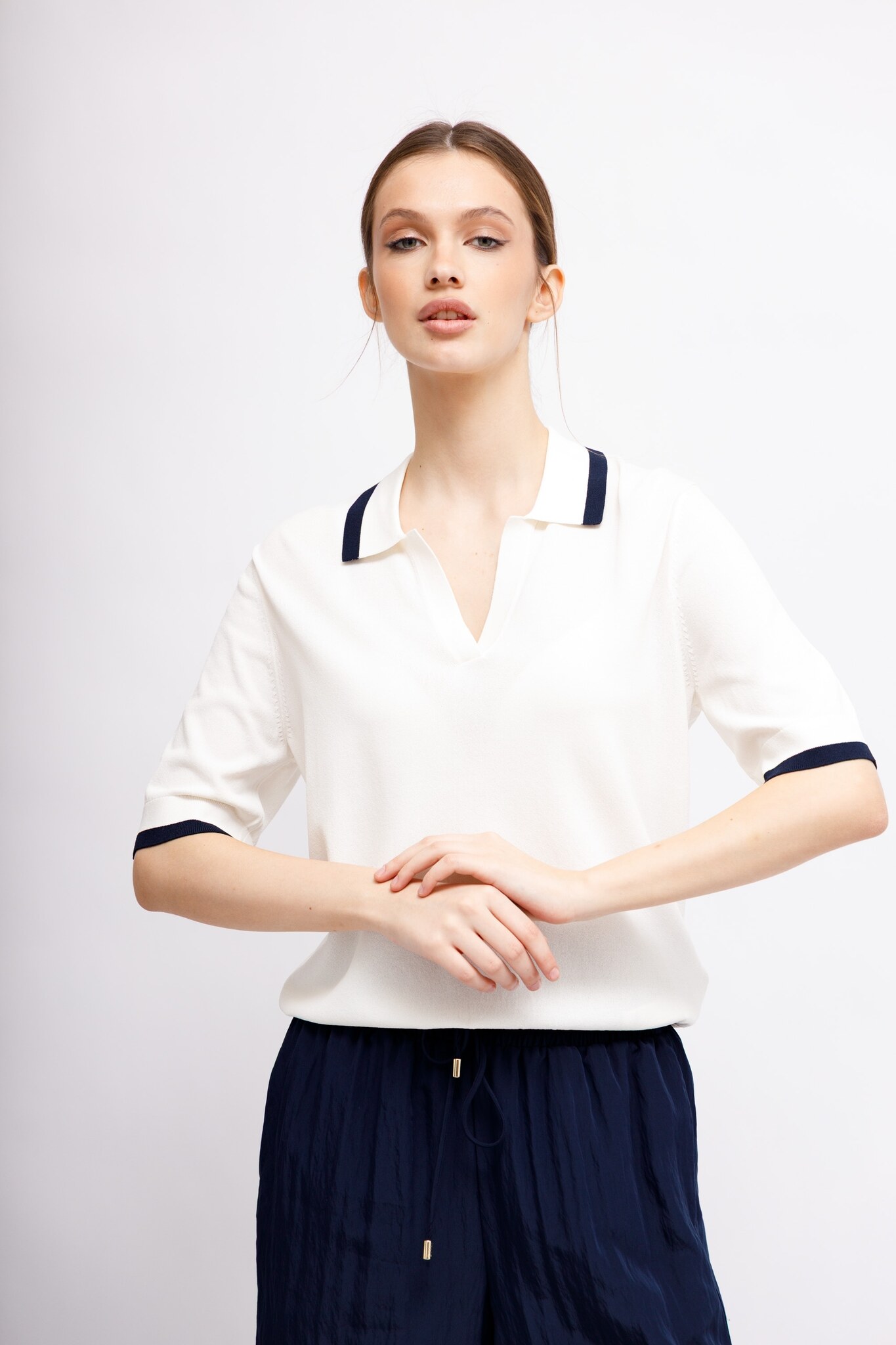 Молочный джемпер -поло с короткими рукавами и темно-синей отделкой из смесовой вискозы