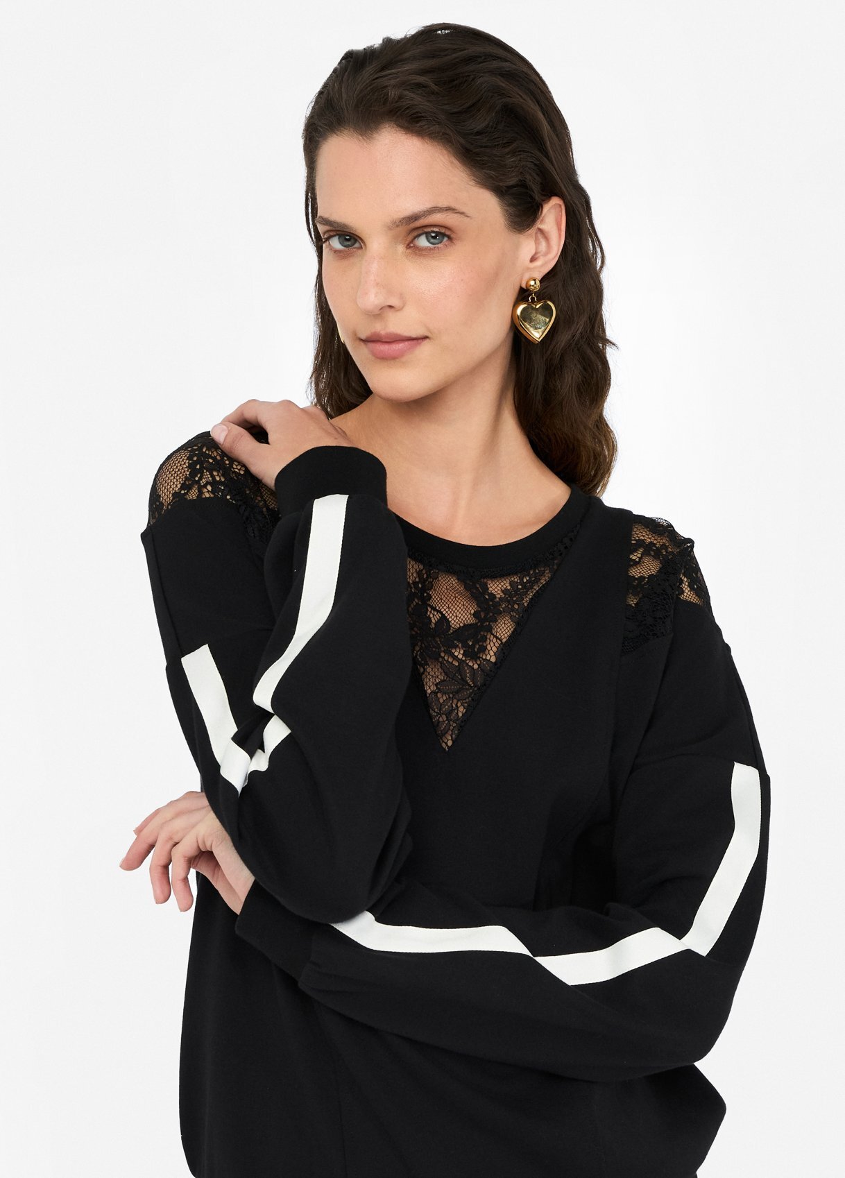 Свитшот из эластичного хлопкового интерлокаКонтрастные боковые полосыКружевные деталиКруглый вырез горловиныМеталлический логотип на спинеРазмеры указаны