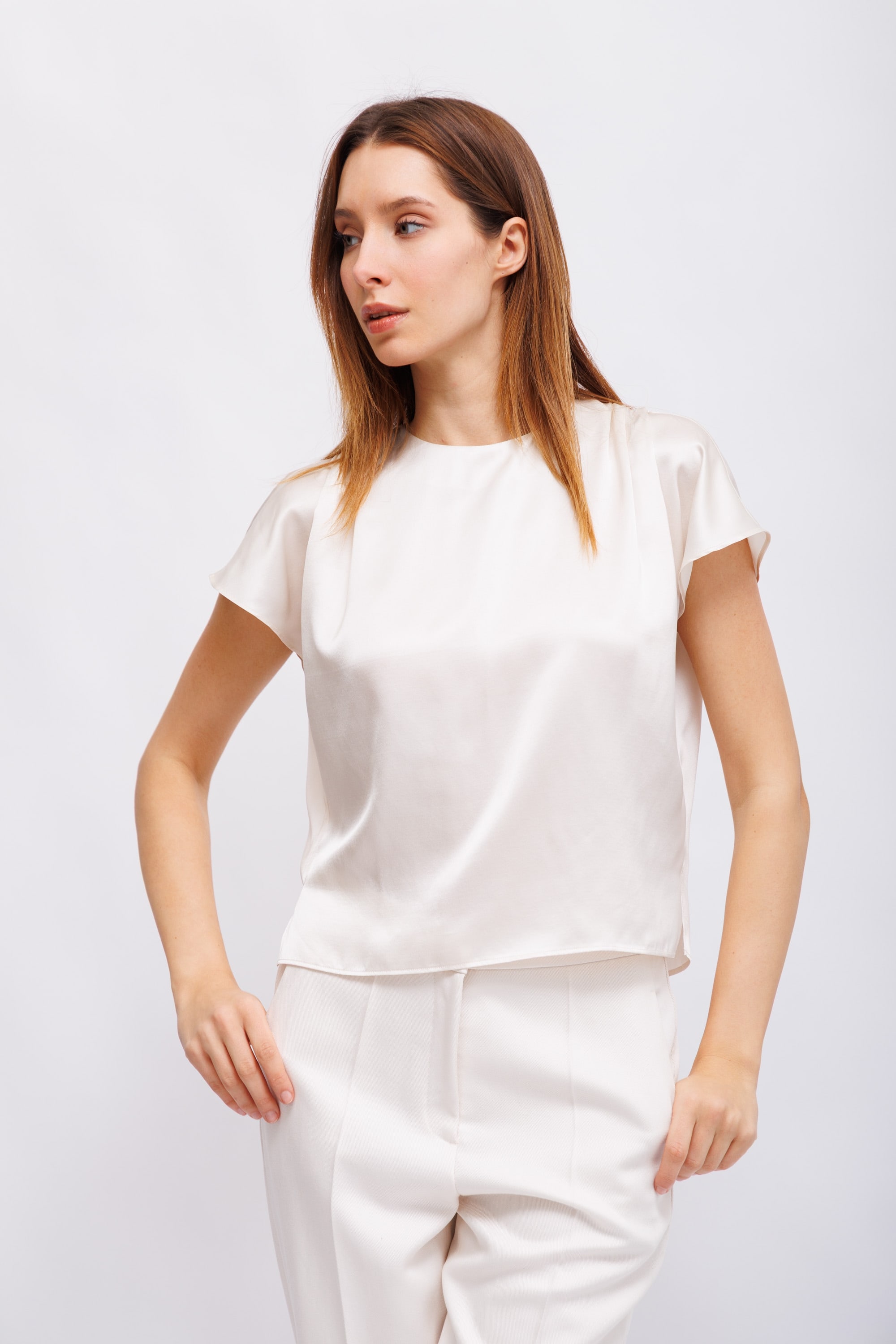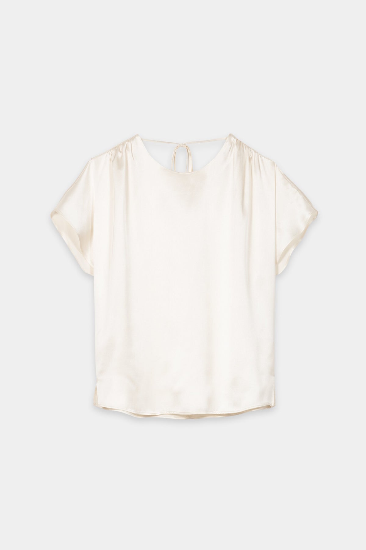 Блузка свободного кроя из струящегося шелка с элегантным атласным переплетением, круглым вырезом, присборенными плечами и короткими рукавами-крылышками. Спинка имеет изысканный дизайн с глубоким V-образным вырезом и завязкой. Спущенные плечи. Боковой разрез по низу