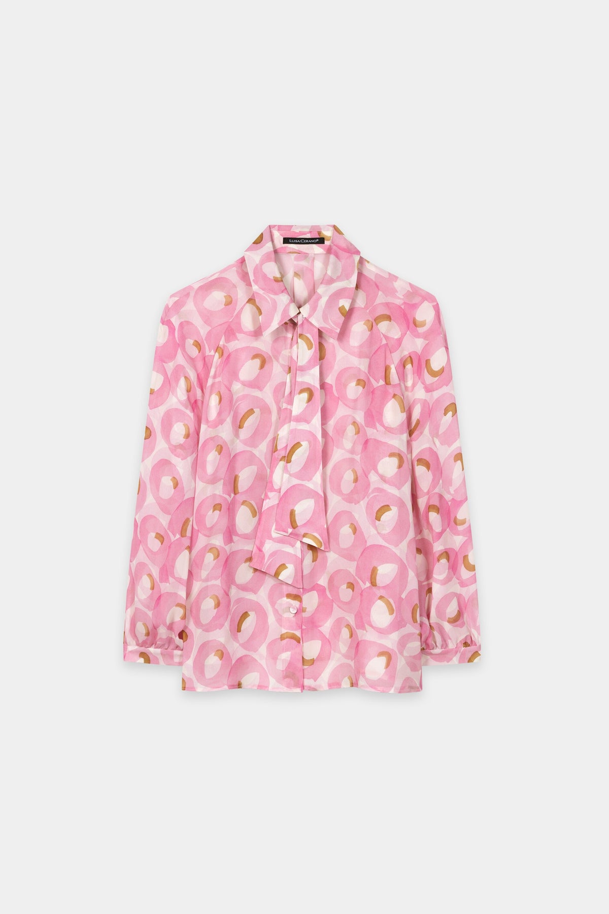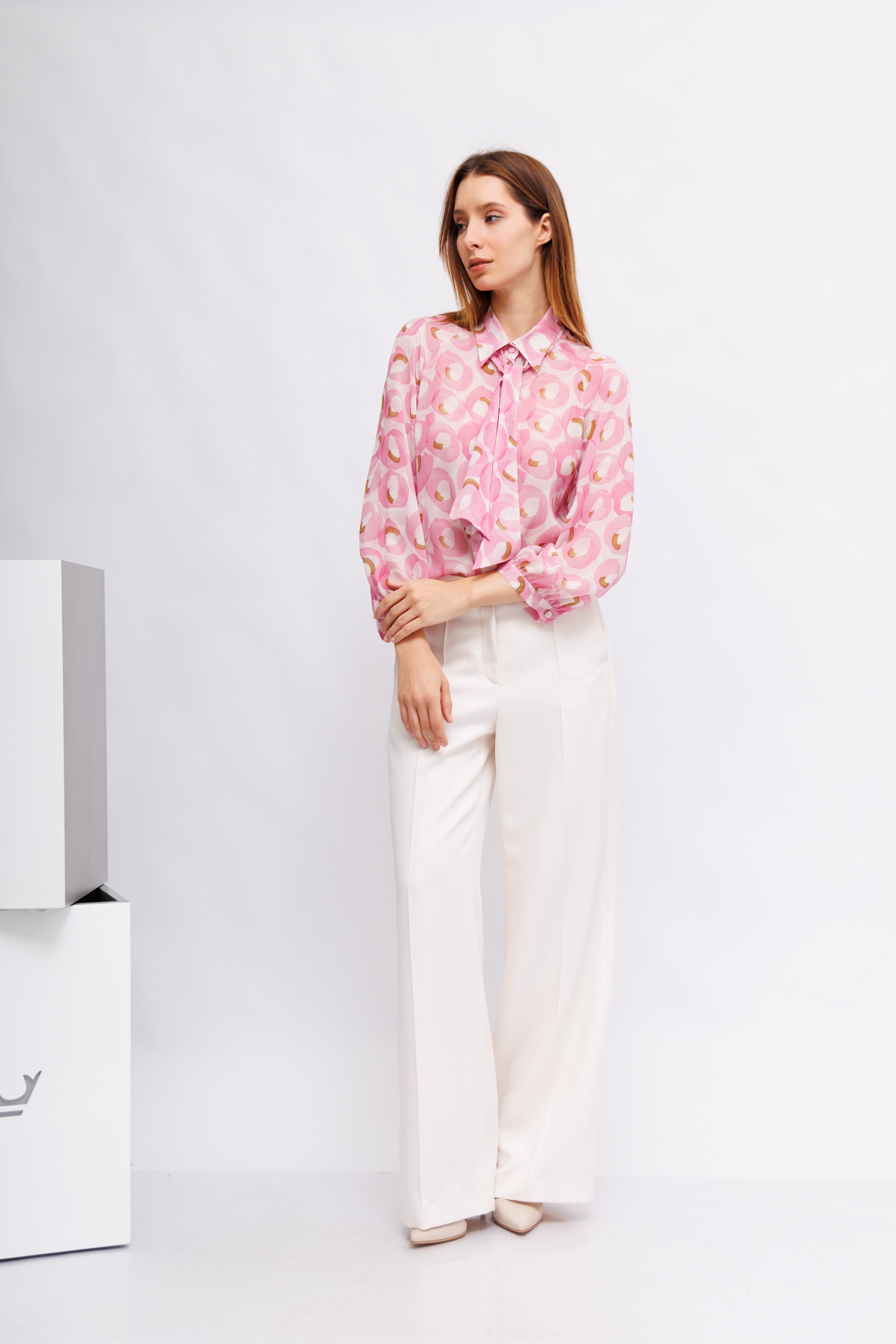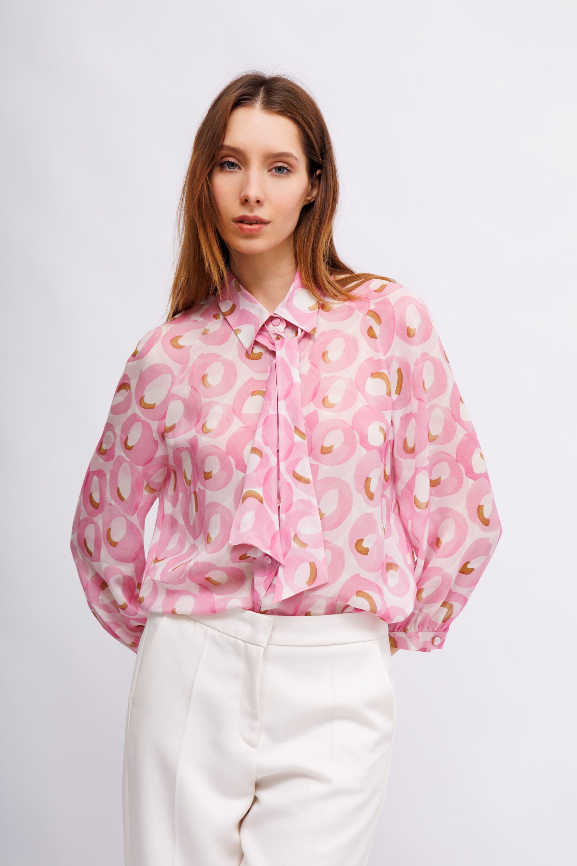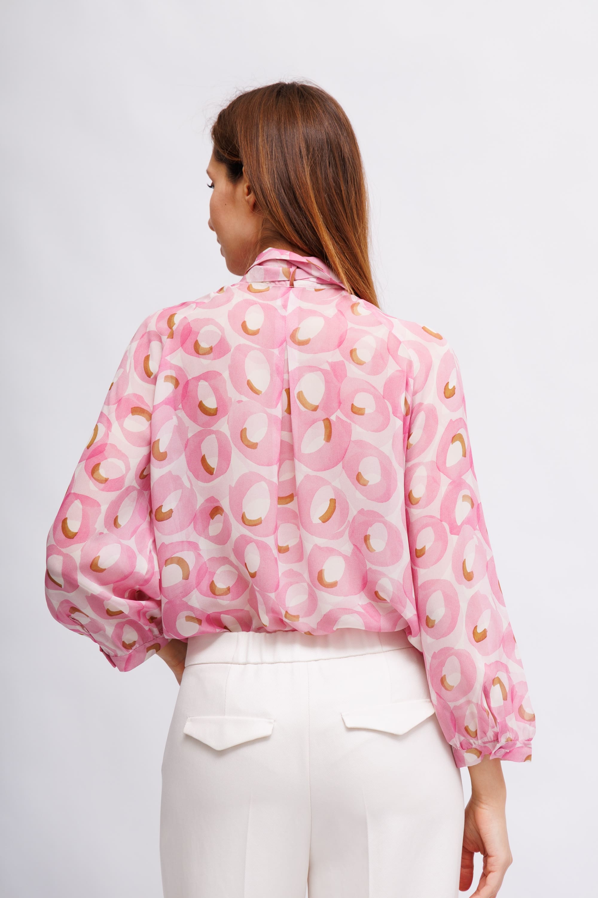 Полупрозрачная блузка-рубашка из струящегося вискозного крепа с эксклюзивным ретро-принтом, отворотом и рукавами-фонариками. Пуговицы на манжетах и планке обтянуты тканью. Складка на спине