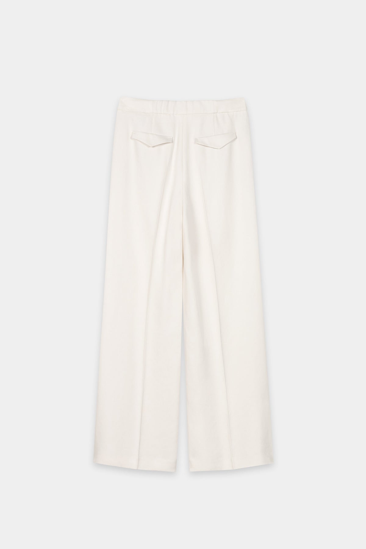 Удлинённые брюки с широкими брючинами из мягкой саржевой ткани со складками и двумя прорезными карманами. Сзади два декоративных накладных кармана.