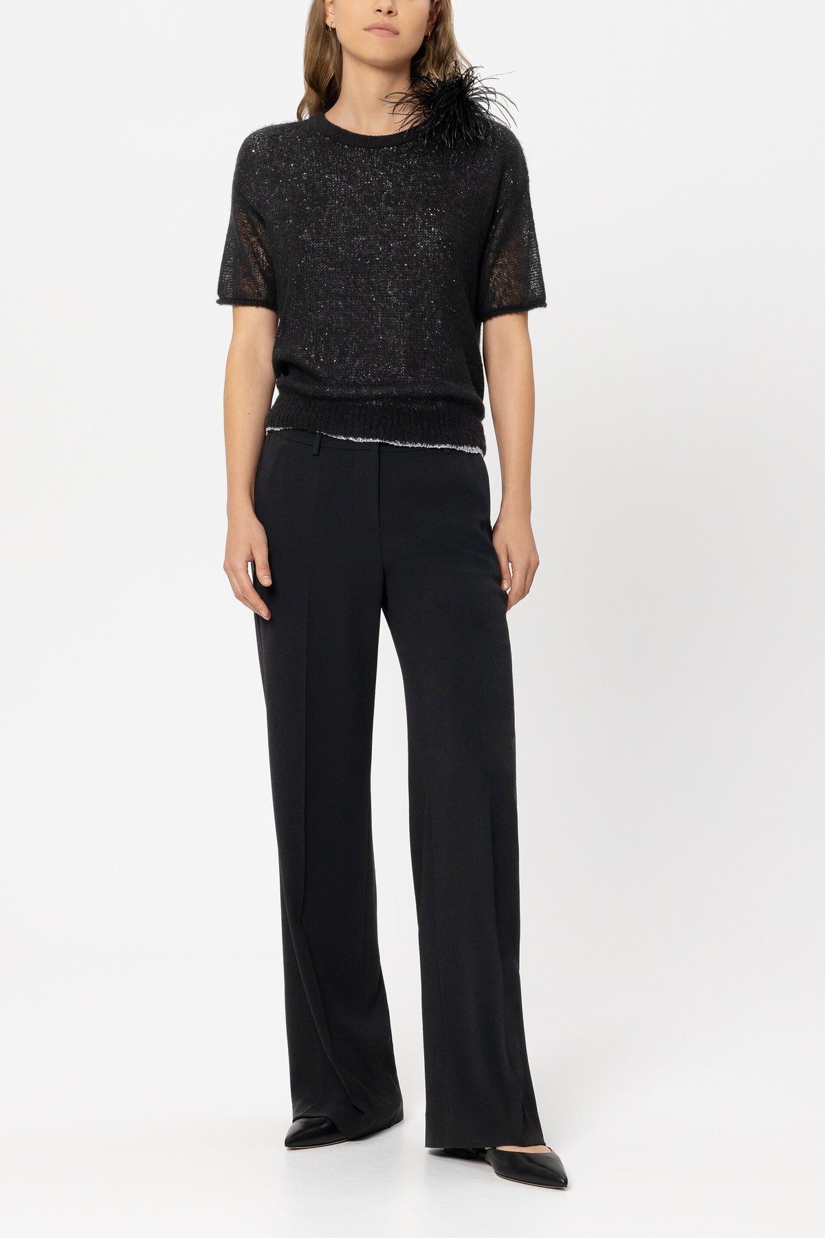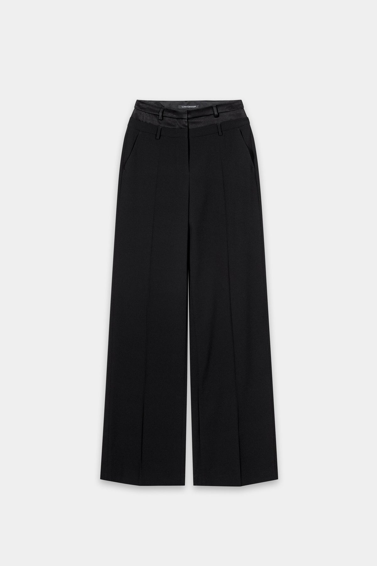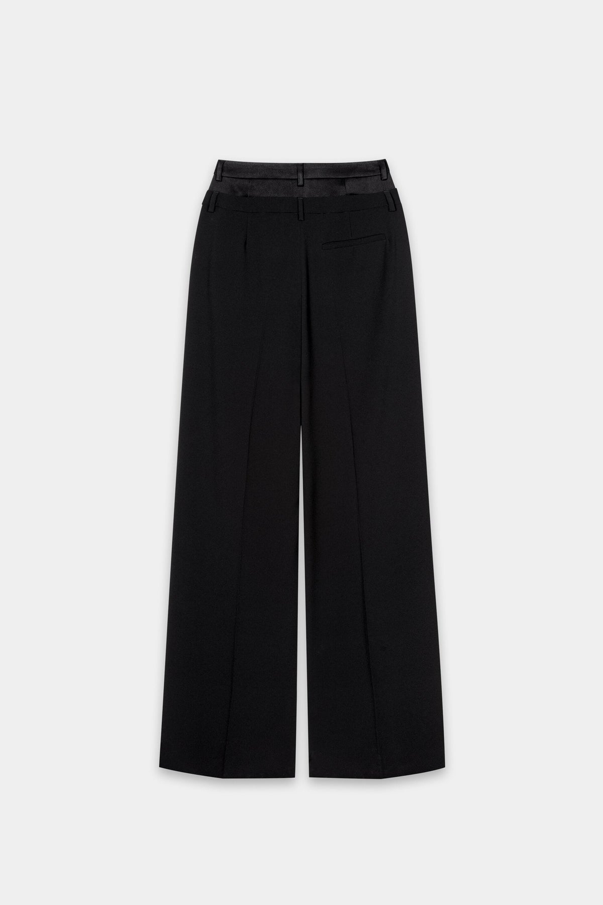 матовой поверхности с акцентированными широкими штанинами и складками. Дополнительный пояс с контрастным атласным блеском. Двойной пояс с петлями для ремня