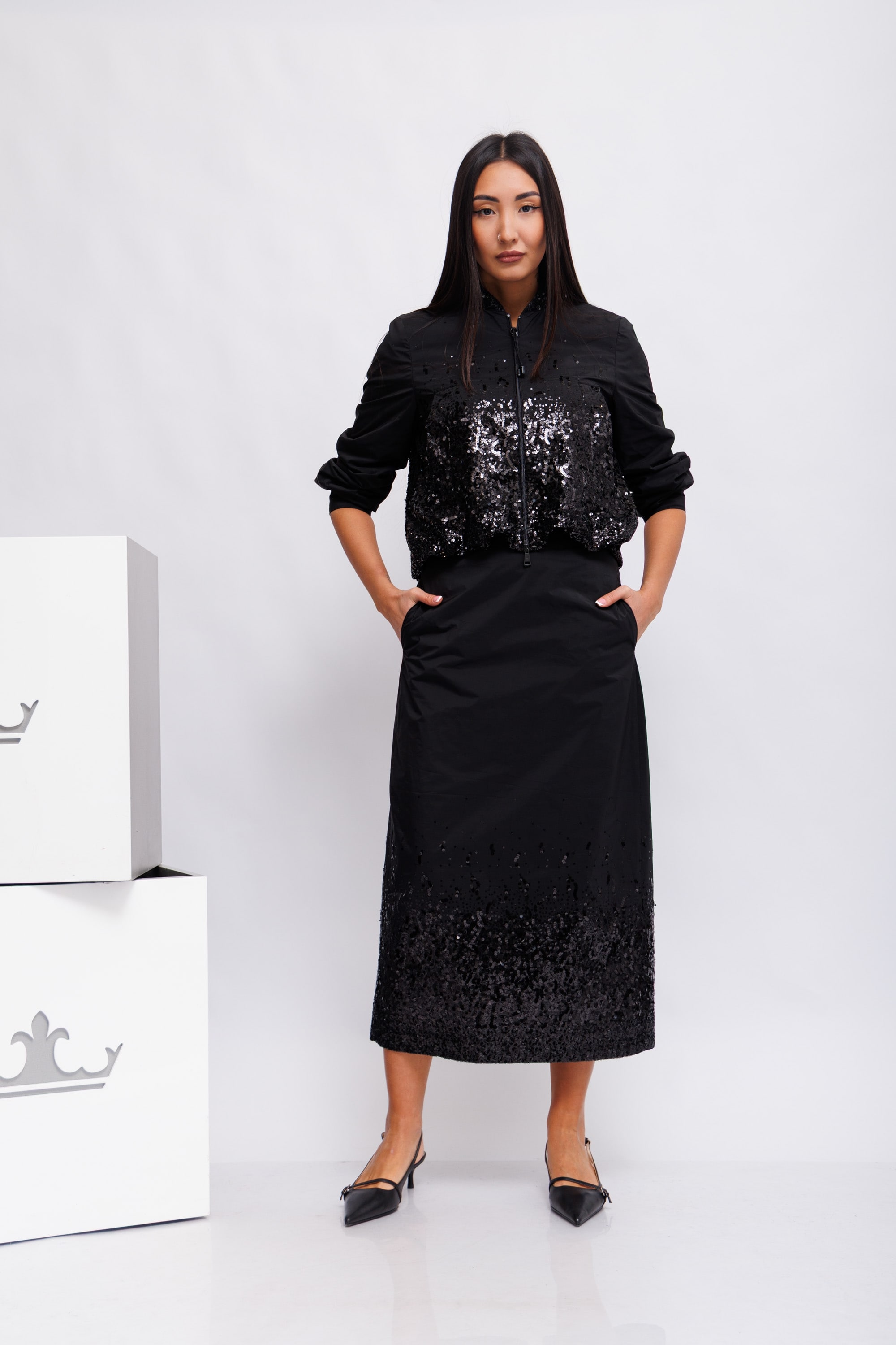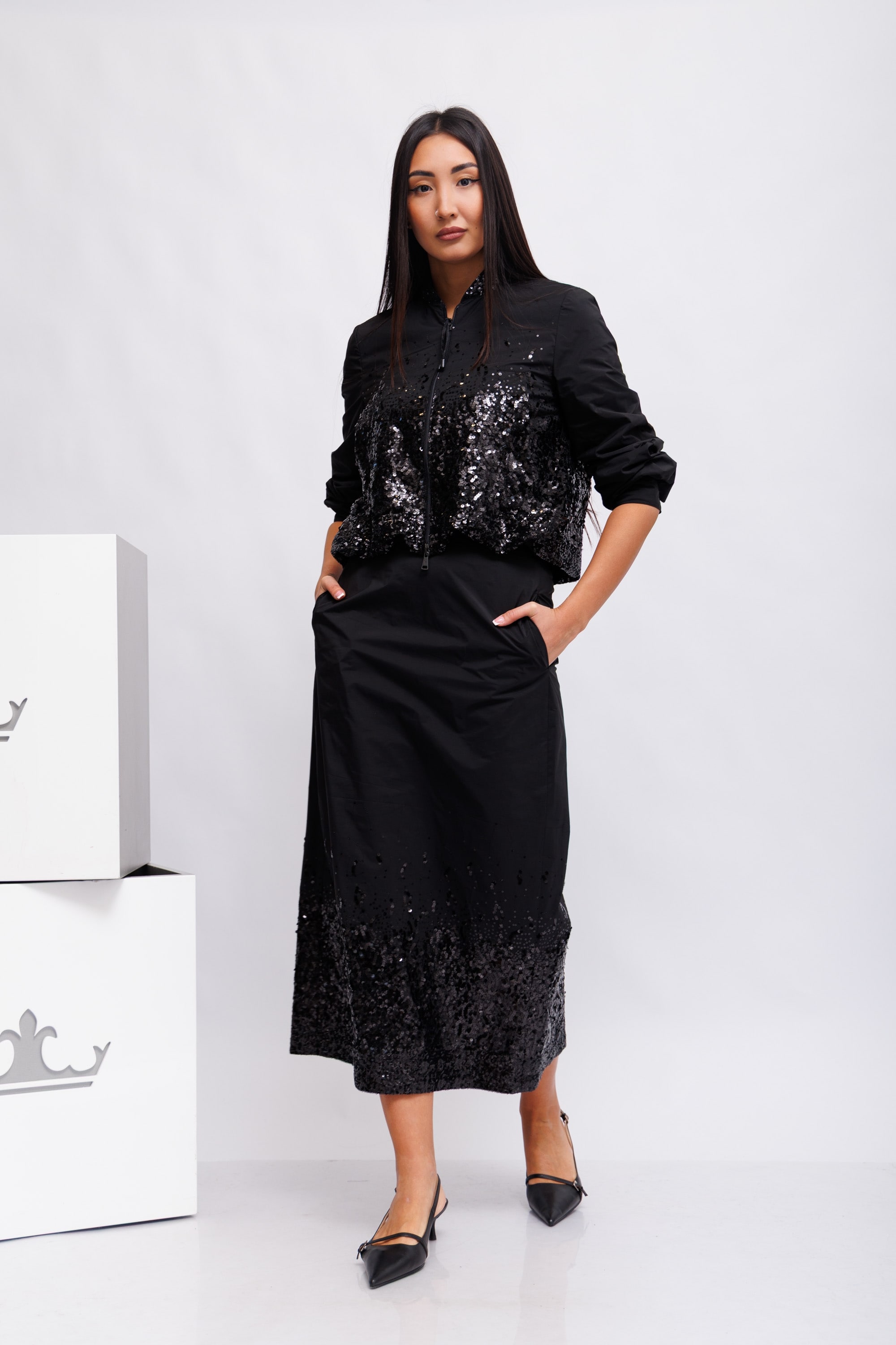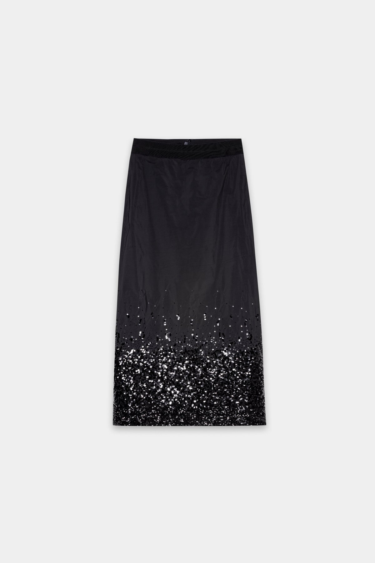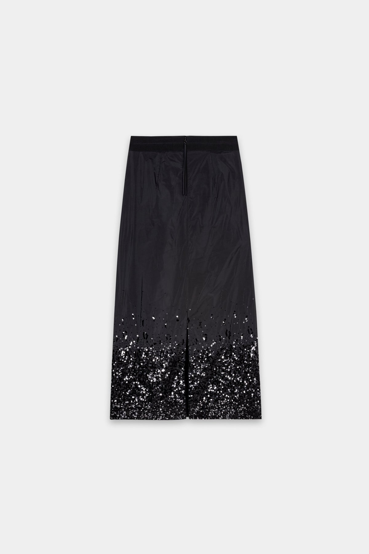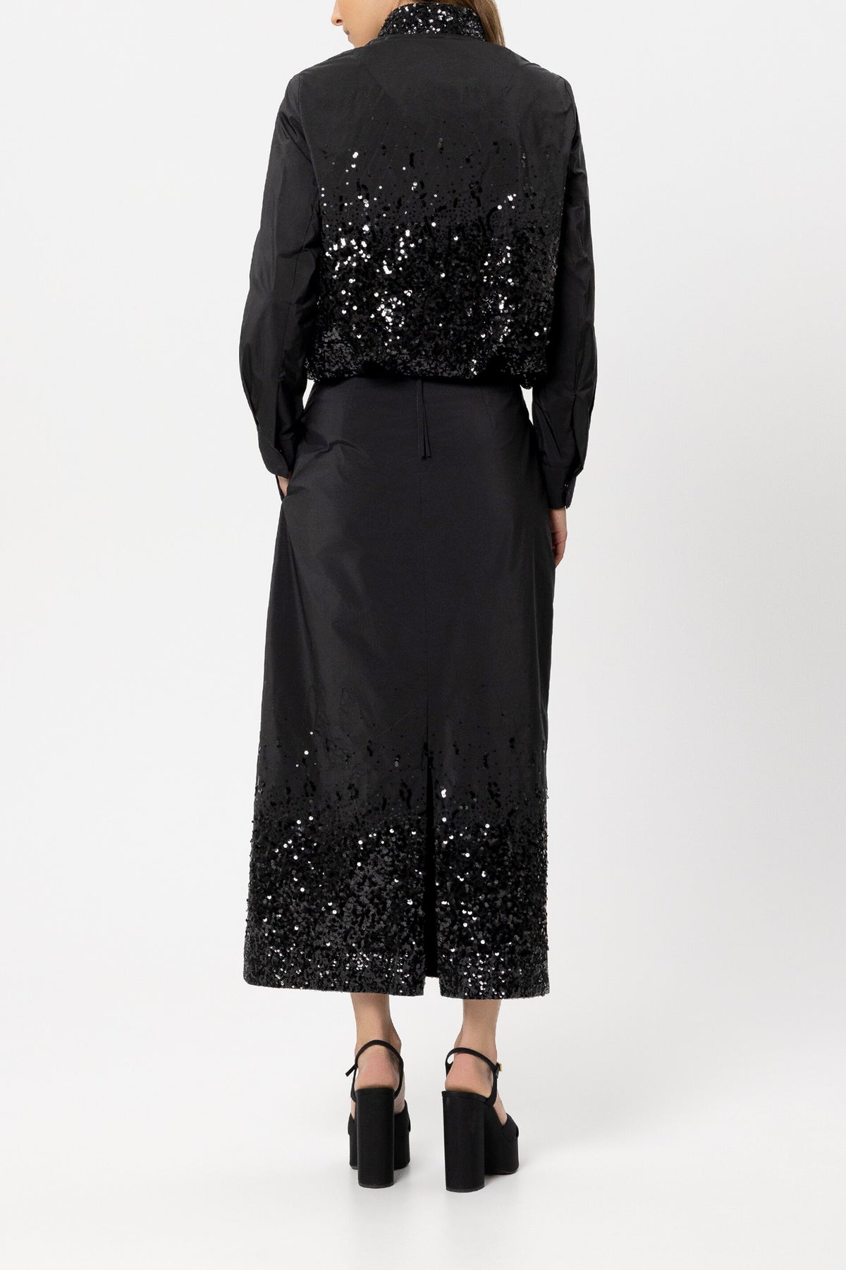 Длинная, полуоблегающая юбка из тафты, частично расшитая пайетками. Юбка имеет подкладку и отделана лентой по поясу. Разрез сзади обеспечивает большую свободу движений. На молнии сзади