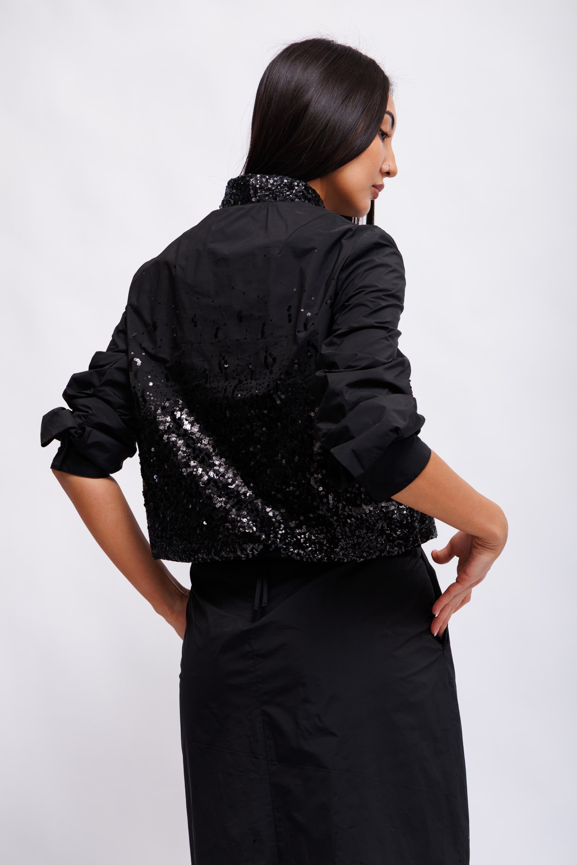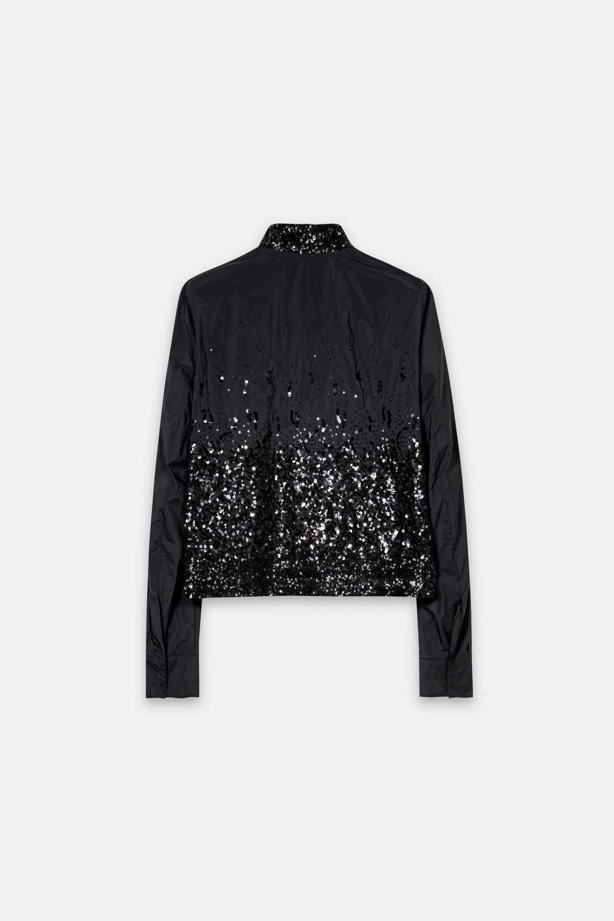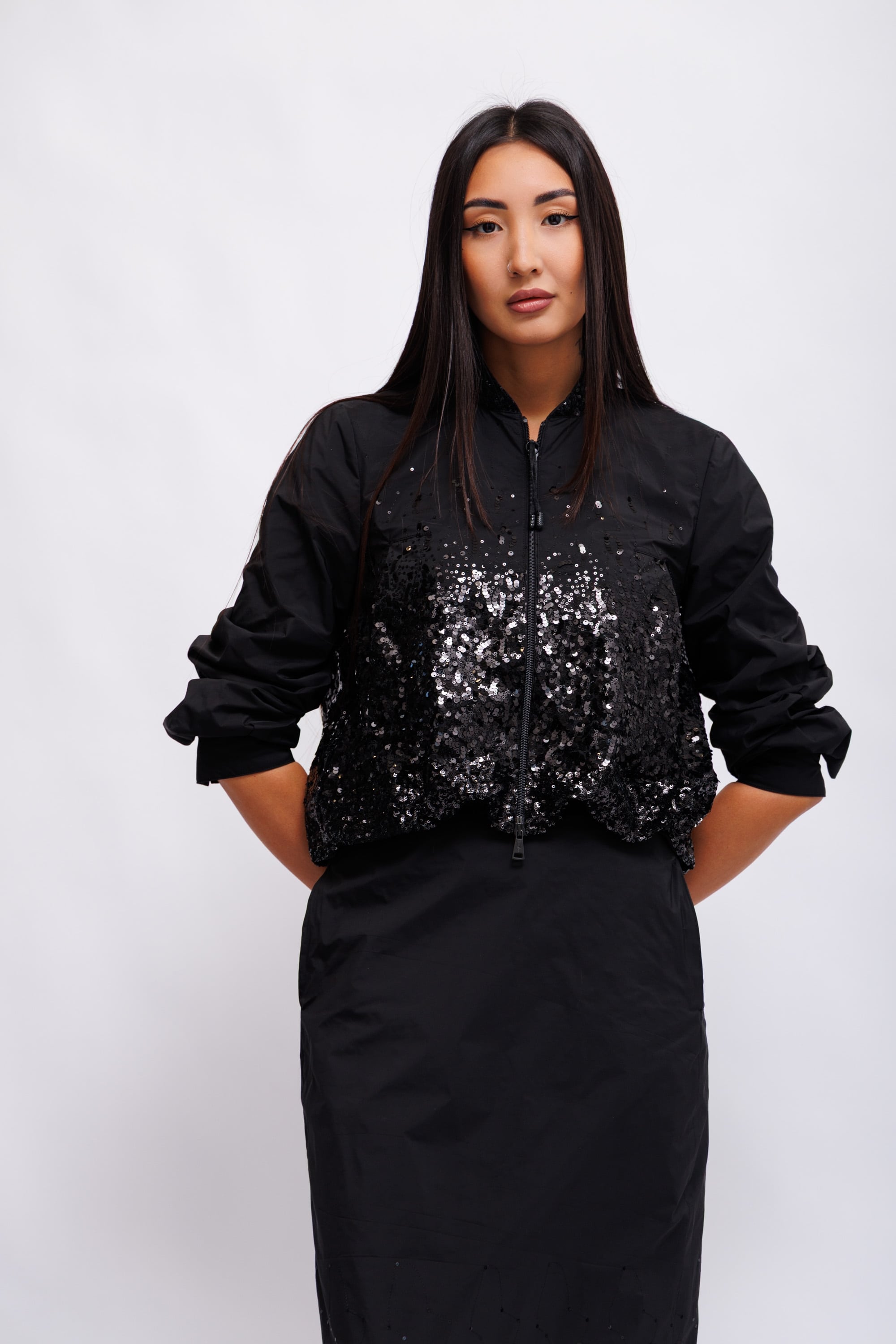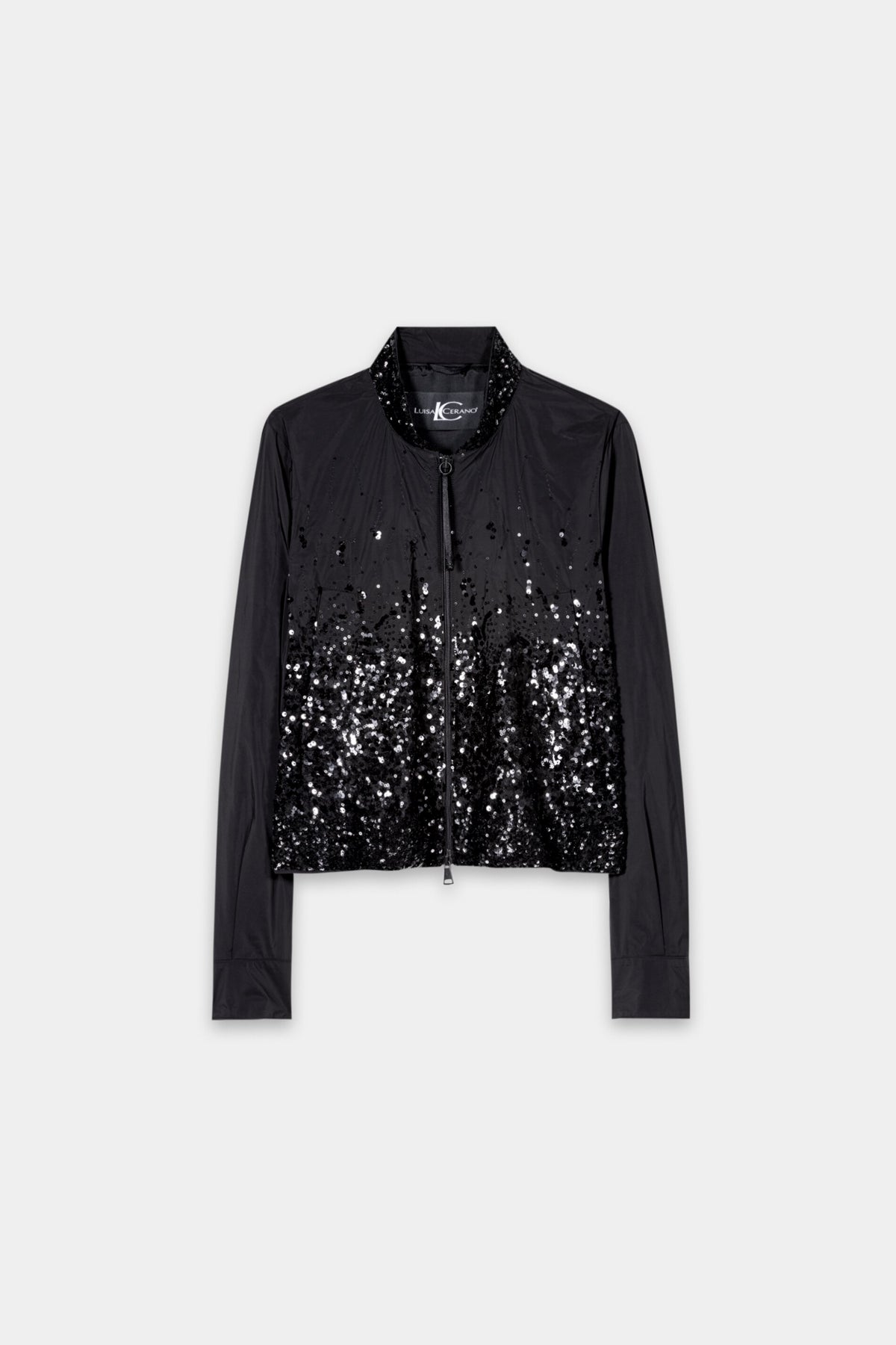 Короткий бомбер из тафты на подкладке с частичной отделкой пайетками и воротником-стойкой. Практичные детали: двусторонняя молния спереди и регулируемый низ. Манжеты рукавов застегиваются на кнопки.