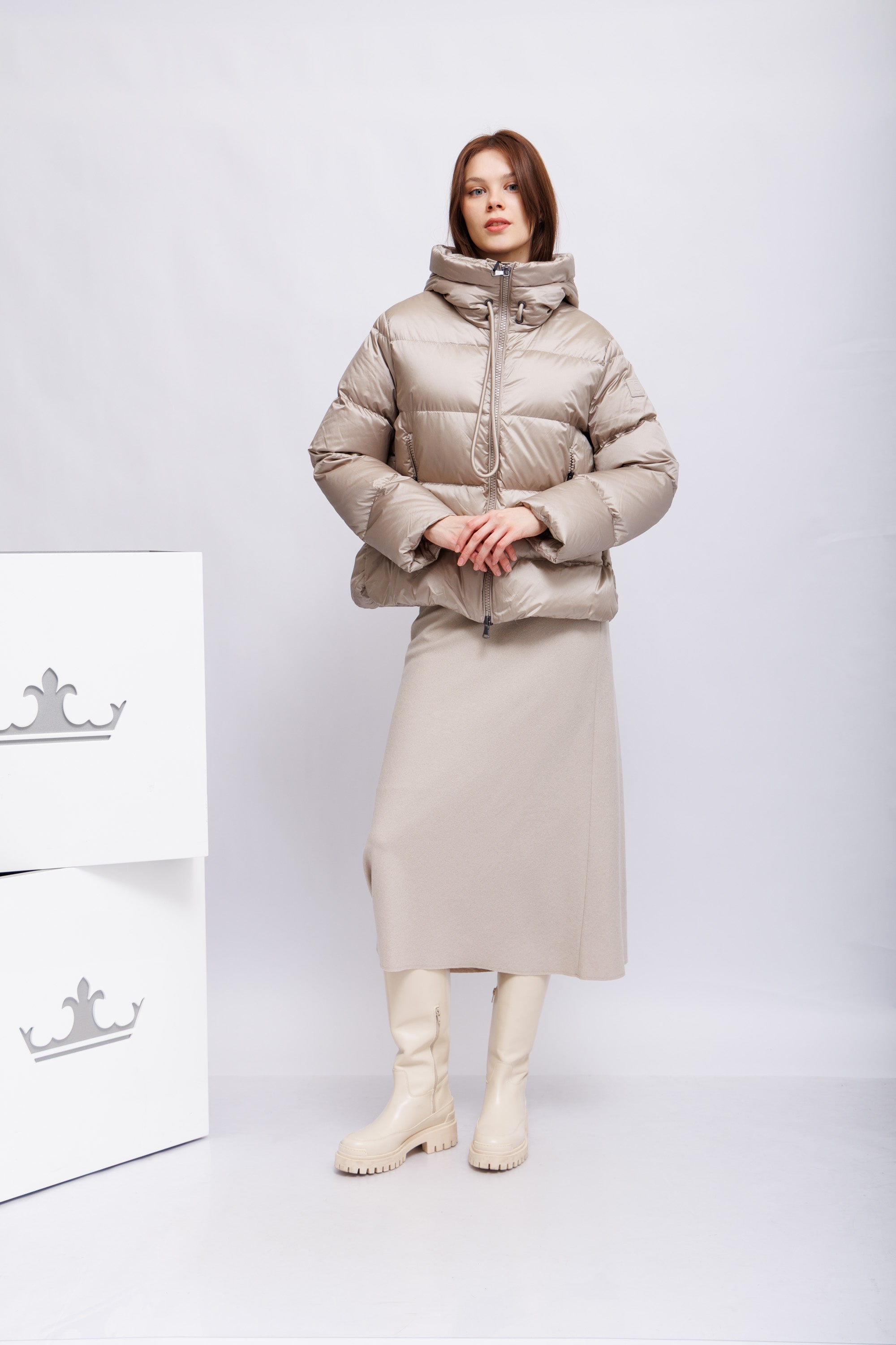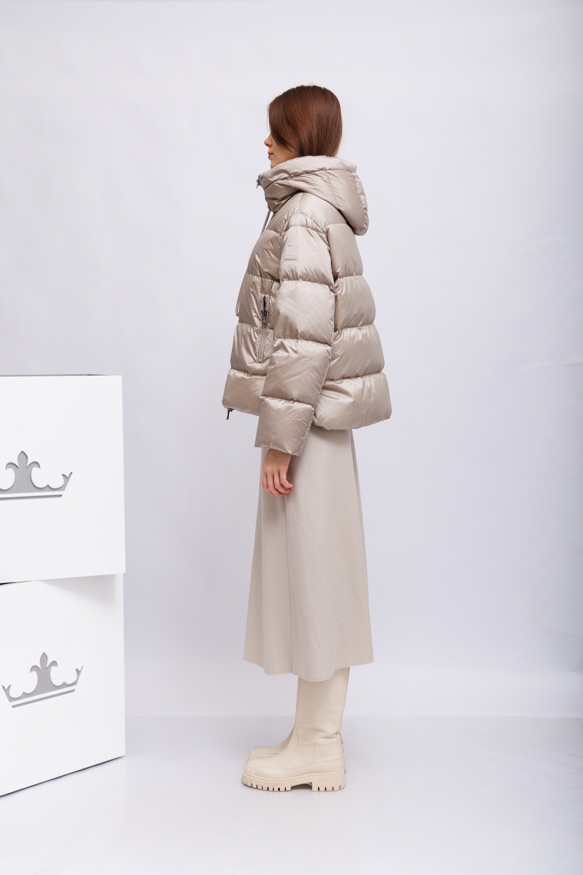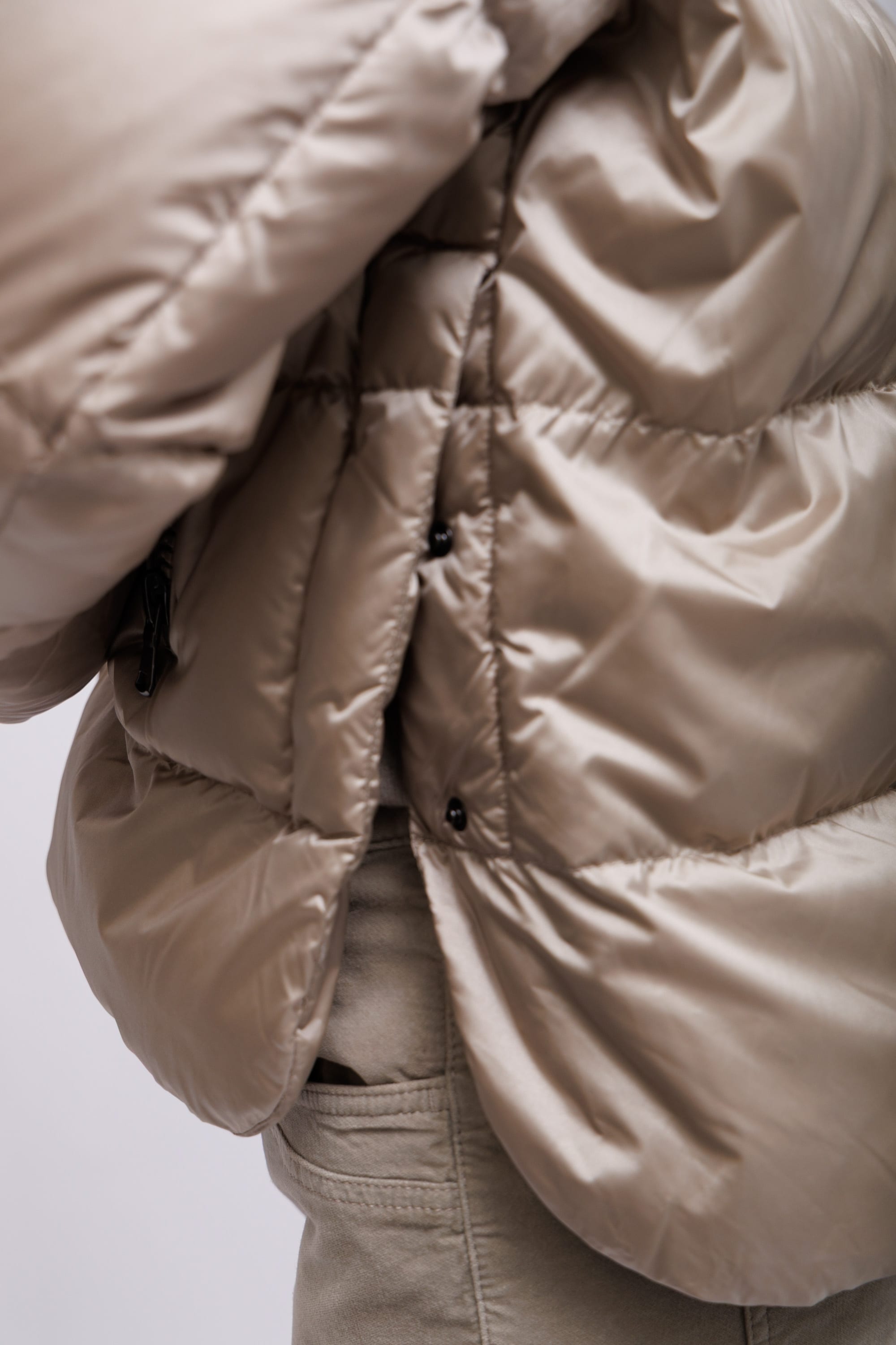 из мягкого сияющего нейлона устричного оттенка с легким переливающимся эффектом. Куртка имеет свободный крой, капюшон на шнурке, боковые карманы и боковые разрезы на кнопках для удобства и регулирования силуэта