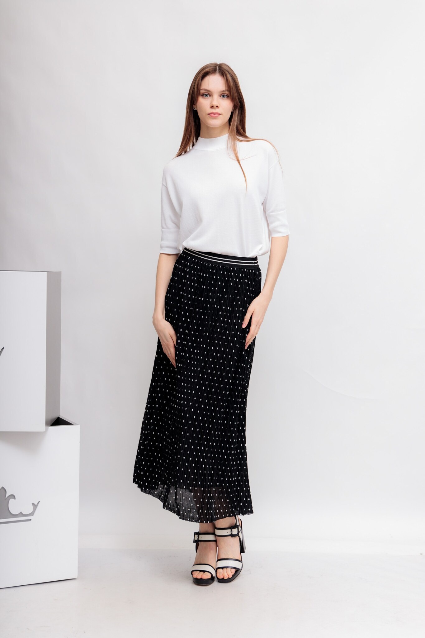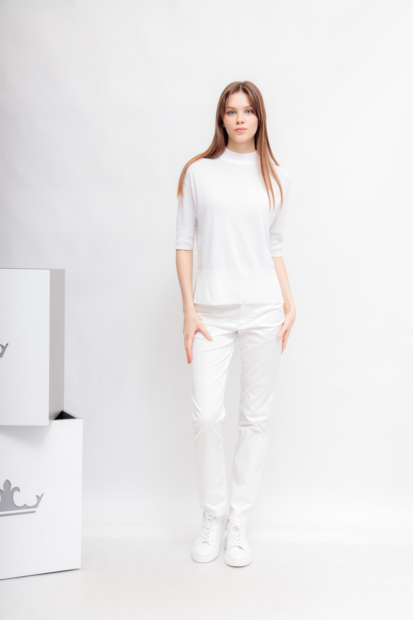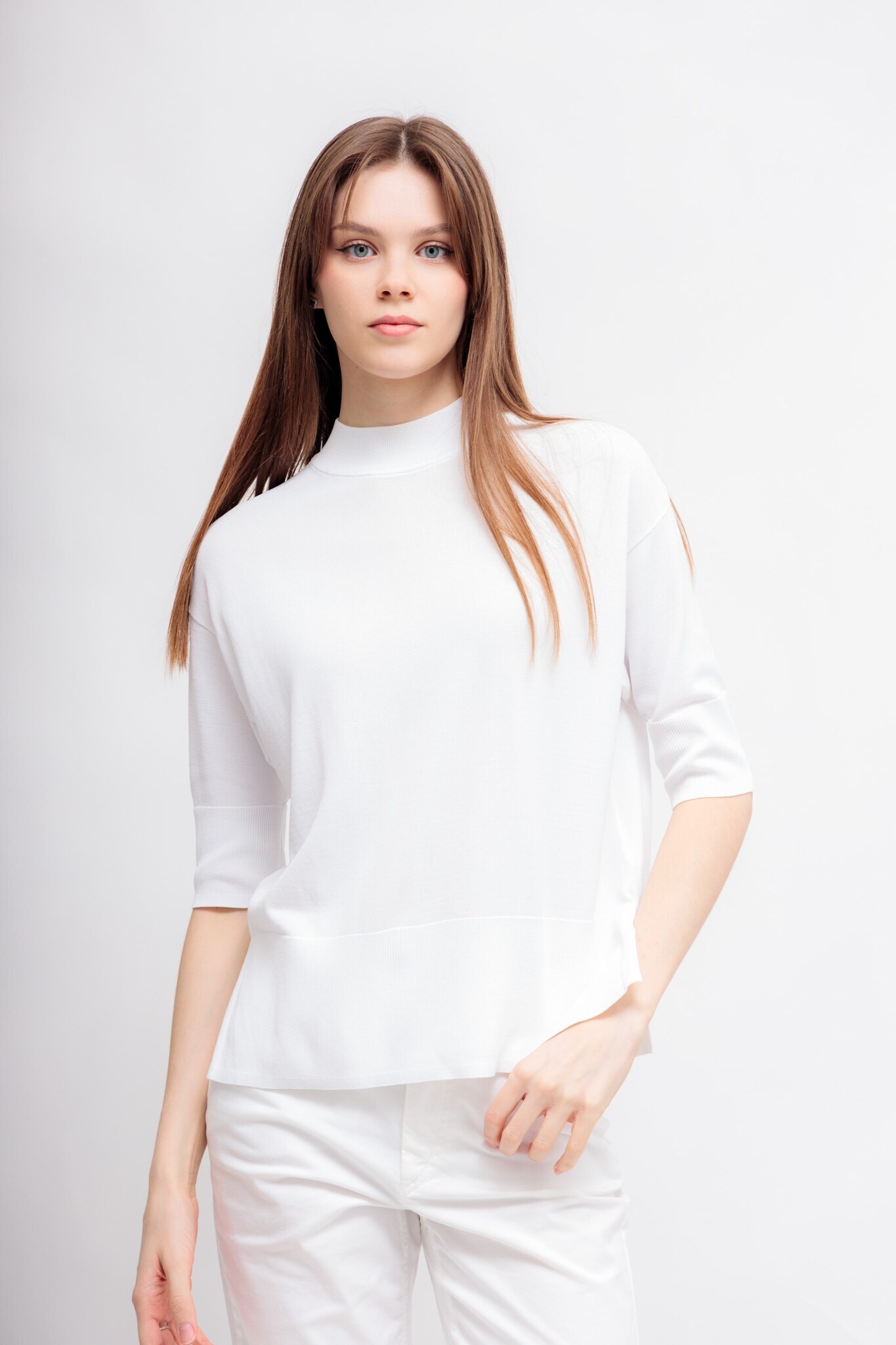 Джемпер белого цветаКруглый вырезРукава до локтяСвободный кройМанжеты и низ изделия-эластичный ребристый трикотажПо бокам- разрезы