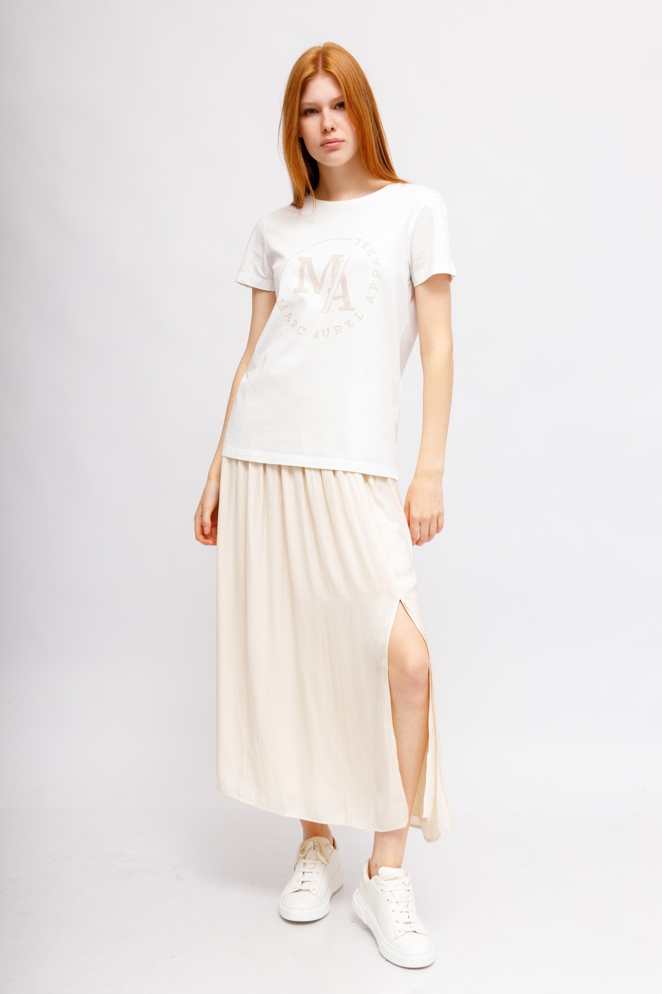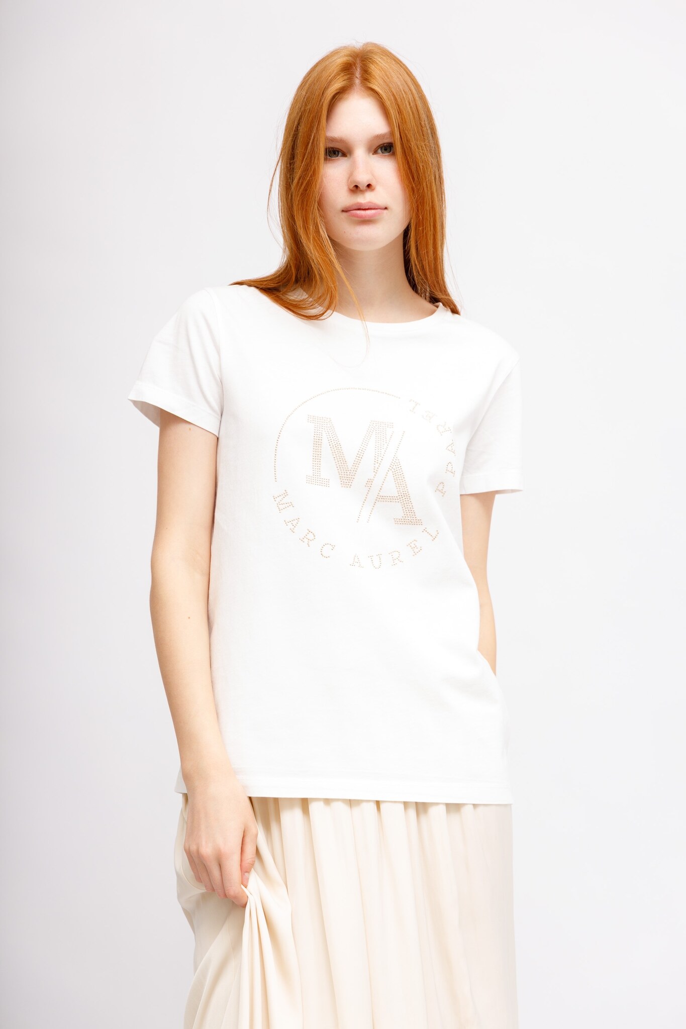 — идеальный выбор для стильного летнего образа. Круглый вырез и стандартный крой обеспечивают комфорт, а принт с логотипом добавляет современный акцент. Идеально подходит для модного и стильного образа.