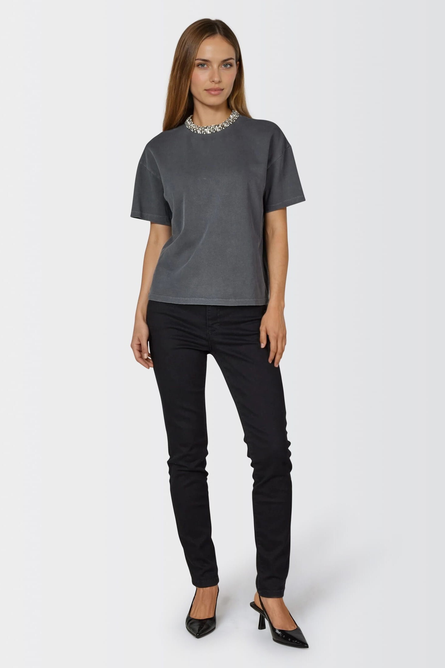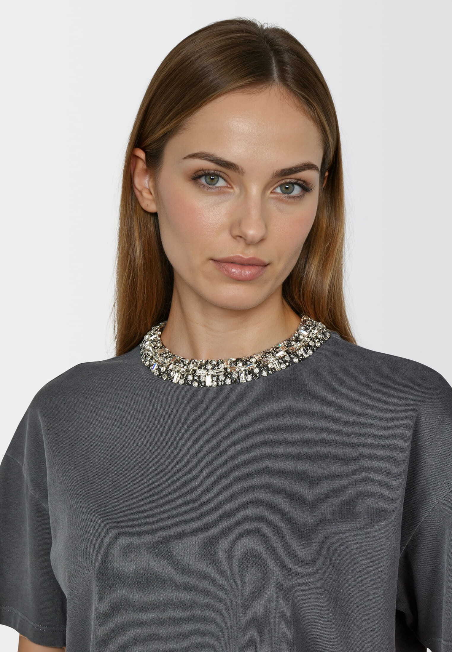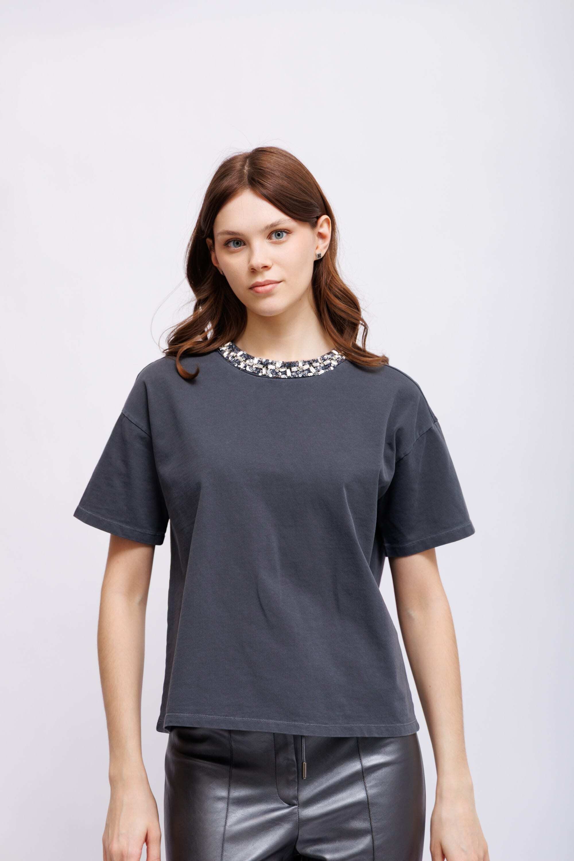 Эта футболка из плотного хлопкового трикотажа впечатляет особой потертостью «под винтаж» и сверкающими деталями. Сочетание пайеток , камней и вышивки создаёт стильный акцент, а круглый вырез горловины обеспечивает классический вид. Идеально подходит для создания модного образа.
