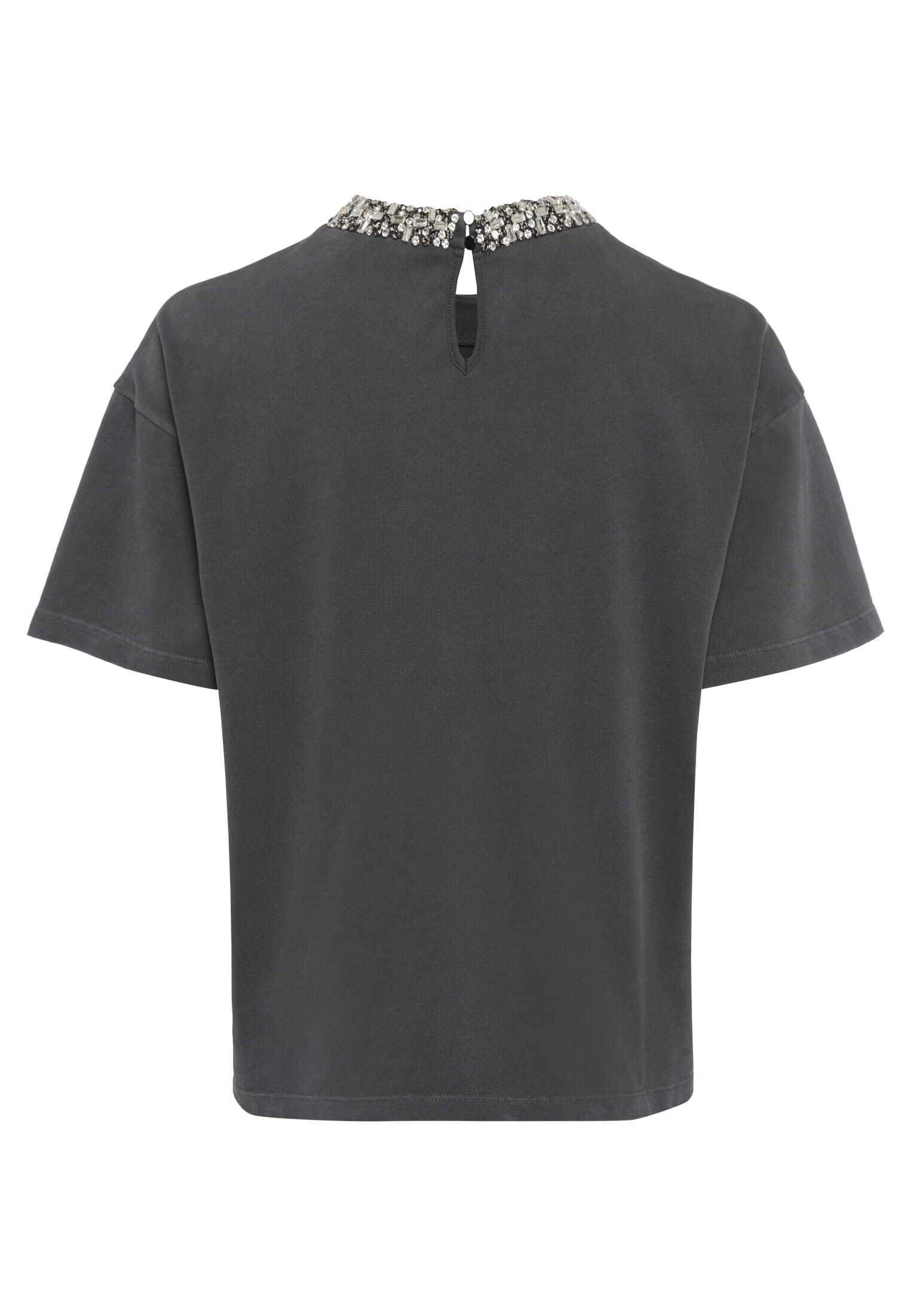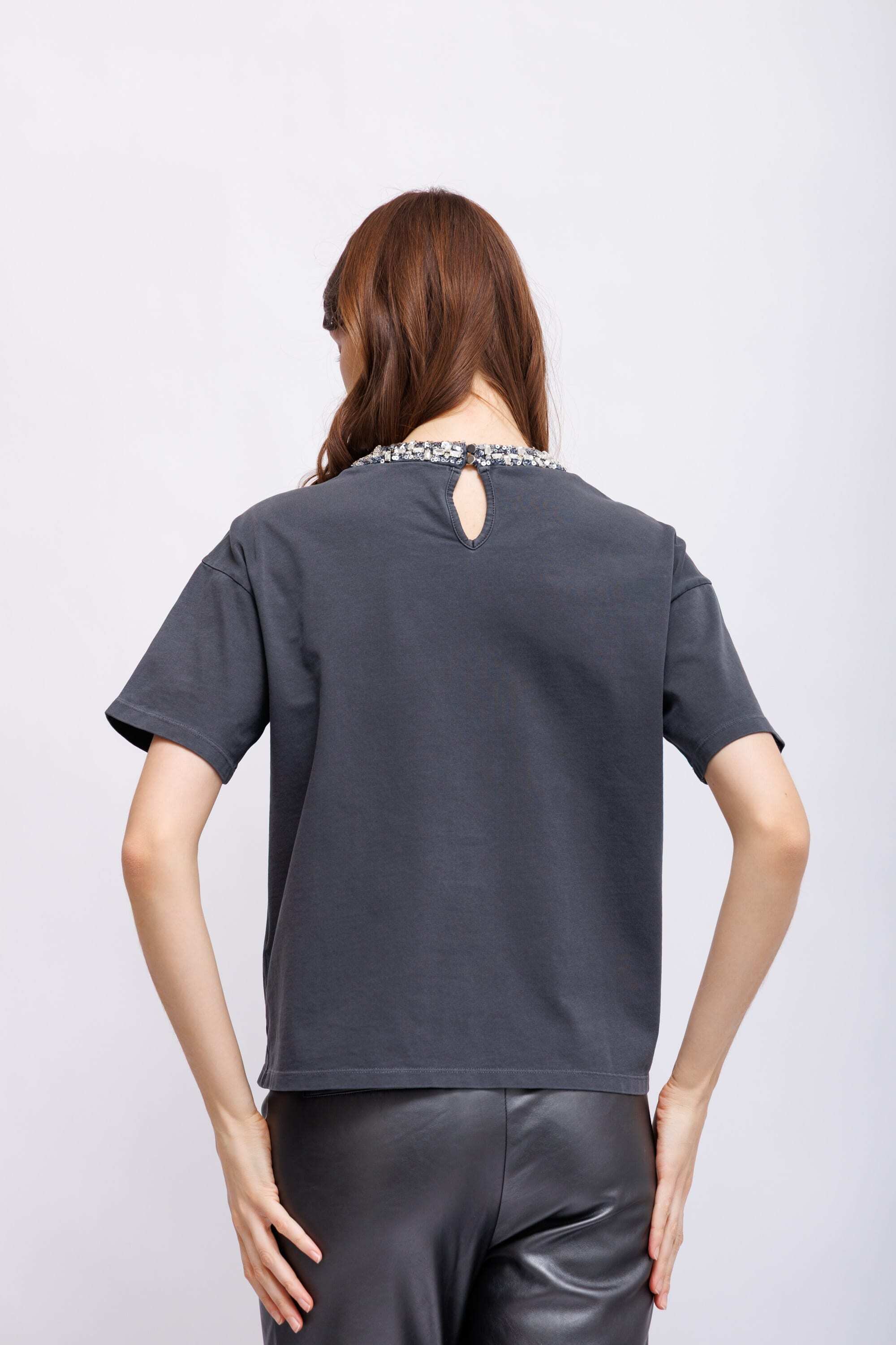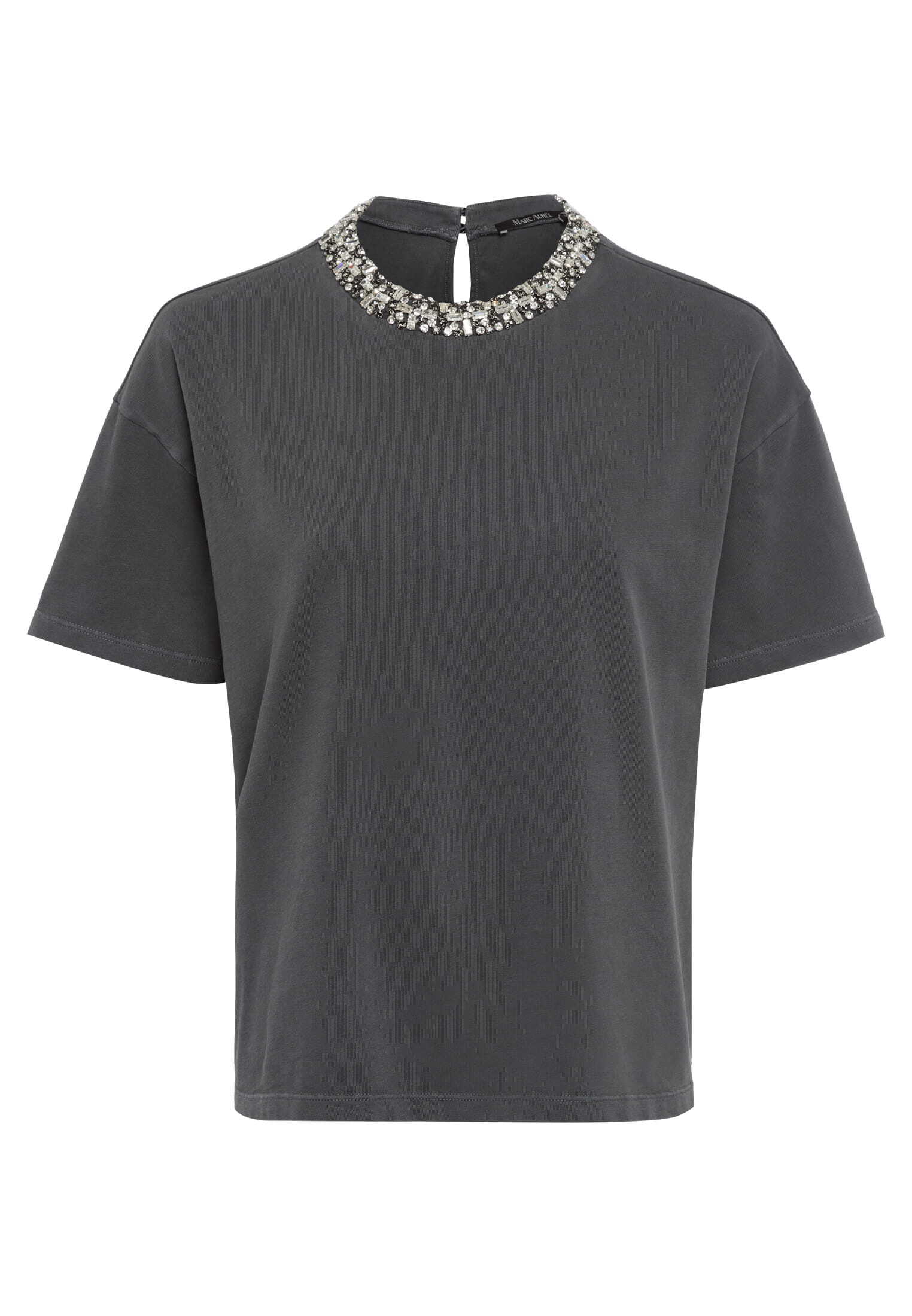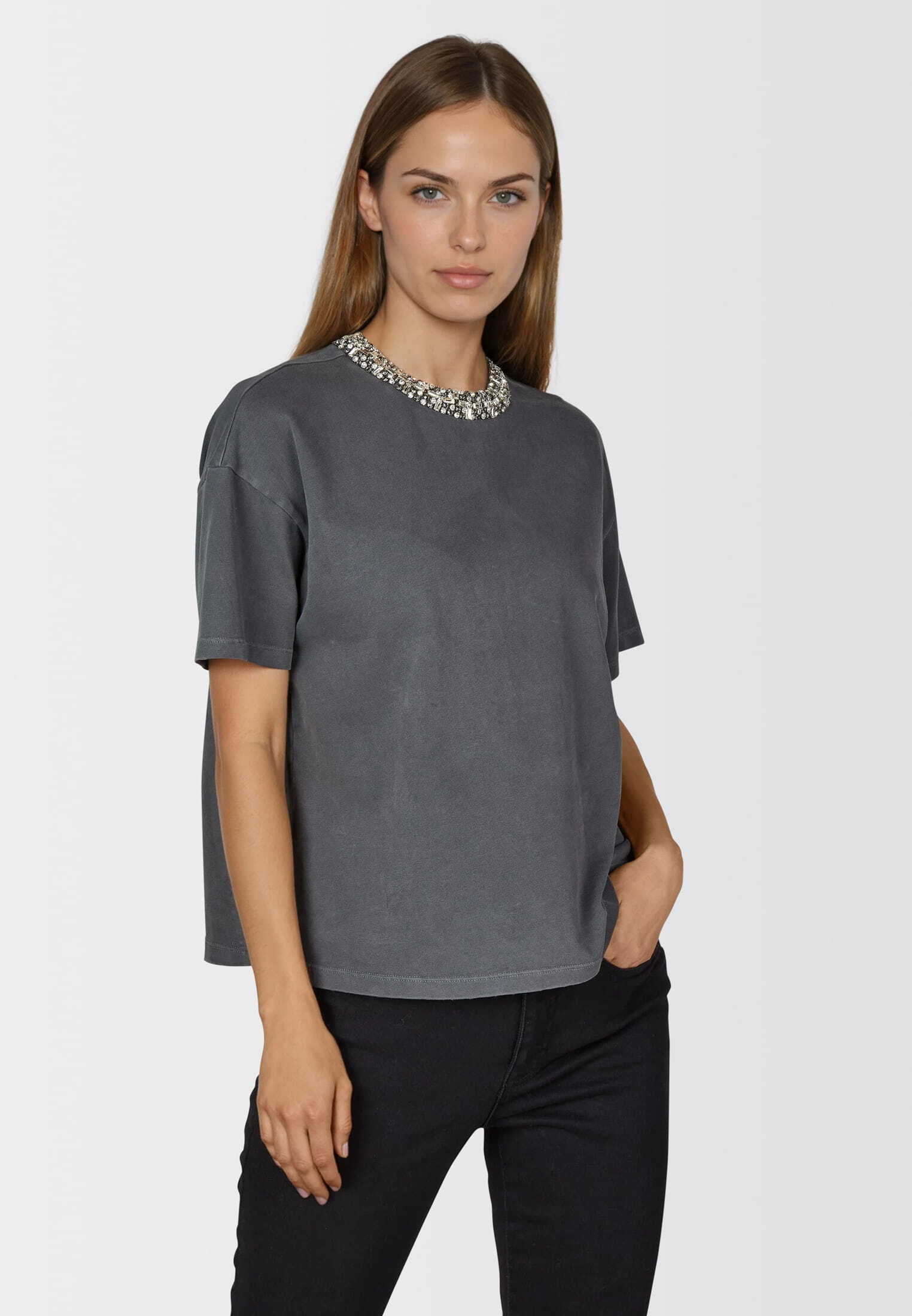 Эта футболка из плотного хлопкового трикотажа впечатляет особой потертостью «под винтаж» и сверкающими деталями. Сочетание пайеток , камней и вышивки создаёт стильный акцент, а круглый вырез горловины обеспечивает классический вид. Идеально подходит для создания модного образа.