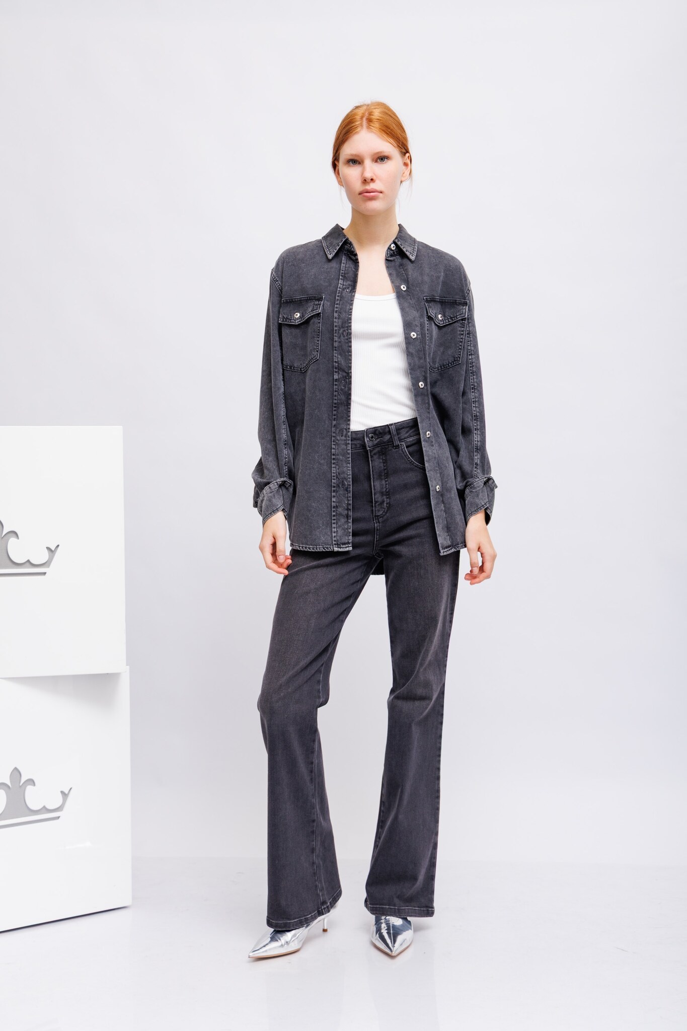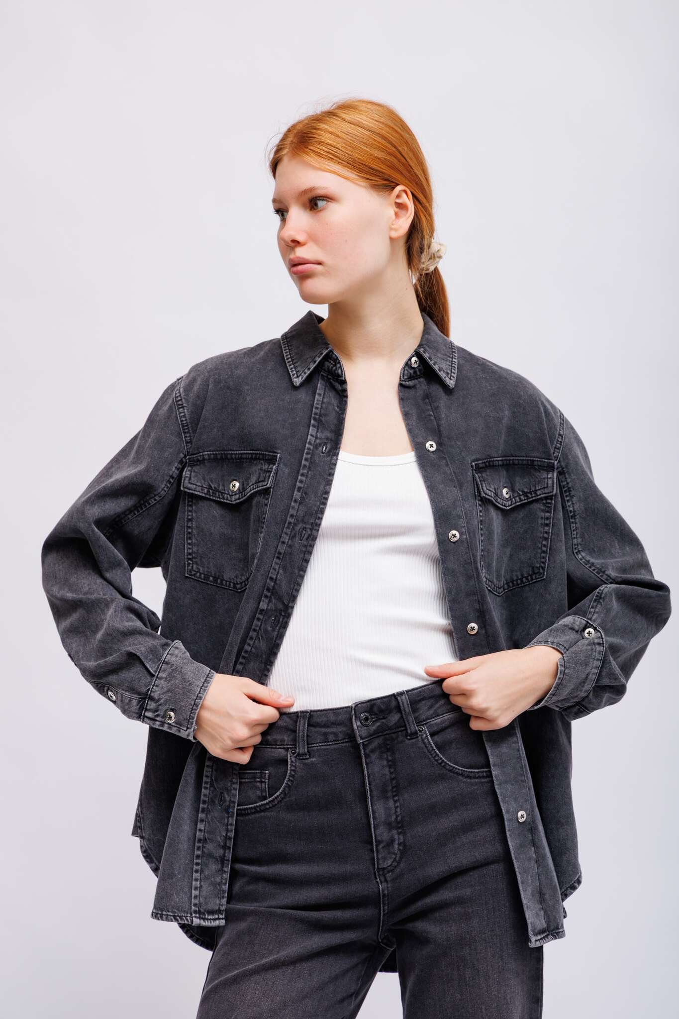 Темно-серый цвет. На кнопках. Свободный крой. Скругленные разрезы. Длинные рукава. Сзади-кокетка и складки