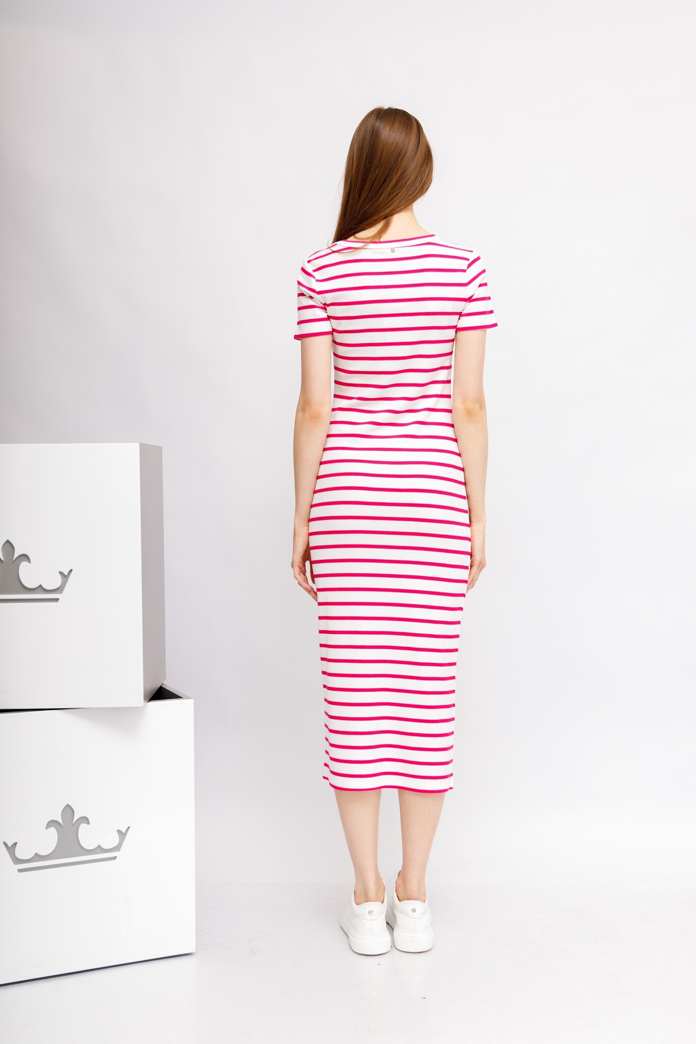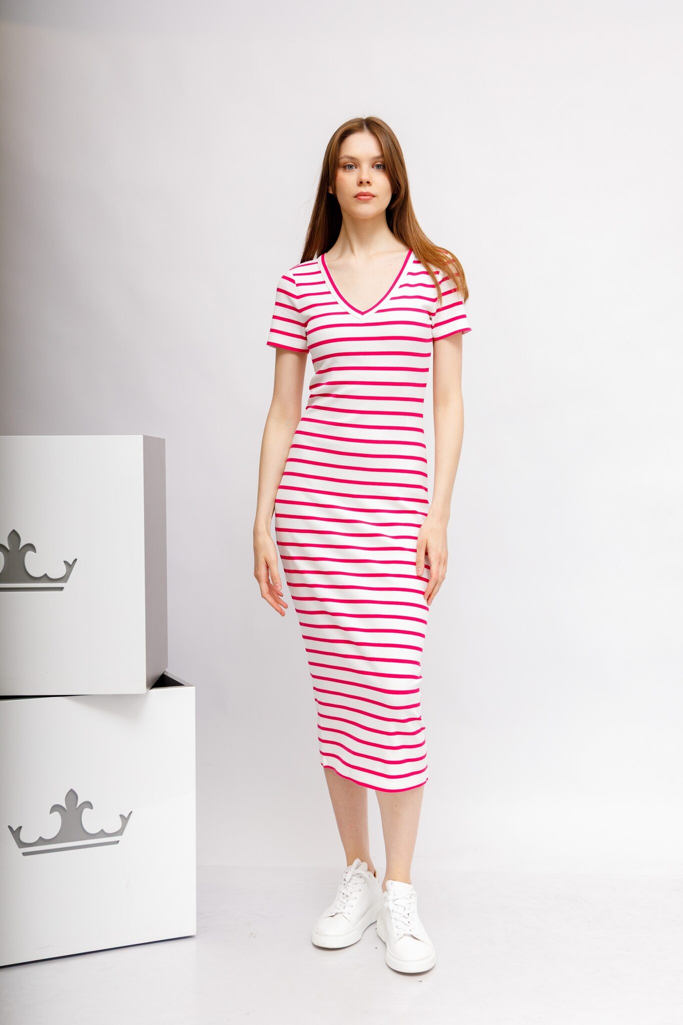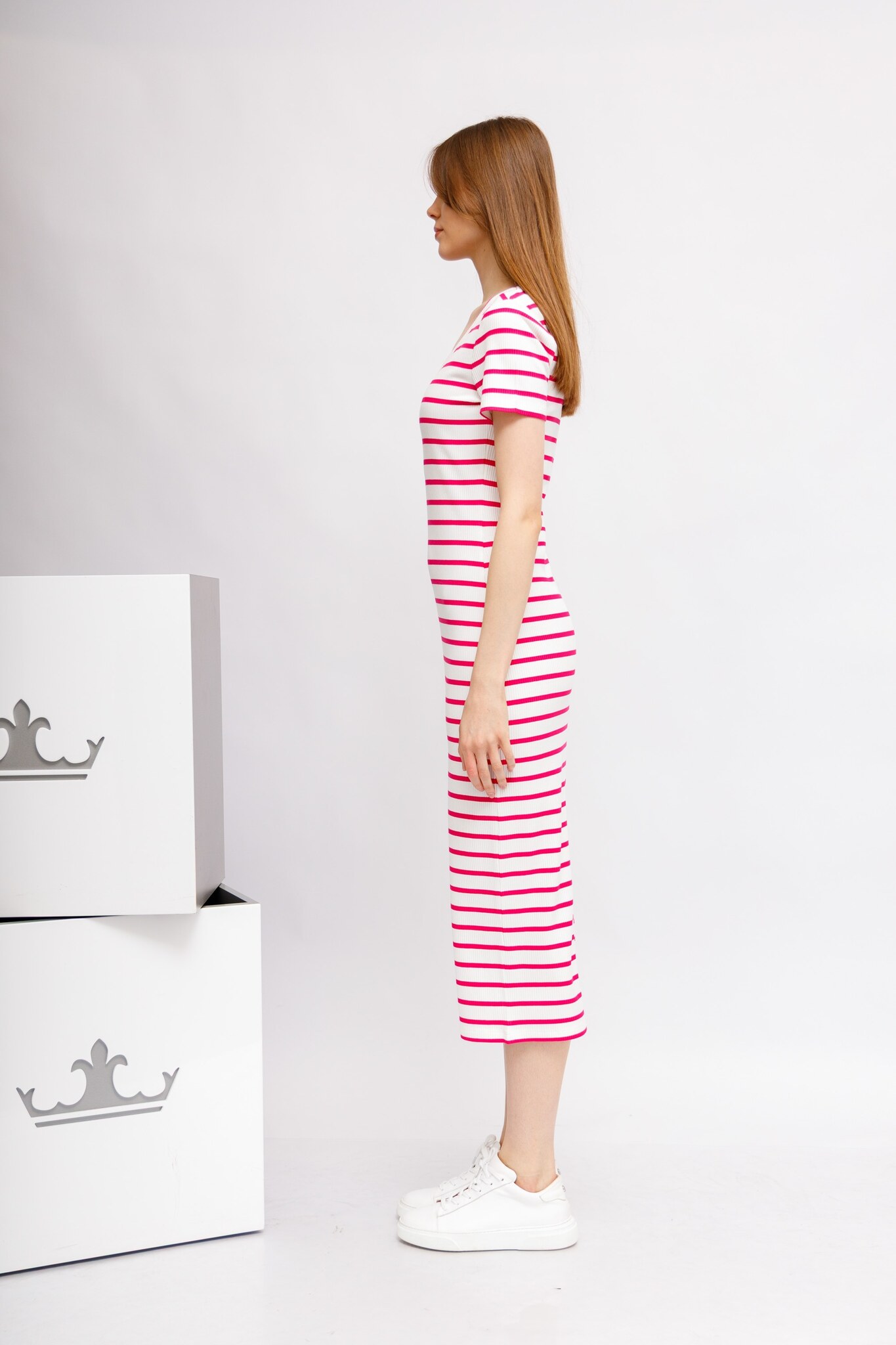 Платье-футболка макси из ребристого трикотажа с полосками розового цвета