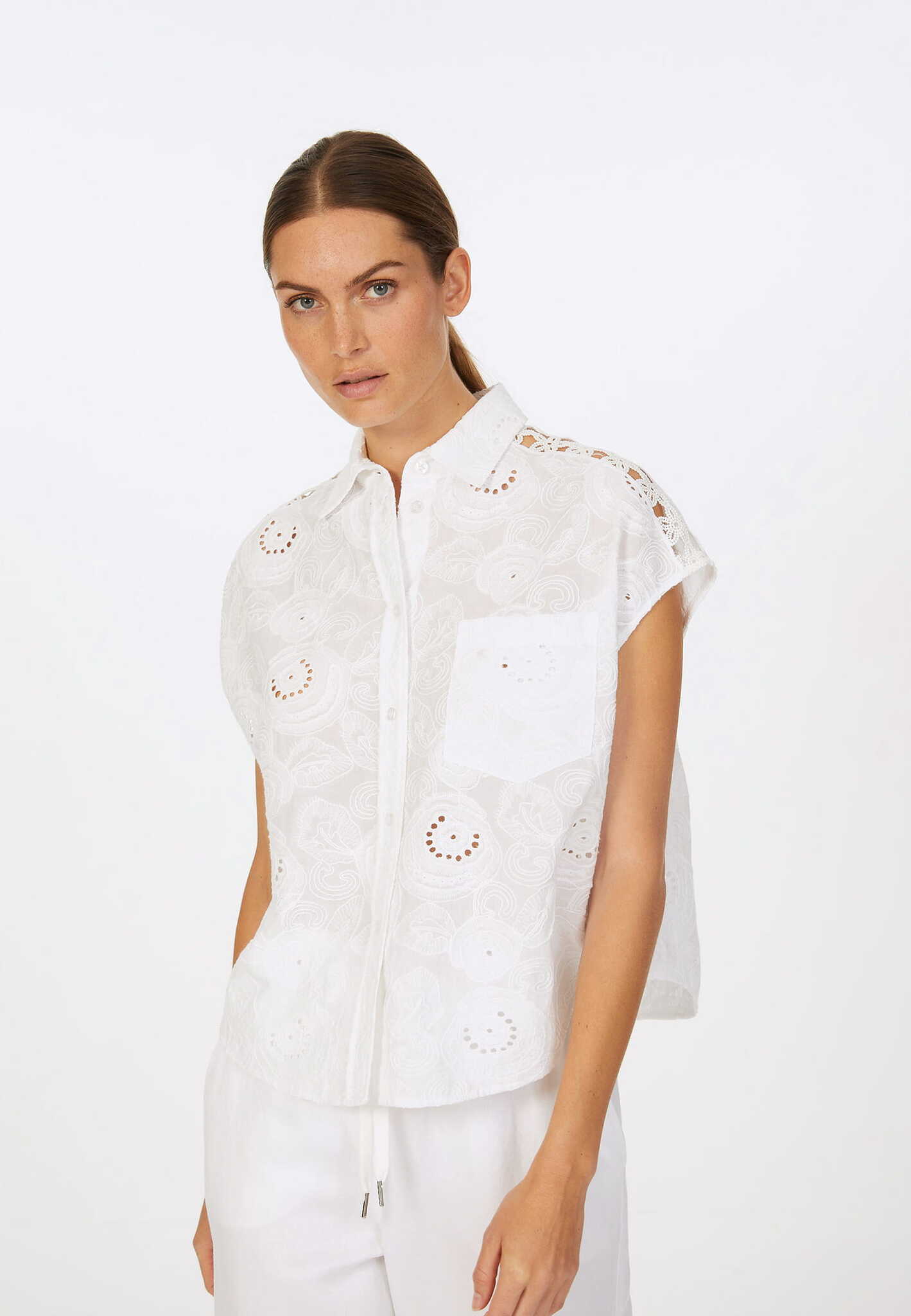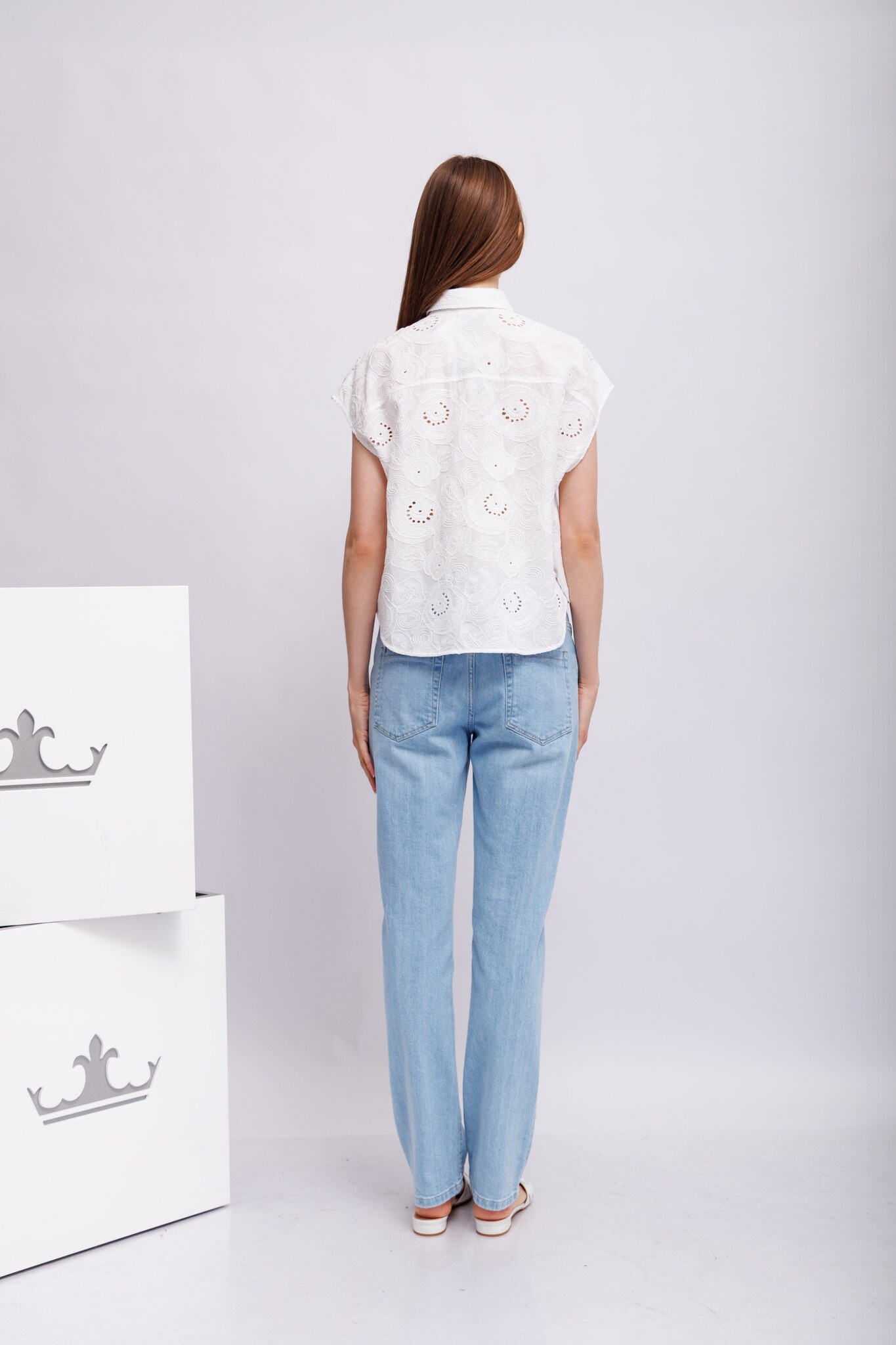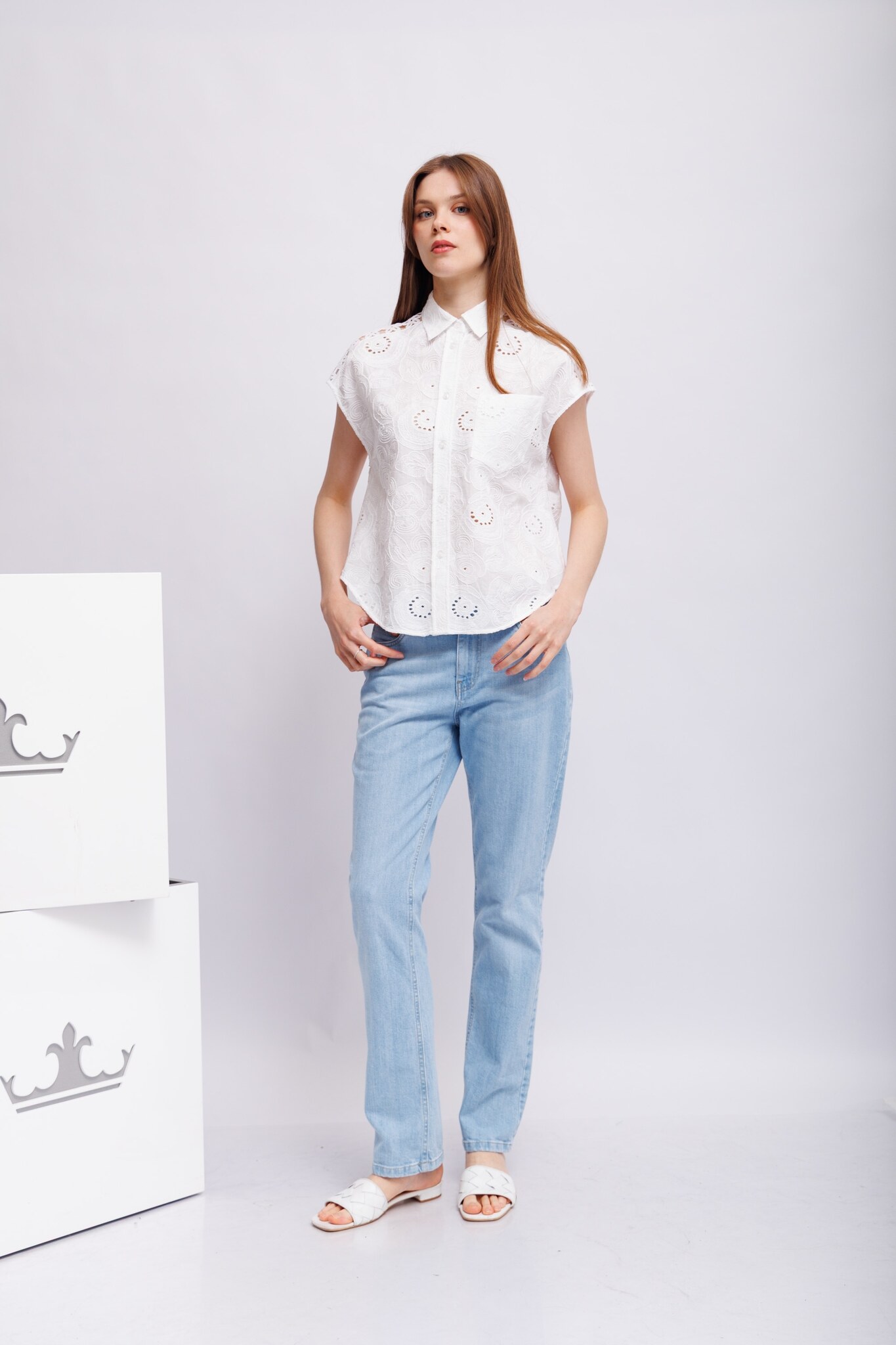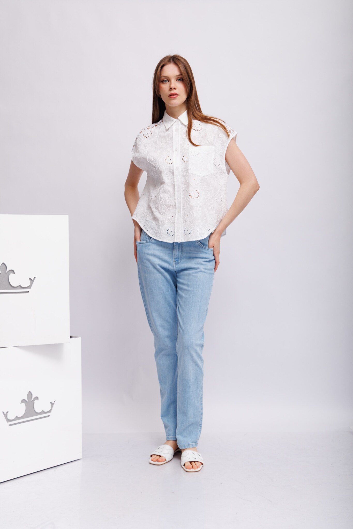 впечатляет своей сложной вышивкой и свободным свободным кроем. Кружево на плечах и накладной нагрудный карман придают блузке особые детали, которые идеально дополняют повседневный стиль. Идеально подходит для летних нарядов.