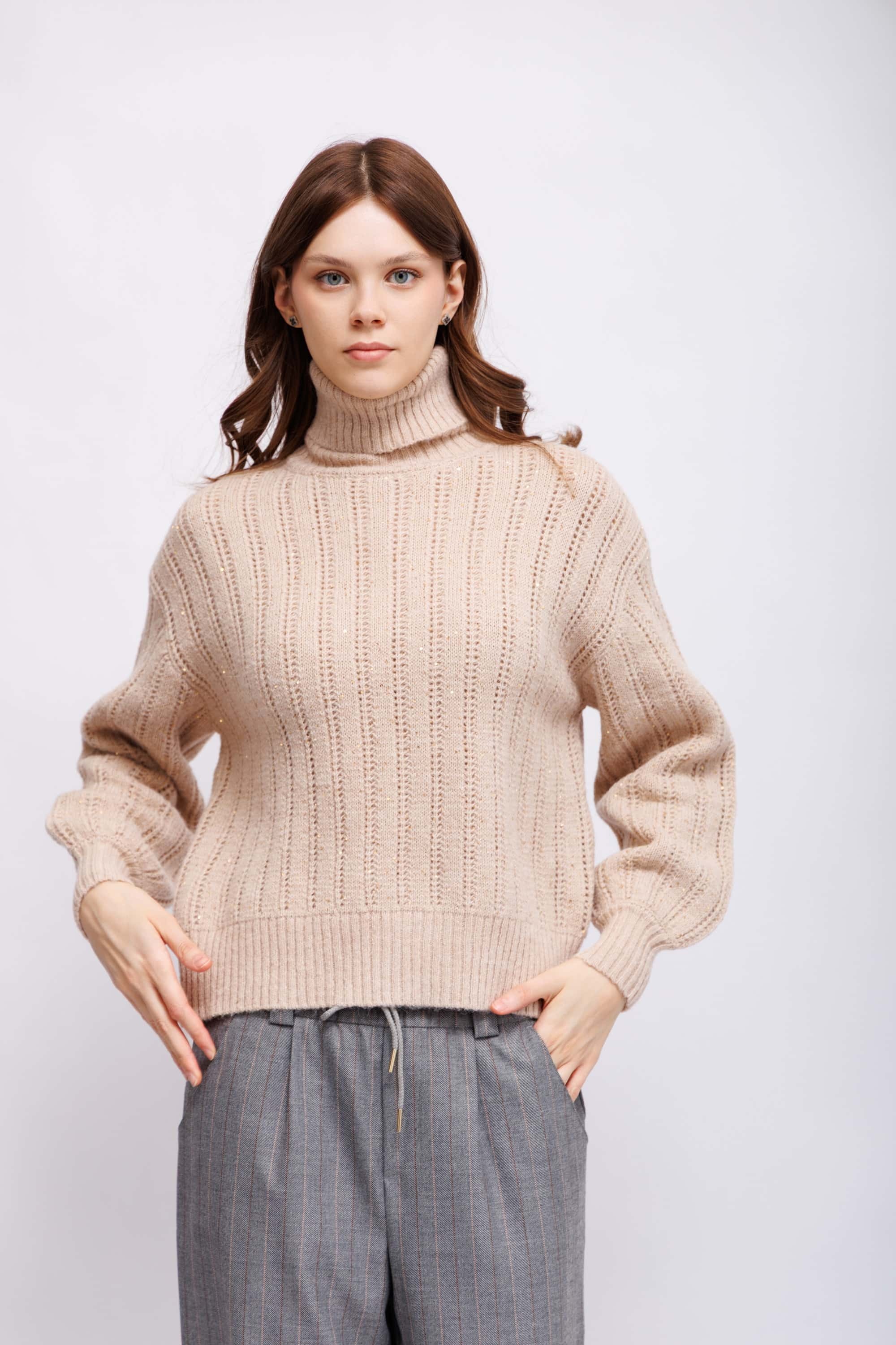 Этот свитер с высоким воротом из смеси тонкой шерсти и альпаки отличается изысканной ребристой текстурой и украшен изящными сверкающими пайетками. Спущенные плечи создают свободный силуэт, а отделка в рубчик обеспечивает идеальную посадку.