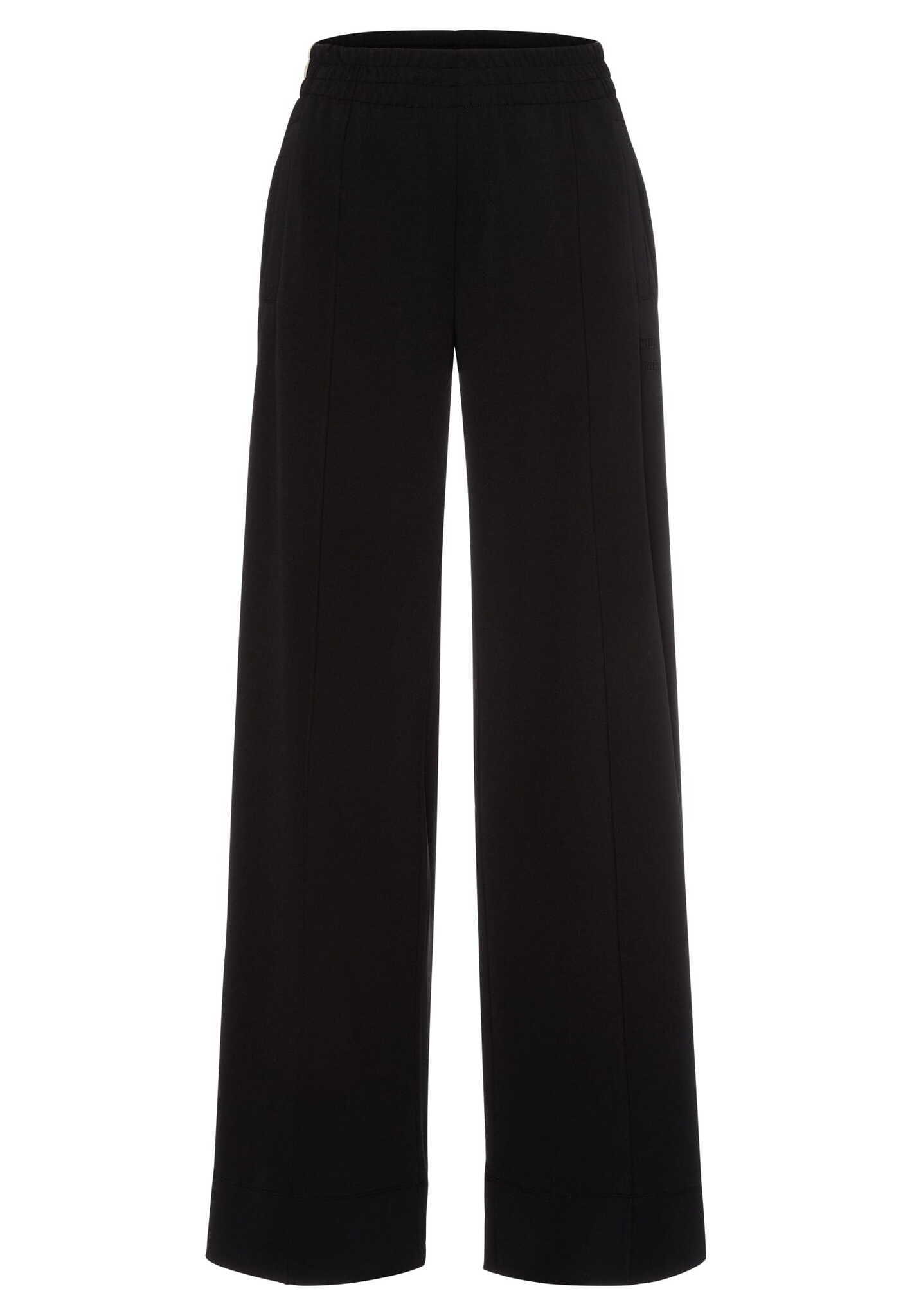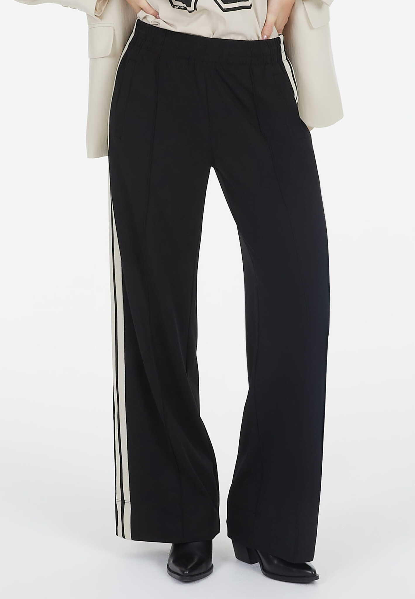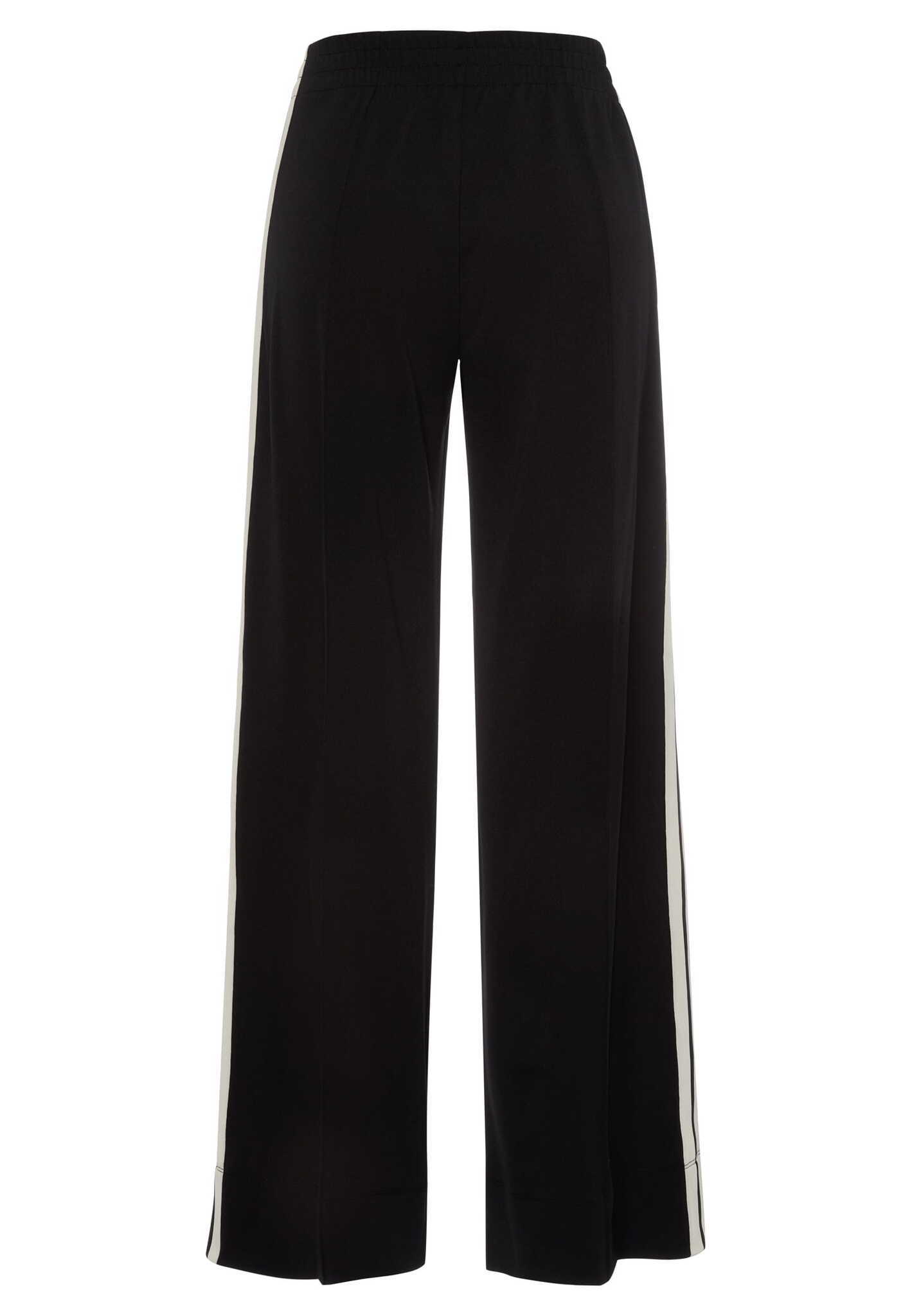 Эти брюки сочетают в себе спортивный динамизм и стильные детали. Струящийся трикотаж обеспечивает комфорт при ношении, а контрастные полоски галонового цвета и складка с кантом придают им современную элегантность.