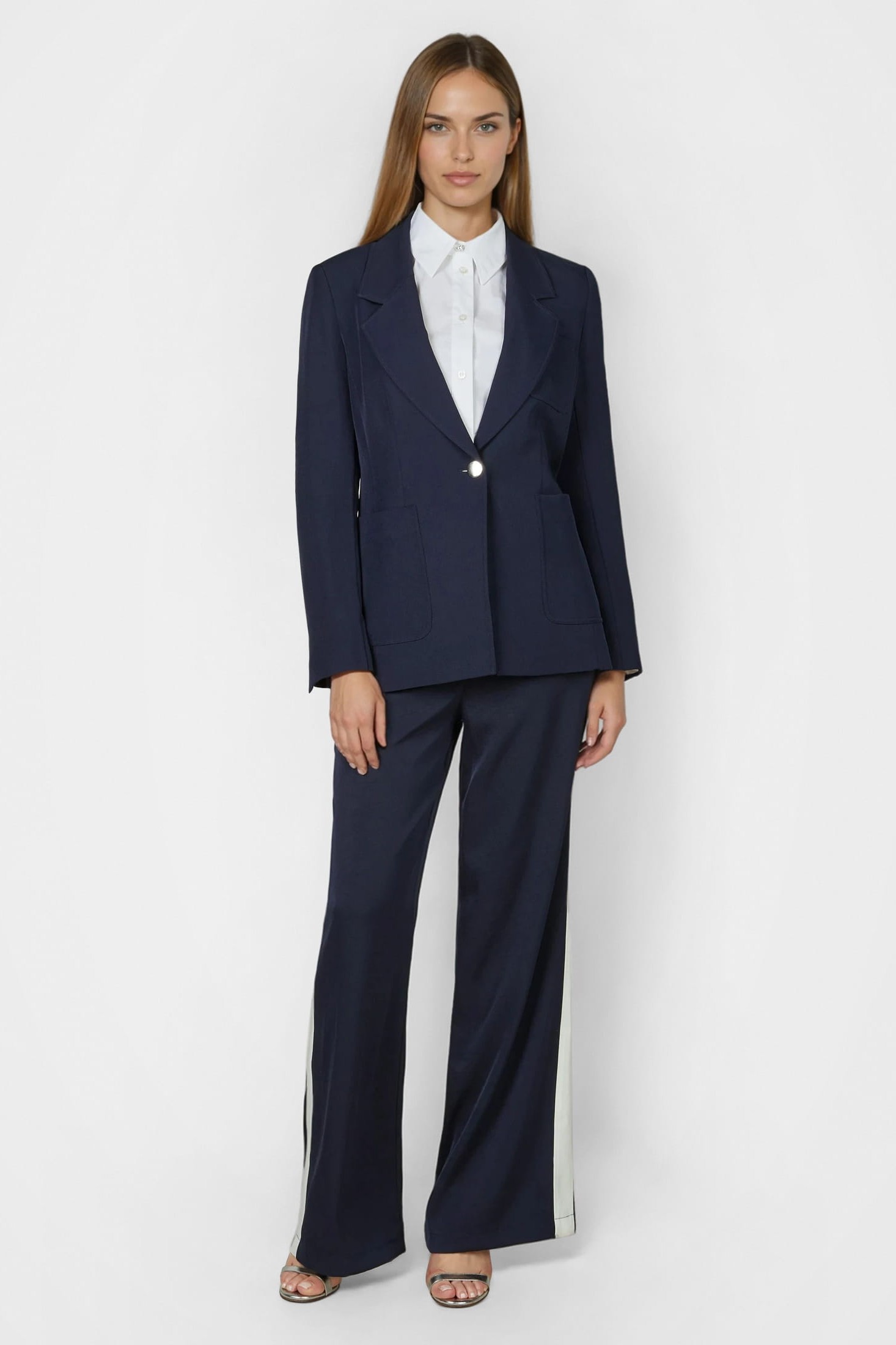 Элегантная, фактурная ткань, не требующая особого ухода, придает этому блейзеру изысканный вид, а спортивная стежка добавляет современный, динамичный штрих. Спущенные лацканы, накладные карманы и рукава с разрезами создают лаконичный силуэт. Небольшая металлическая бирка по низу ненавязчиво завершает дизайн.