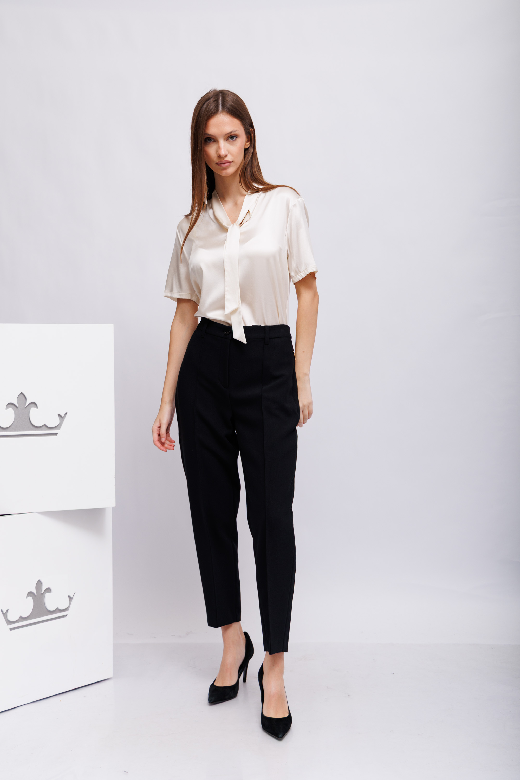 ворот-стойка с завязкой-бантом. Короткие рукава. Прямой крой. Спереди-шелковистый атлас, сзади-комфортный классический хлопковый джерси марки