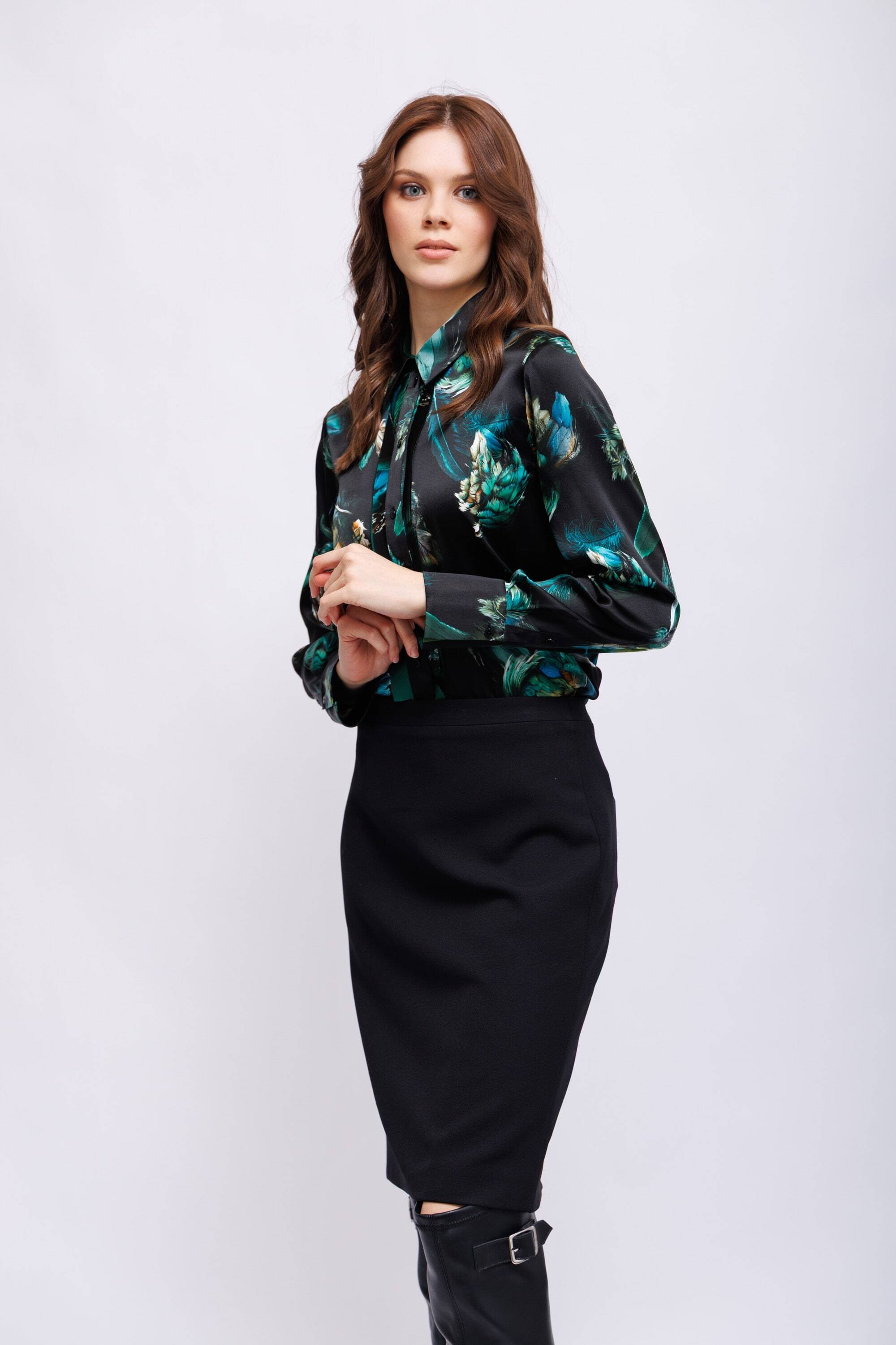 Шёлковая блузка с принтом «перья» Элегантная шёлковая блузка с небольшим добавлением эластана для комфорта. Таинственный принт «перья» придаёт образу глубину и лёгкость. Свободный силуэт с видимыми пуговицами, изящной окантовкой и широкими манжетами с разрезом и пуговицей создаёт современный женственный образ.