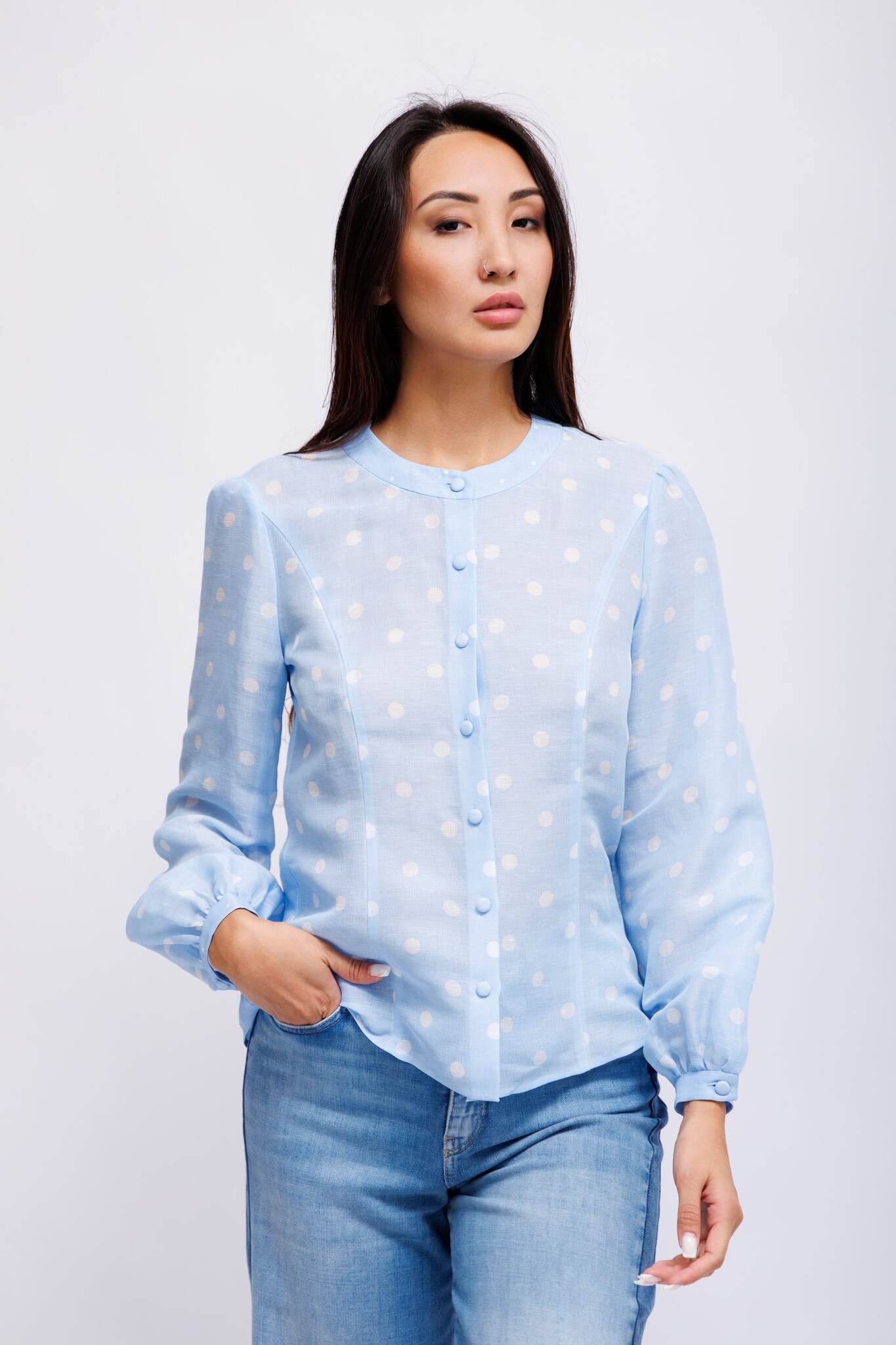 поражает своим ретро-шармом и высококачественным льном и шёлком. Она украшена оборками на рукавах и обтянутыми тканью пуговицами. Слегка приталенная талия и круглый вырез горловины дополняют её особенности.