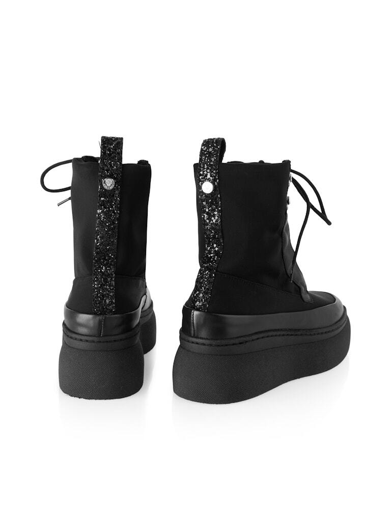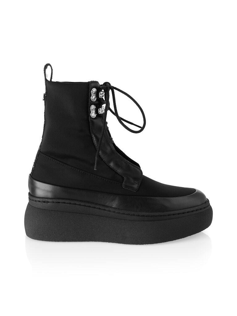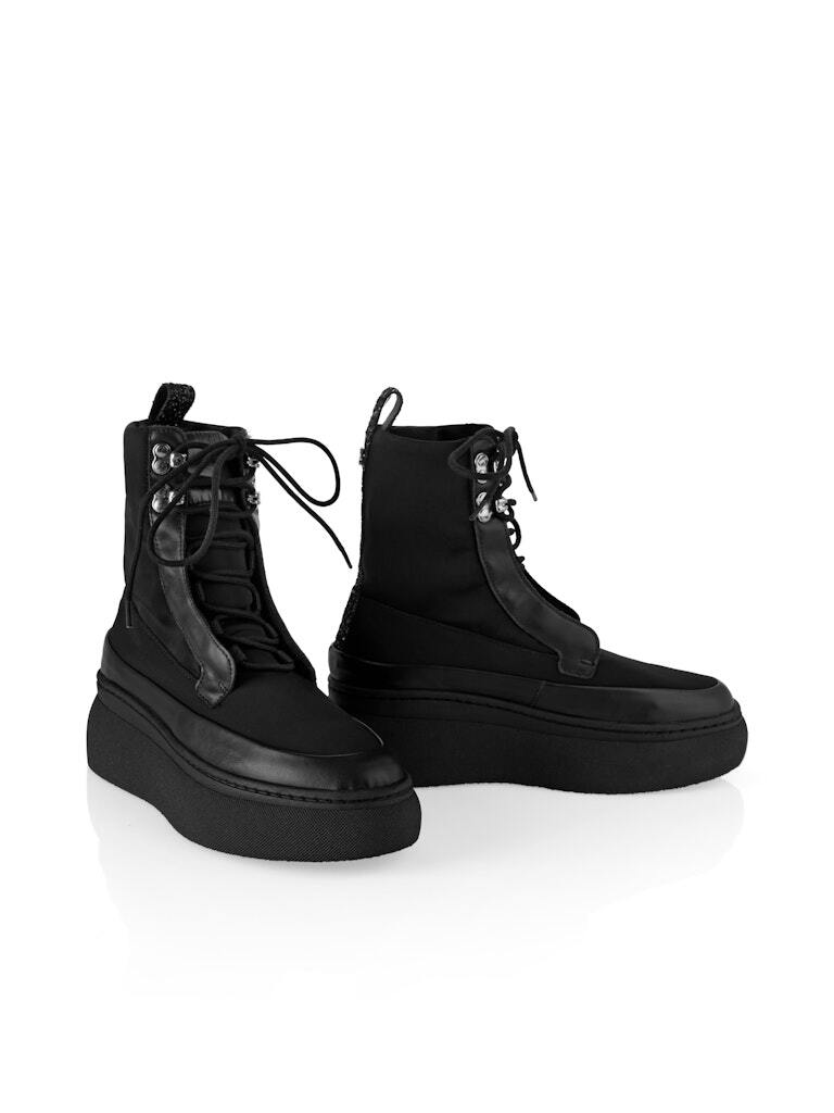 Стильные ботильоны с массивной подошвой и экстравагантной шнуровкой. Сочетание неопрена и кожи делает эту обувь удобной. Блестящая полоска сзади привлекает внимание.
