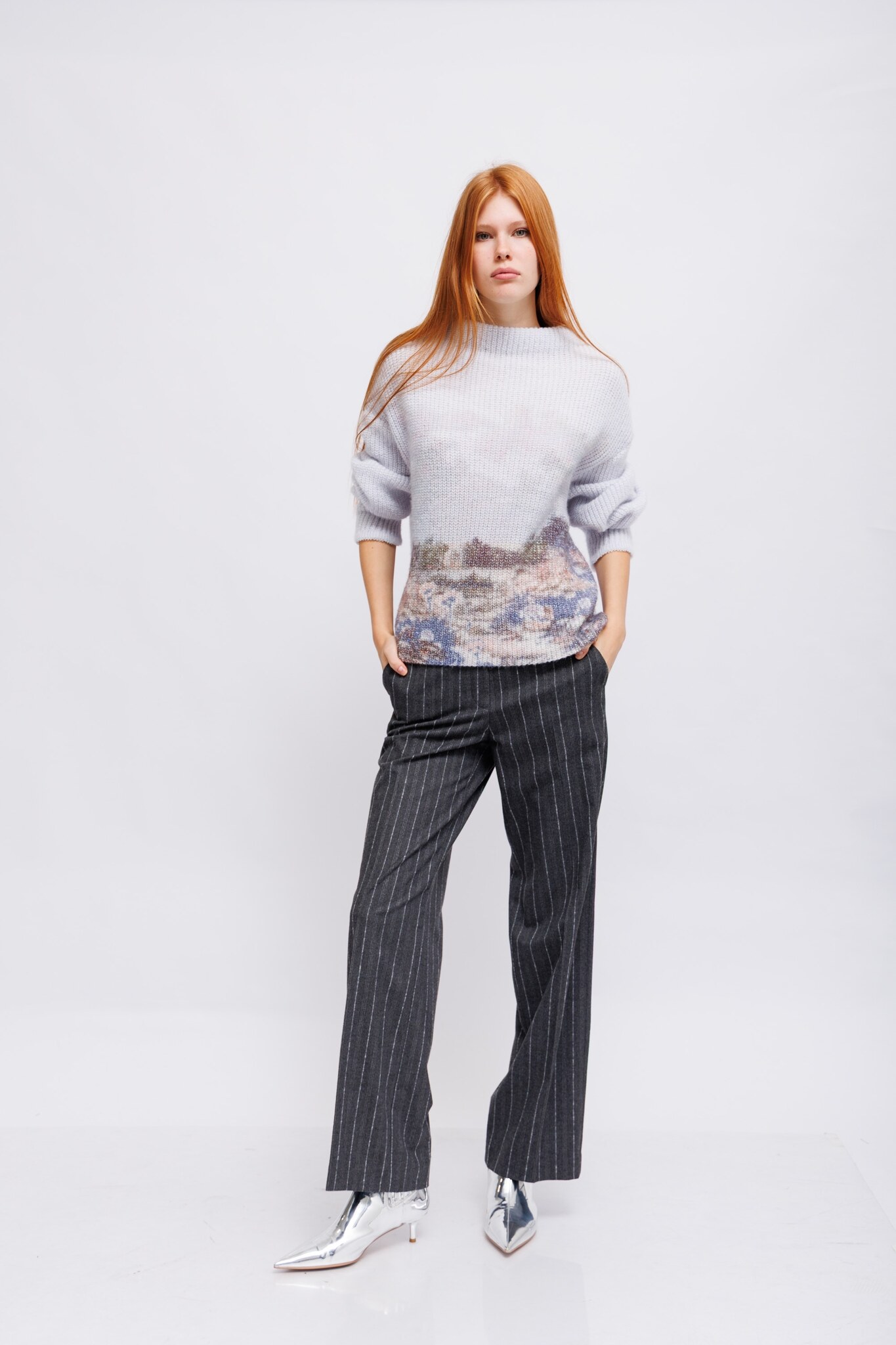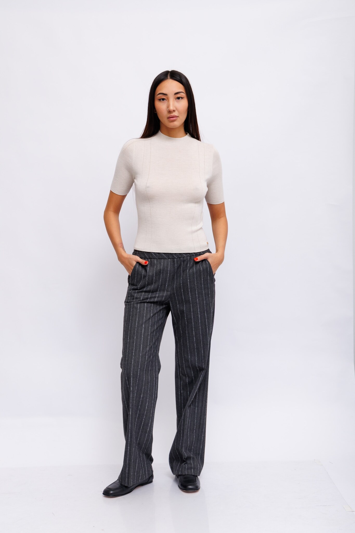 Модель WASHINGTON. Элементы мужских брюк очевидны в современном узоре в тонкую полоску. Женственный крой и эластичный пояс сзади обеспечивают большой комфорт. Модная, удобная вещь для офиса и города.