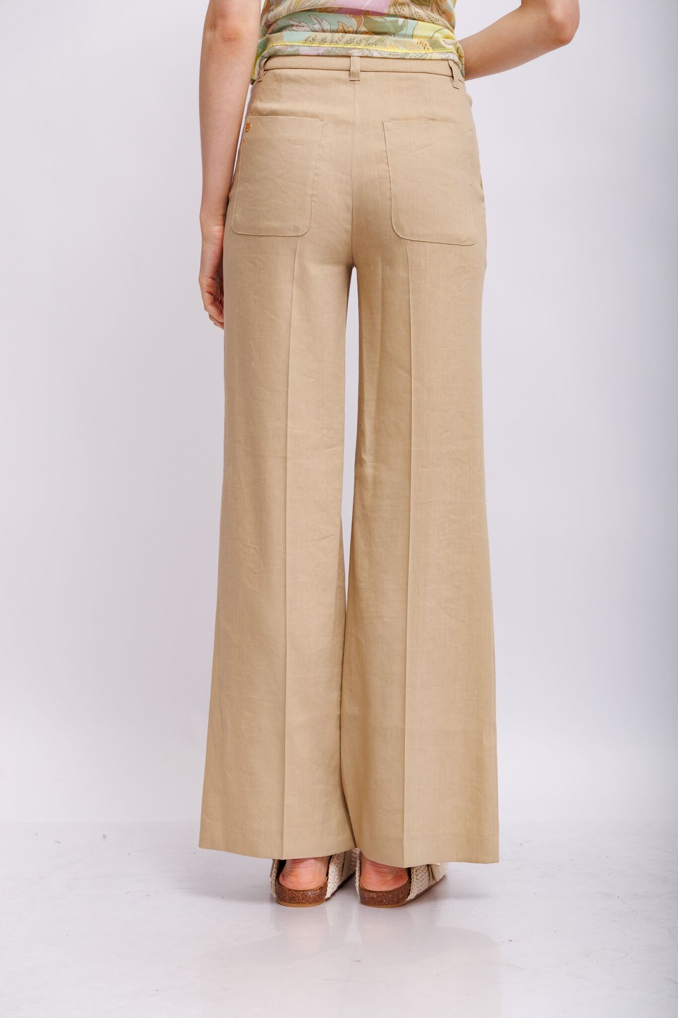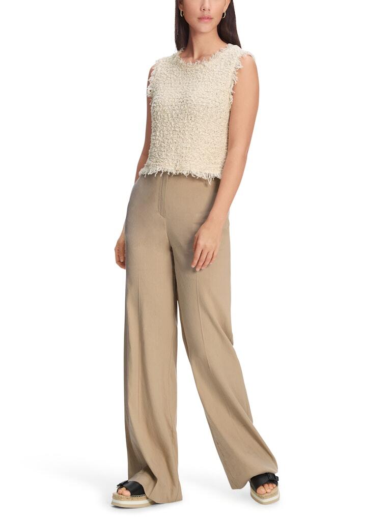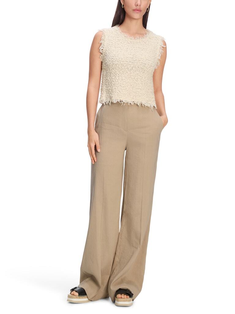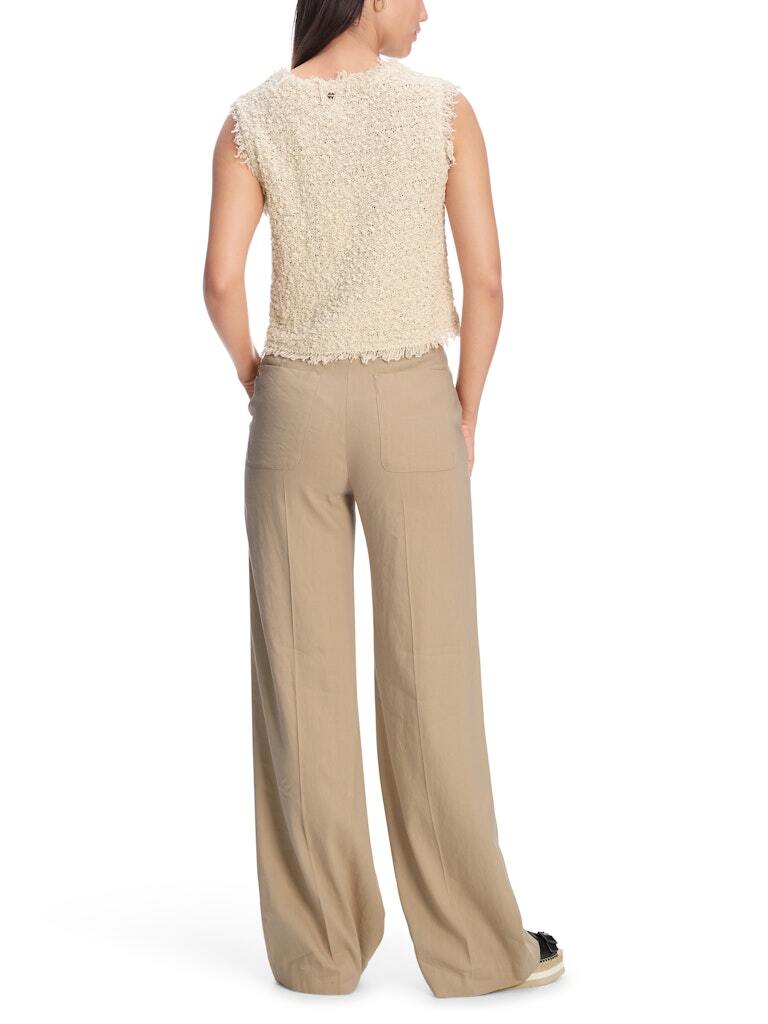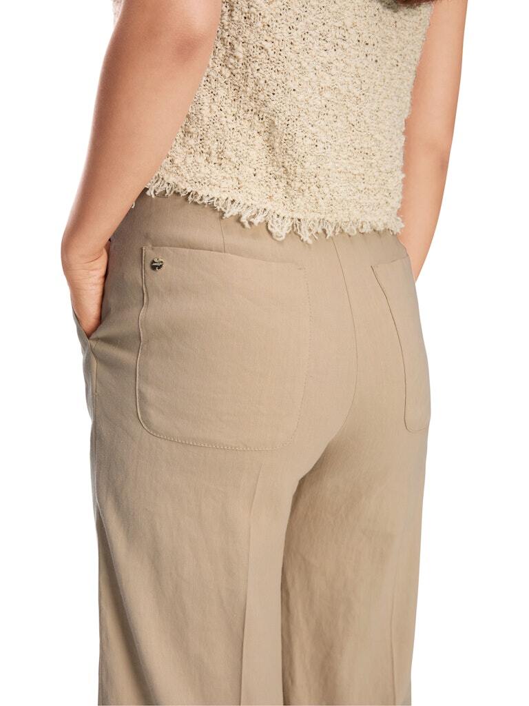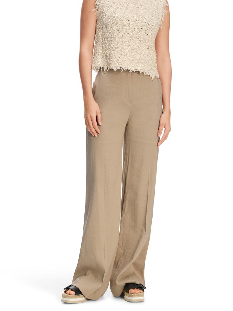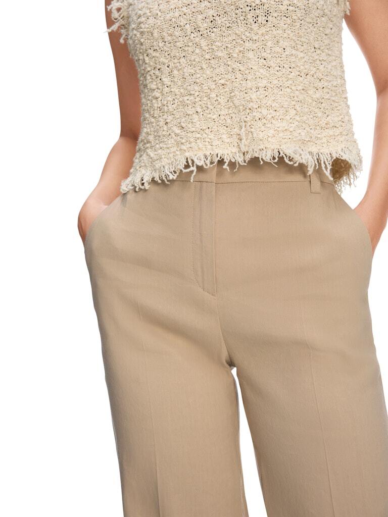 WAUKEE — это классный летний компаньон. Эти брюки имеют широкий крой и удлиненные штанины. Пояс высокий и застегивается на молнию и крючок. Пришитые задние карманы и боковые прорезные карманы подчеркивают стиль. Эти брюки также выделяются своей легкой смесью льна и вискозы.
