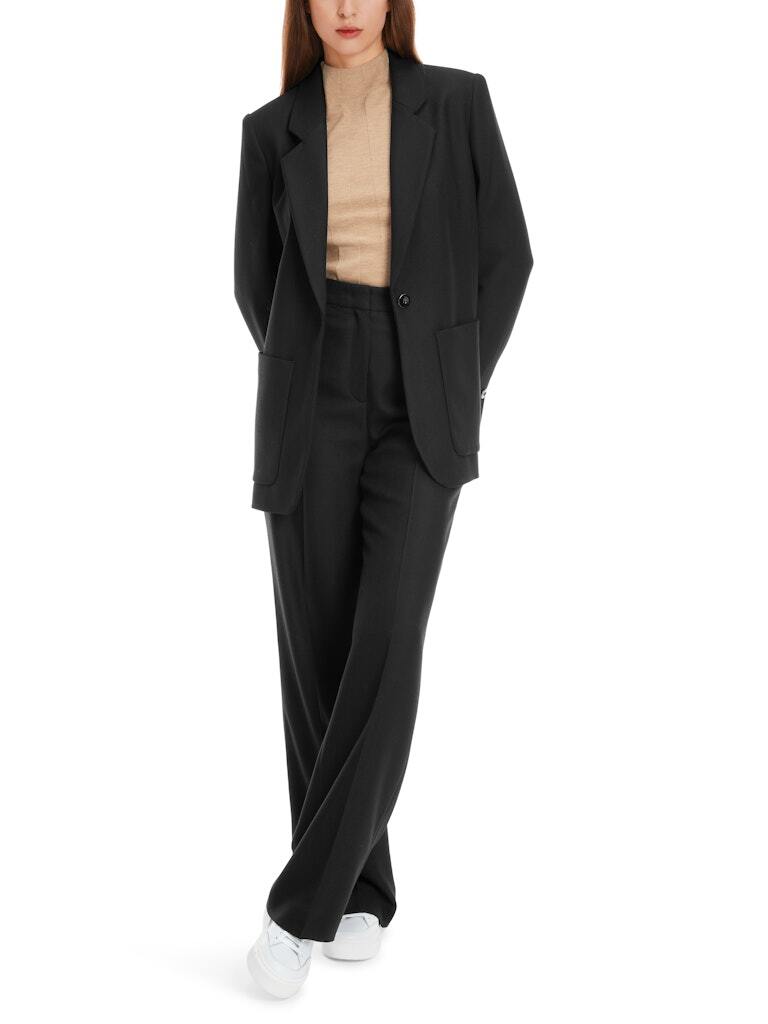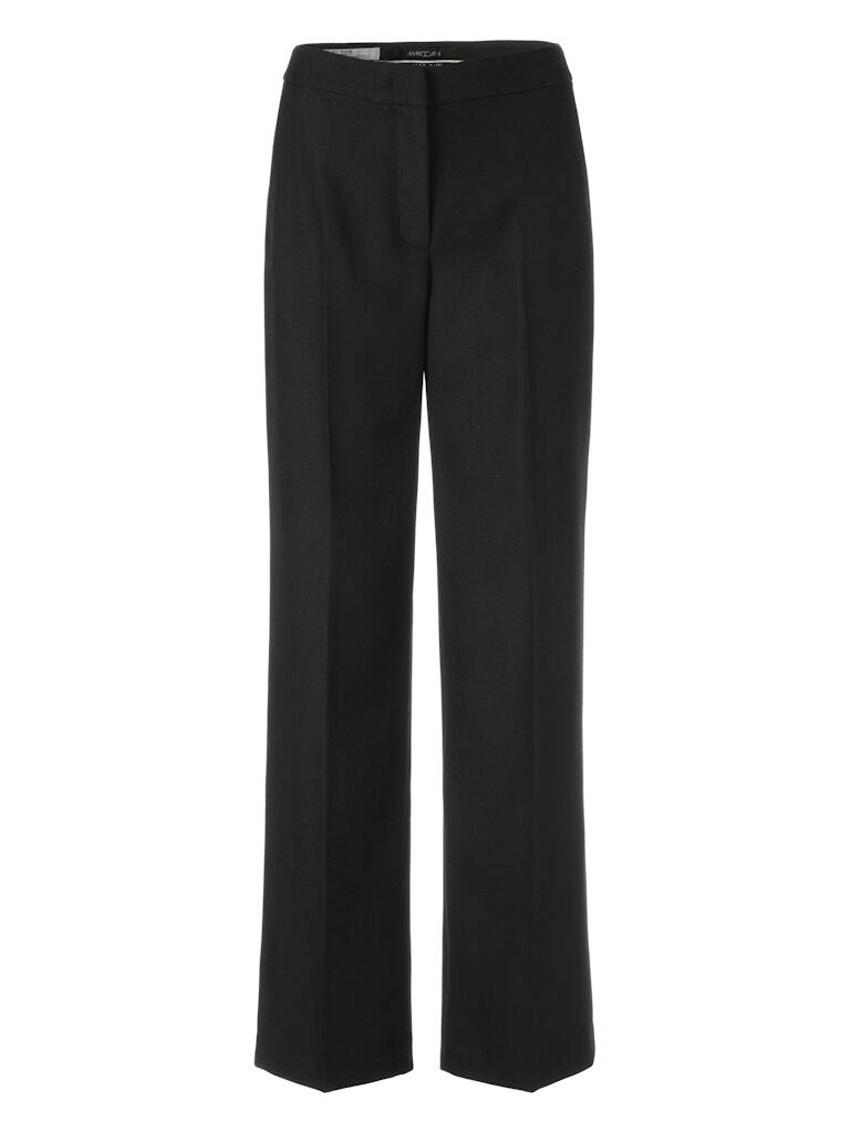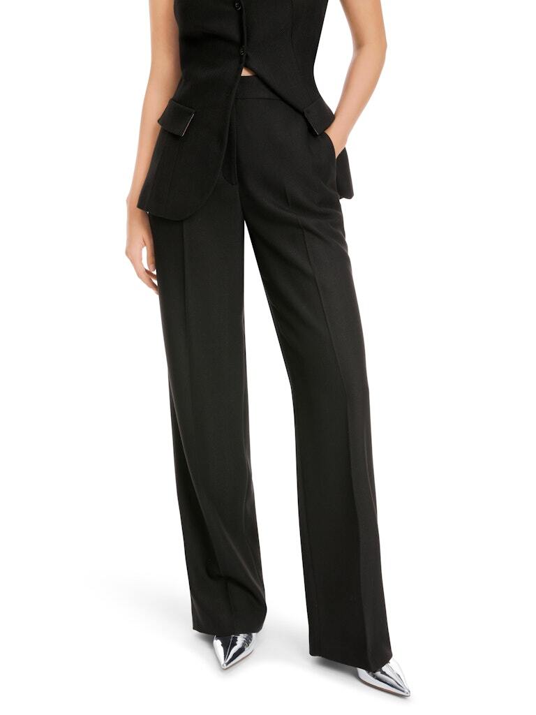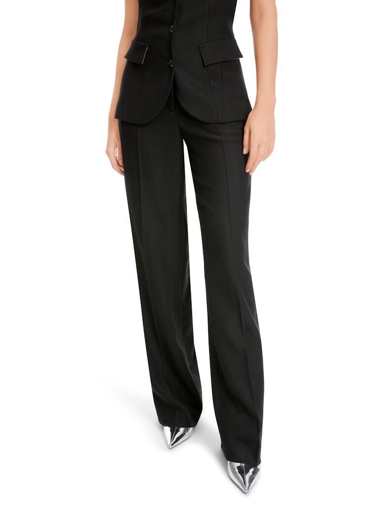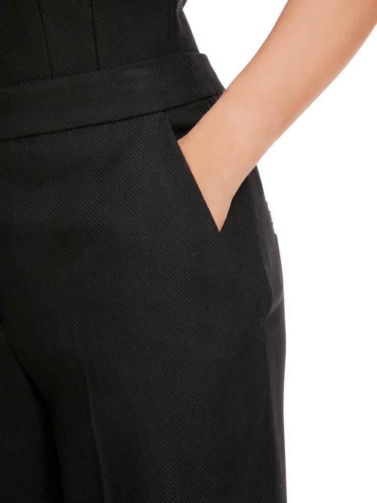 Модель WUKARI выполнена из мягкой струящейся смеси волокон с вискозой. Ткань представляет собой современную интерпретацию узора «елочка». Модное сочетание высокой талии и удлиненных брючин. Форма прямая и подчеркнута складками