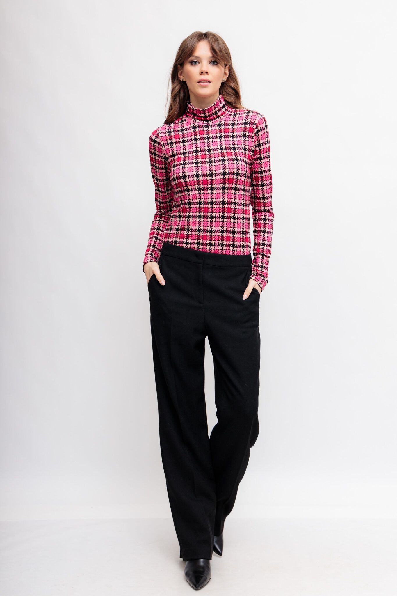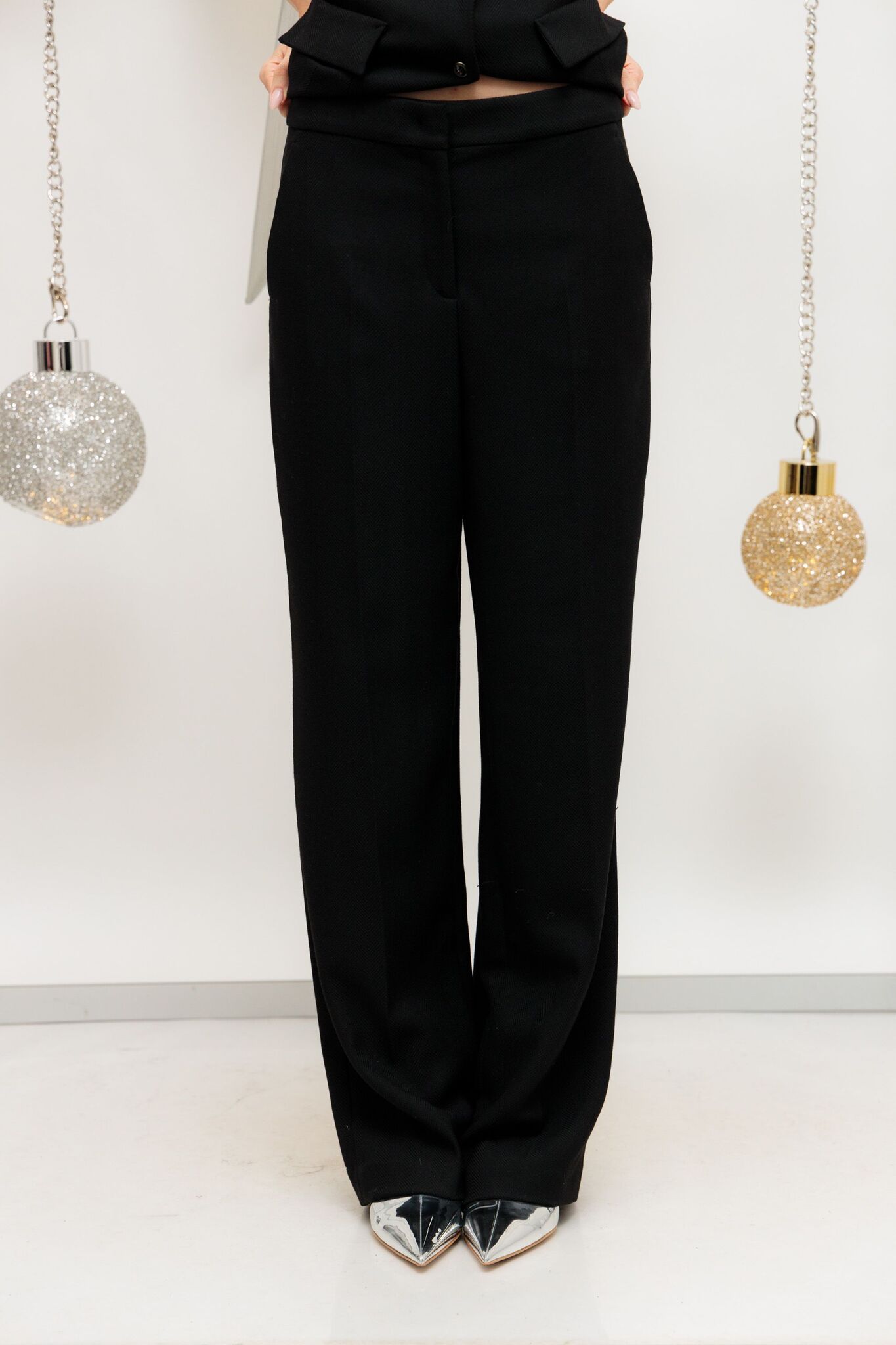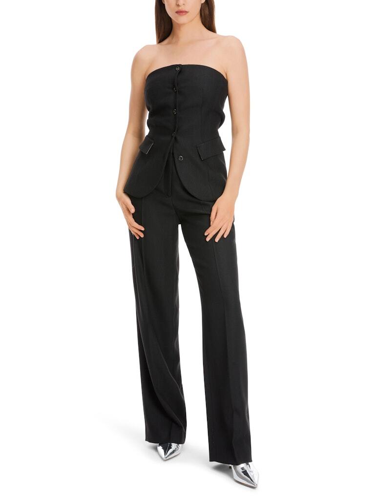 Модель WUKARI выполнена из мягкой струящейся смеси волокон с вискозой. Ткань представляет собой современную интерпретацию узора «елочка». Модное сочетание высокой талии и удлиненных брючин. Форма прямая и подчеркнута складками
