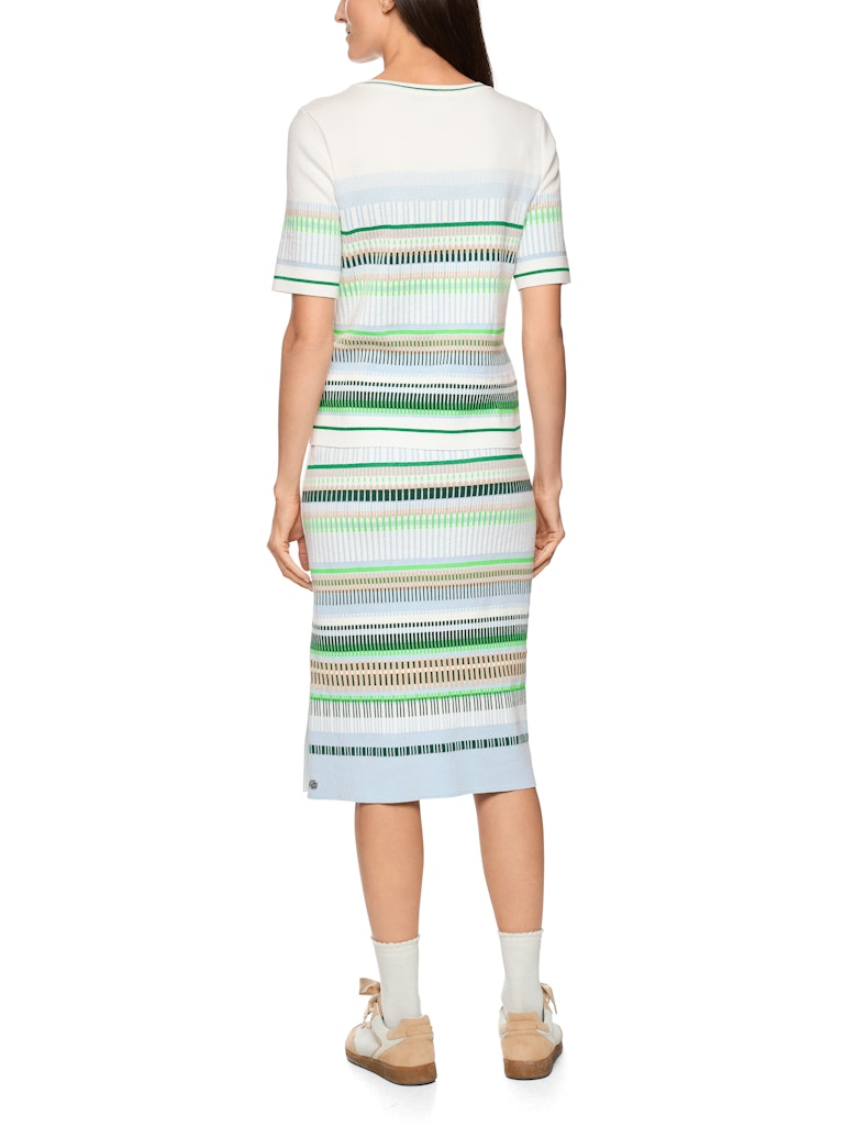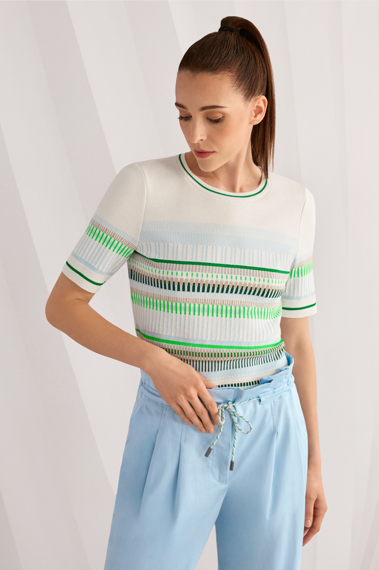 Узкий джемпер из мягкой хлопковой смеси с элегантным жаккардовым узором. Классический круглый вырез и короткие рукава придают изделию женственную легкость. Изделие изготовлено в Германии: пряжа вяжется на современных вязальных машинах, а отделка материалов производится в Германии.